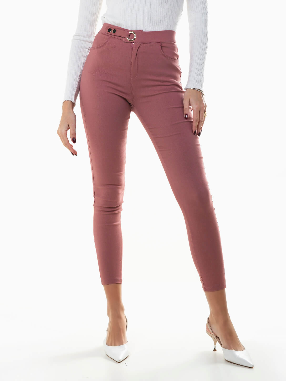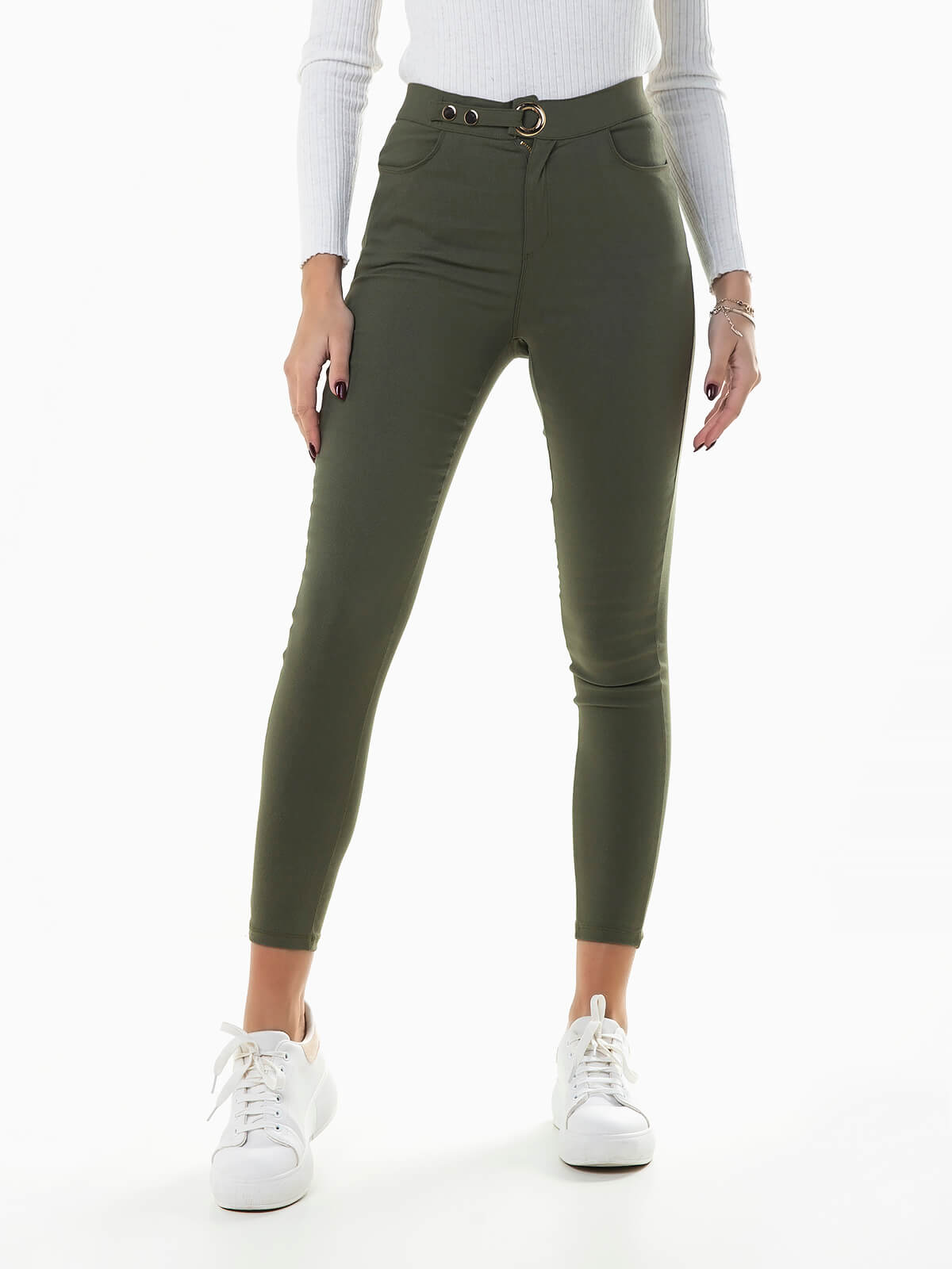 Calças elásticas de cintura alta para senhora. 4 bolsos. Aperto de fecho éclair e fivela com botões de pressão.