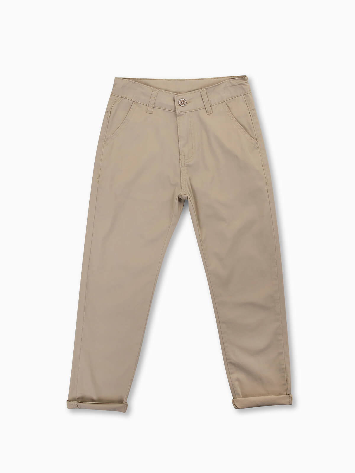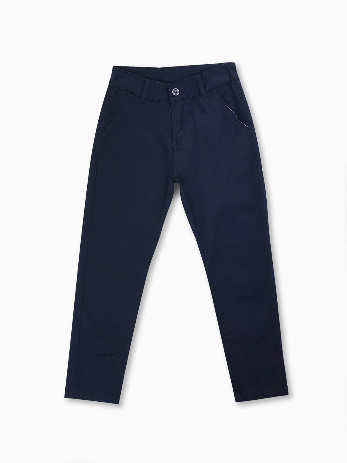 Calças elásticas de sarja para menino. Calças com dois bolsos cortados. Cintura com ajustador no interior. Aperto fecho zíper e botão.