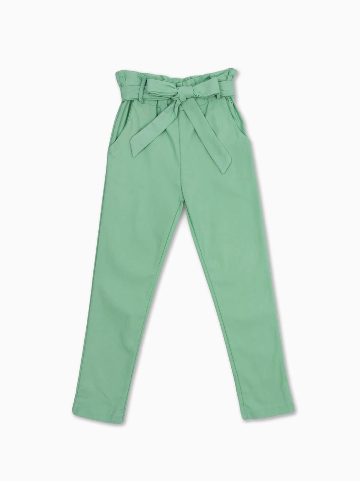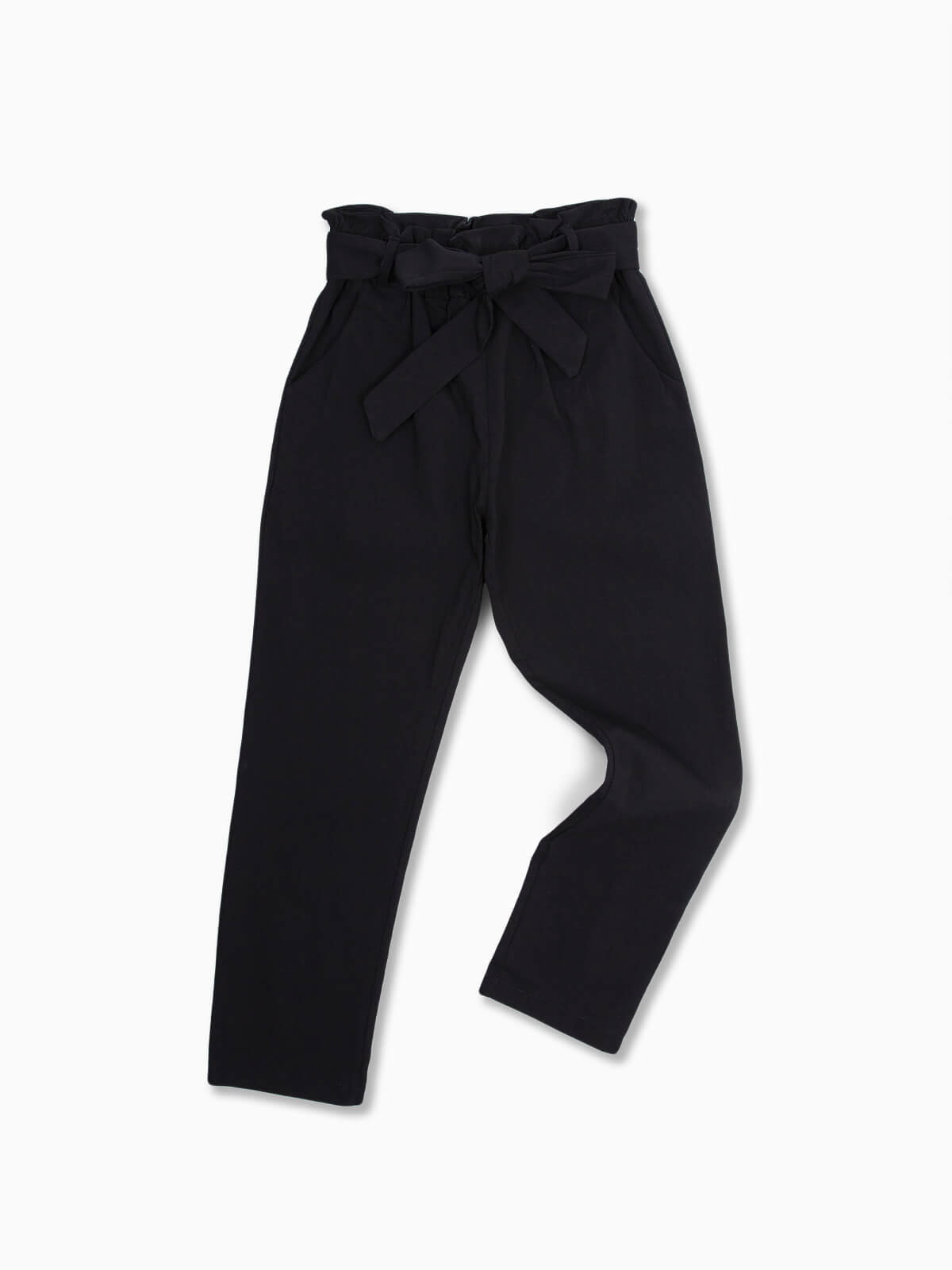 Calças elásticas com cintura paperbag e cinto no mesmo tecido para laço. Calças para menina com 2 bolsos laterais.