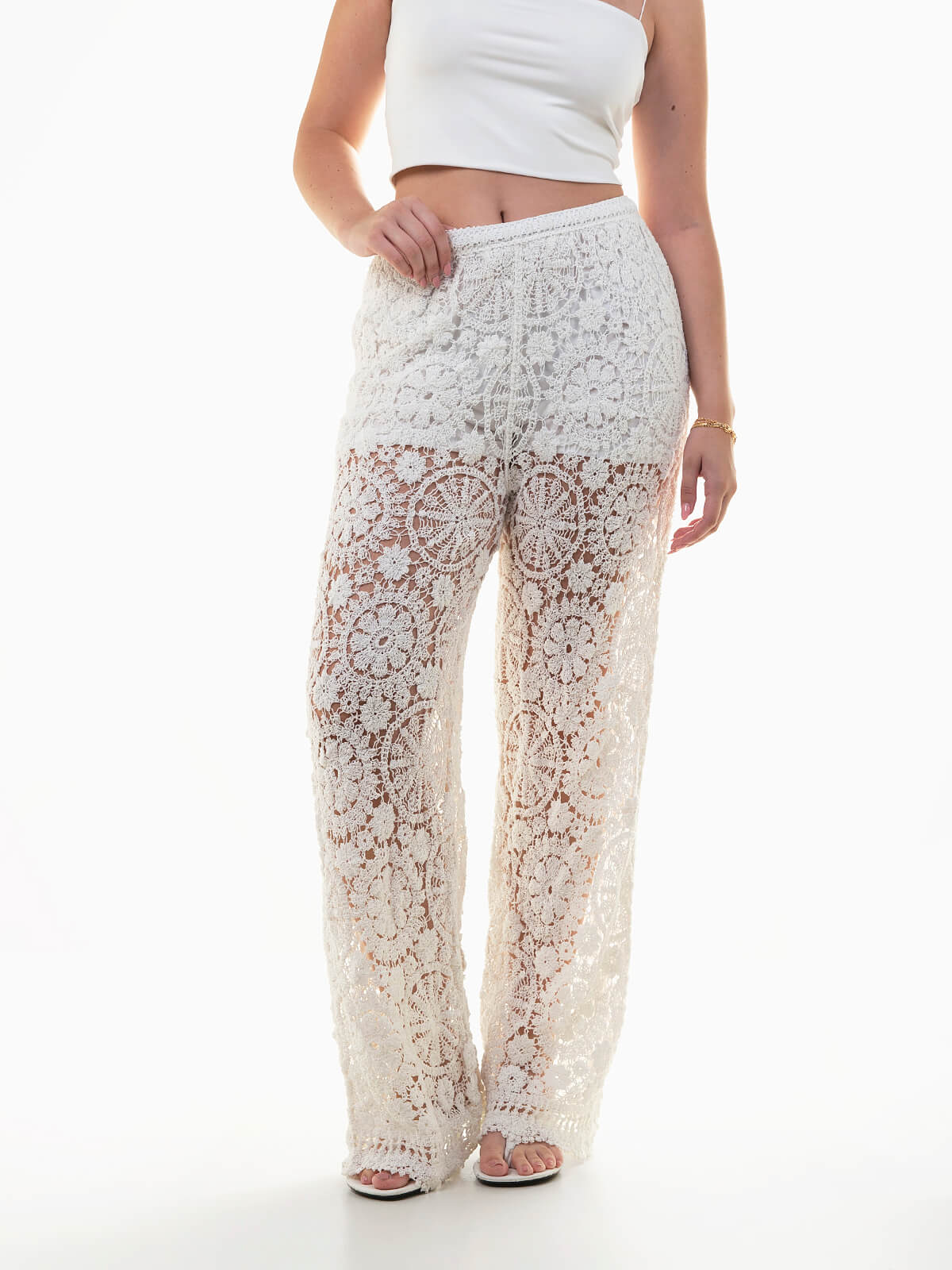 Calças em crochet 100% algodão, com corte direito e cintura alta. Com forro tipo calção, garantem conforto e cobertura. Um modelo com textura e presença, ideal para looks de verão com um toque boho e descontraído.