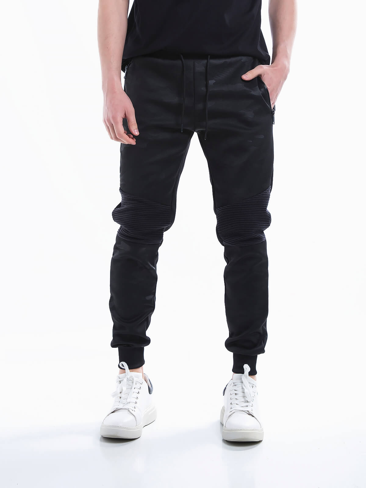 Calças de fato de treino com estampado camuflado à cor. Calças desportivas de cintura elástica com cordão. Bolsos laterais com fecho. Punhos elásticos.