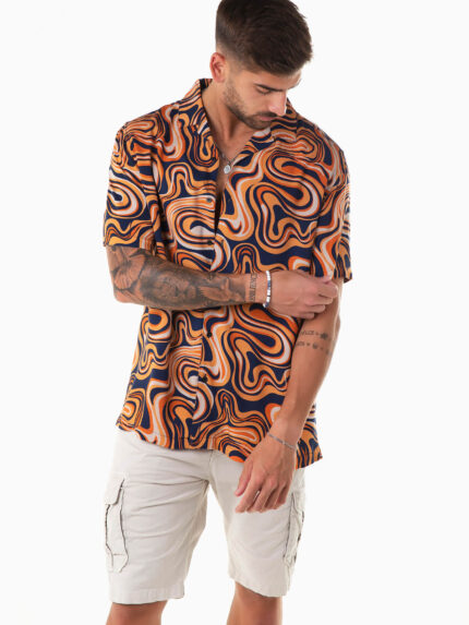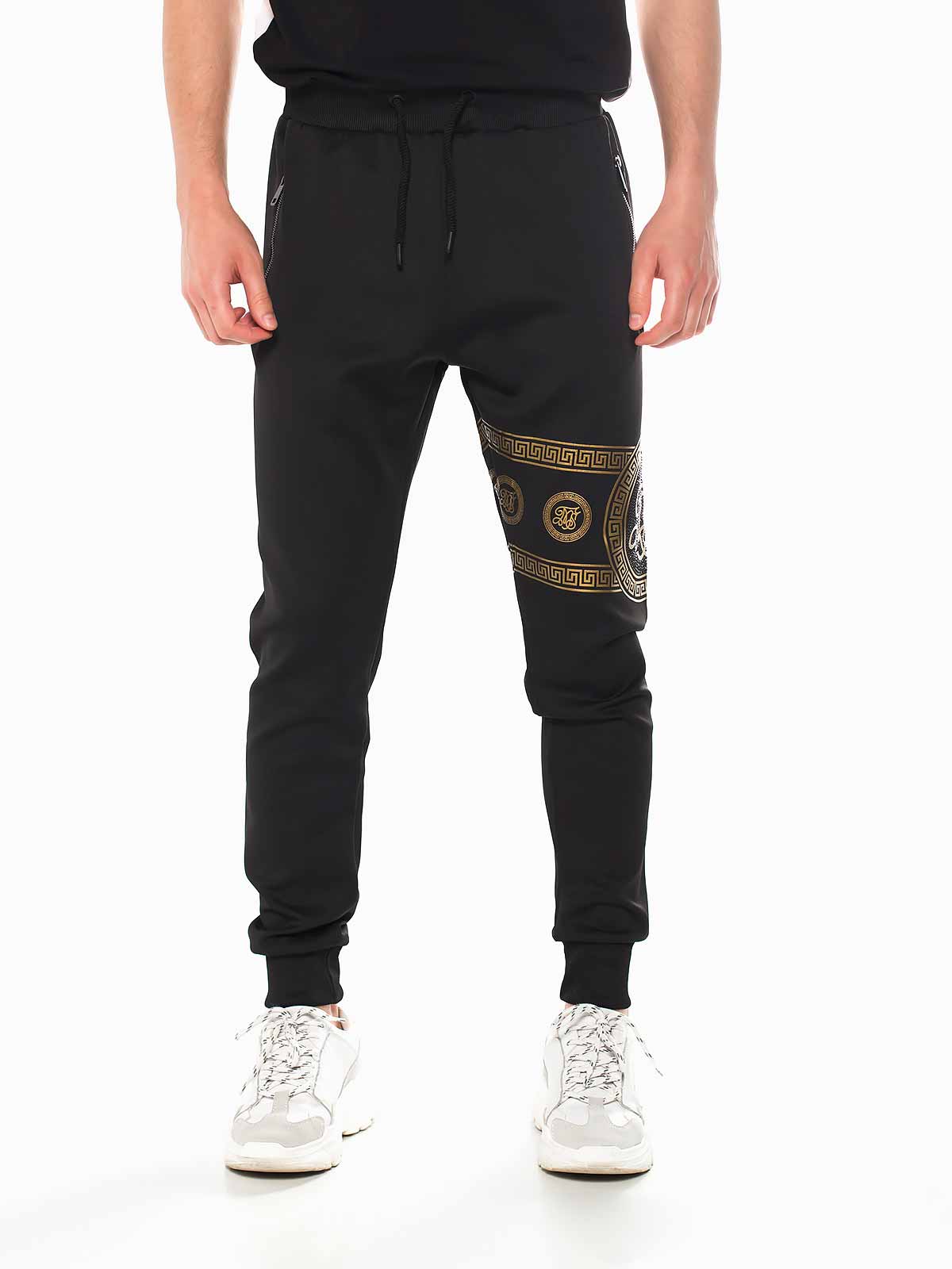 Calças de fato de treino lisas com perna esquerda estampada com brilhantes. Calças desportivas com punhos e cintura elástica com cordão. Bolsos laterais com fecho.