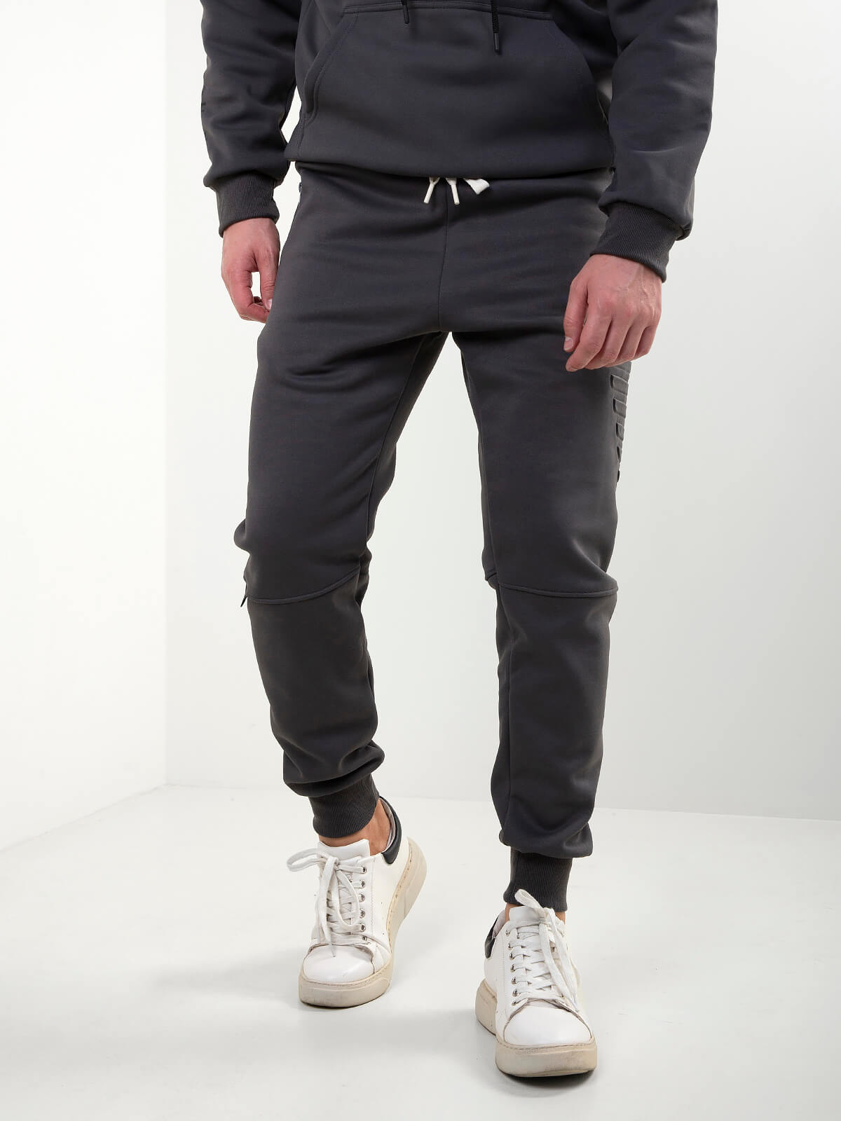 Calças de treino em tecido acetato, com cintura elástica e cordão ajustável. Modelo jogger com bolsos laterais com fecho e detalhe em relevo no bolso traseiro. Combina com a sweatshirt básica para um conjunto completo.