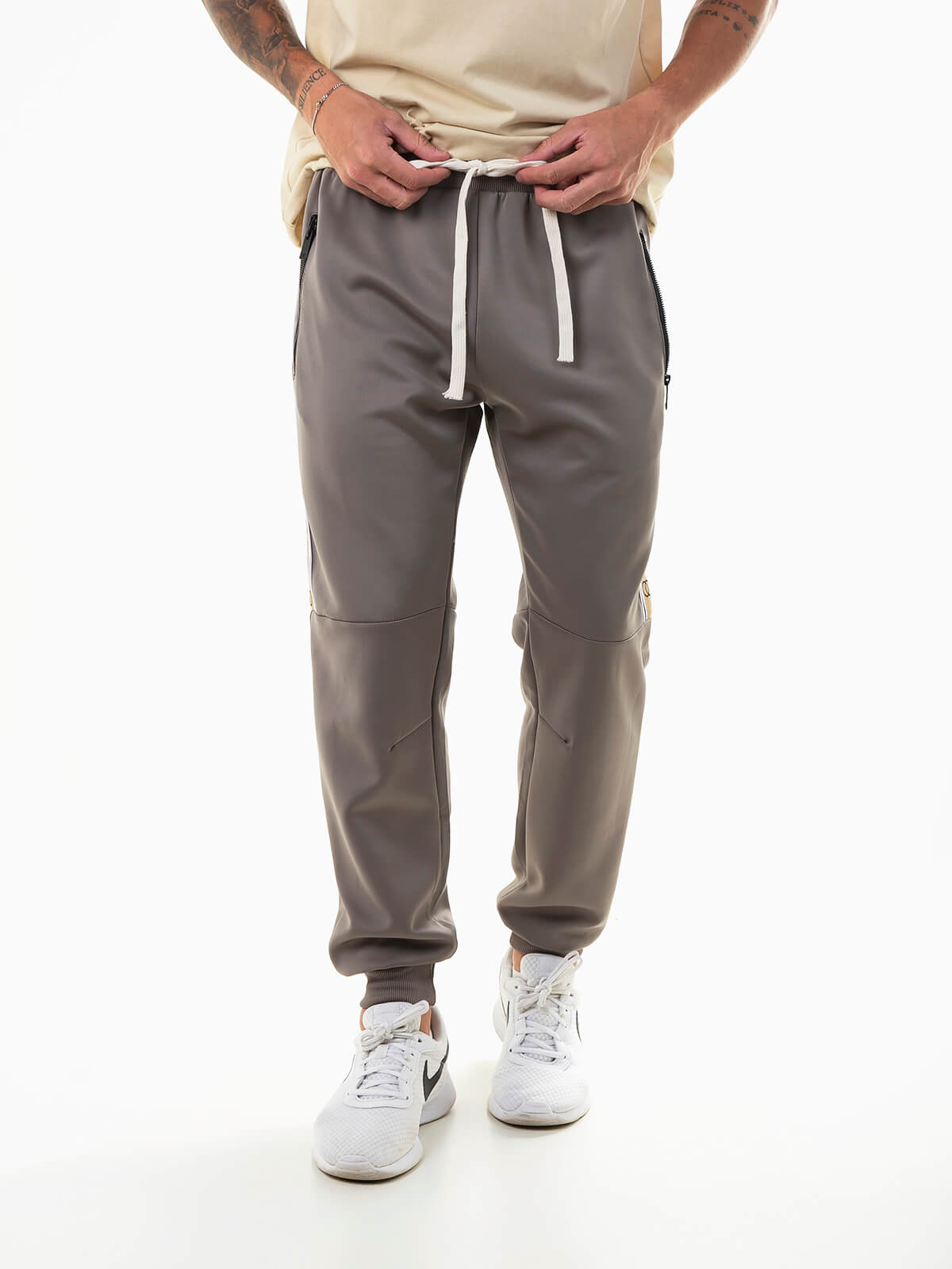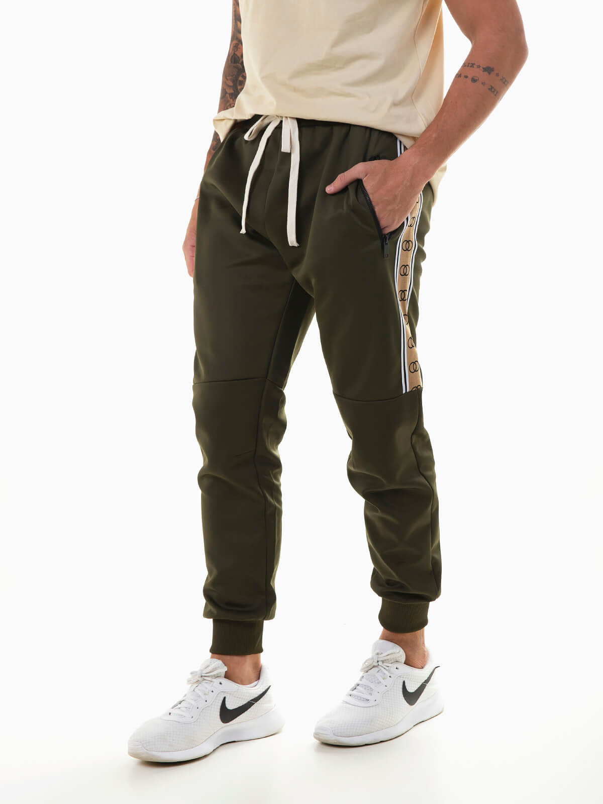 Calças de fato treino com bandas laterais em contraste. Joggers com cordão para ajustar na cintura e acabamentos canelados. 2 bolsos com zíper.