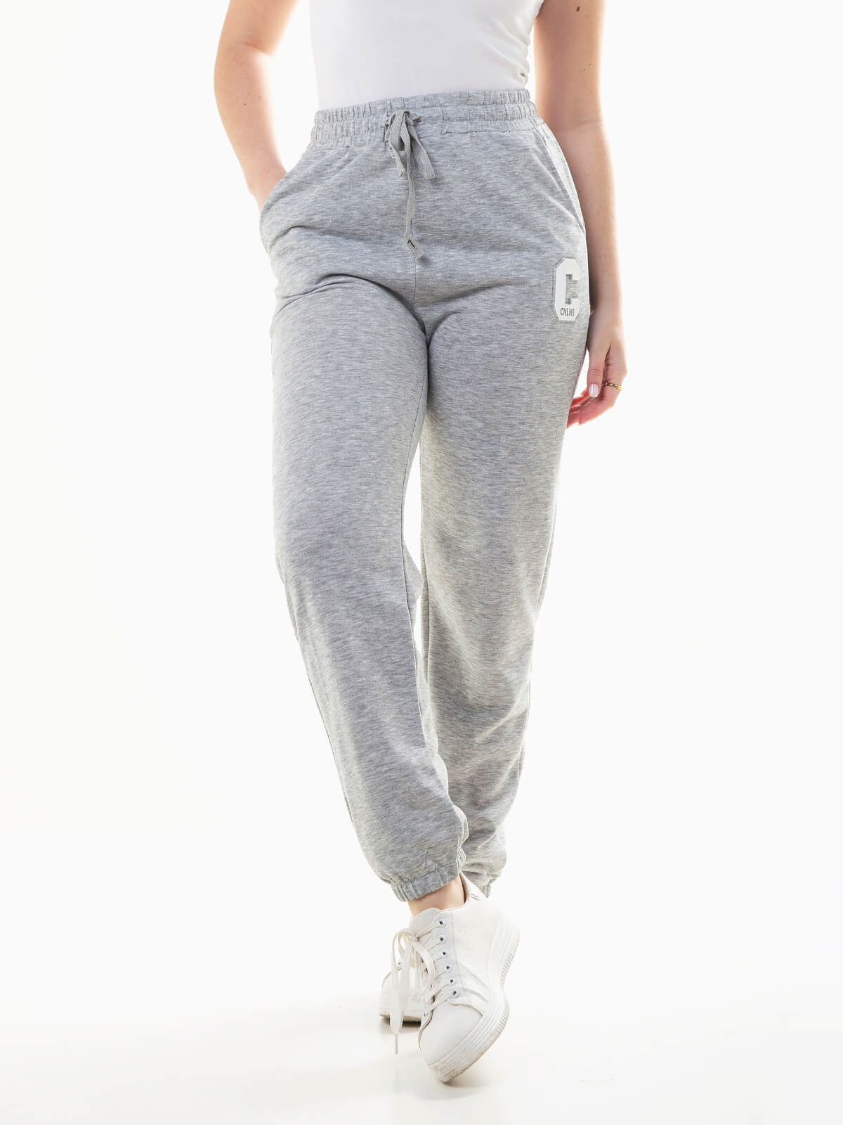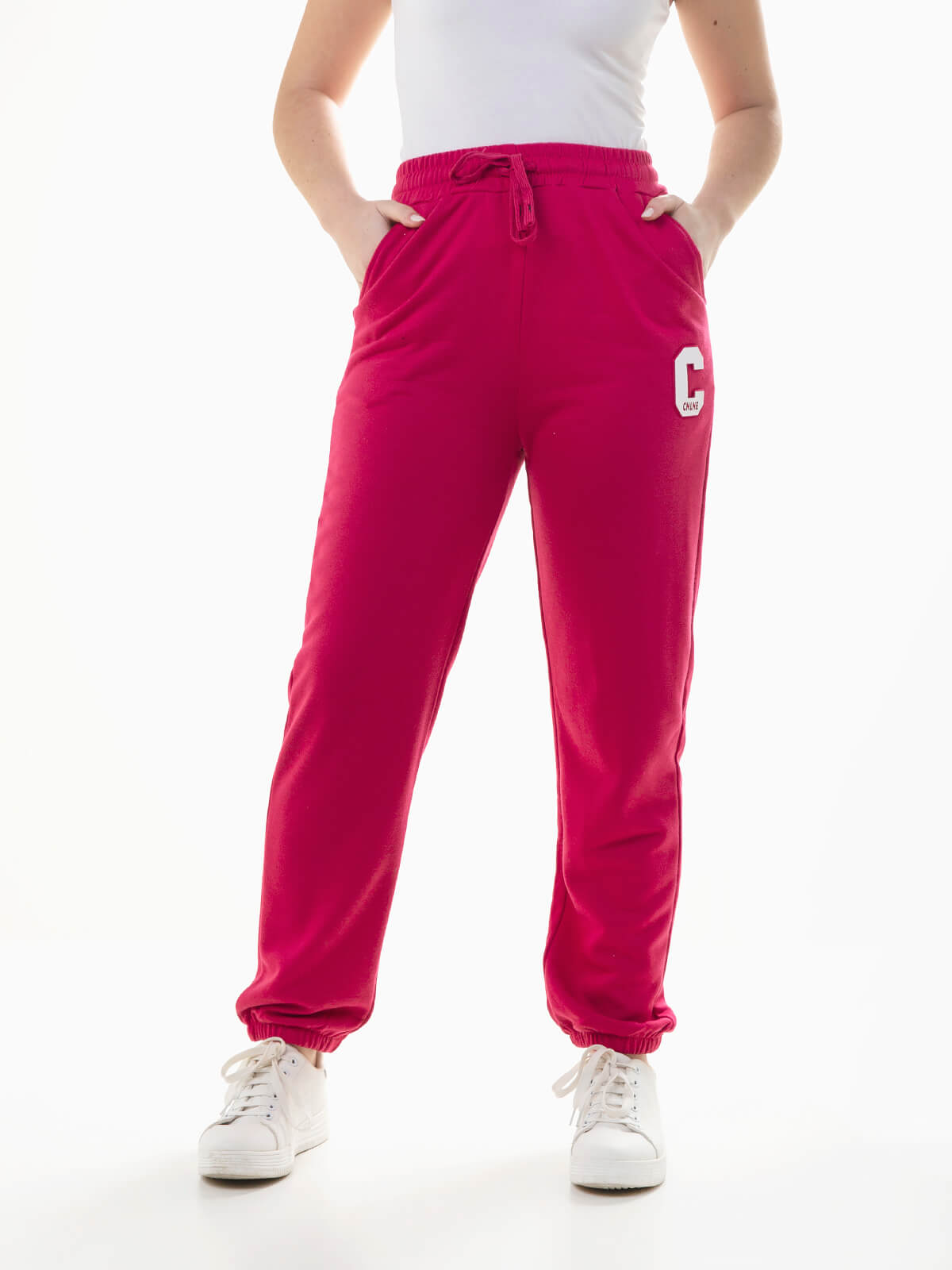 Calças fato treino com letra saliente bordada. Calças jogger de felpa com cintura alta elástica e cordão para ajustar. 2 bolsos.