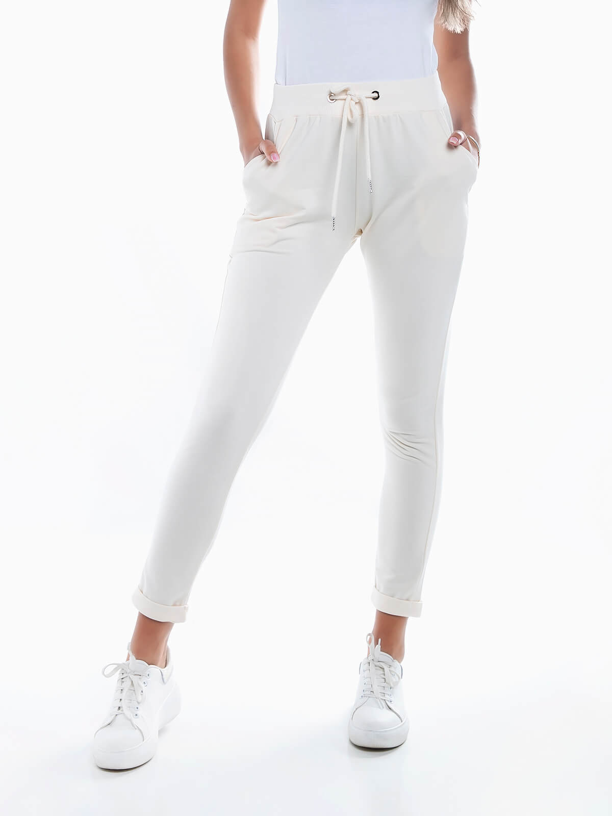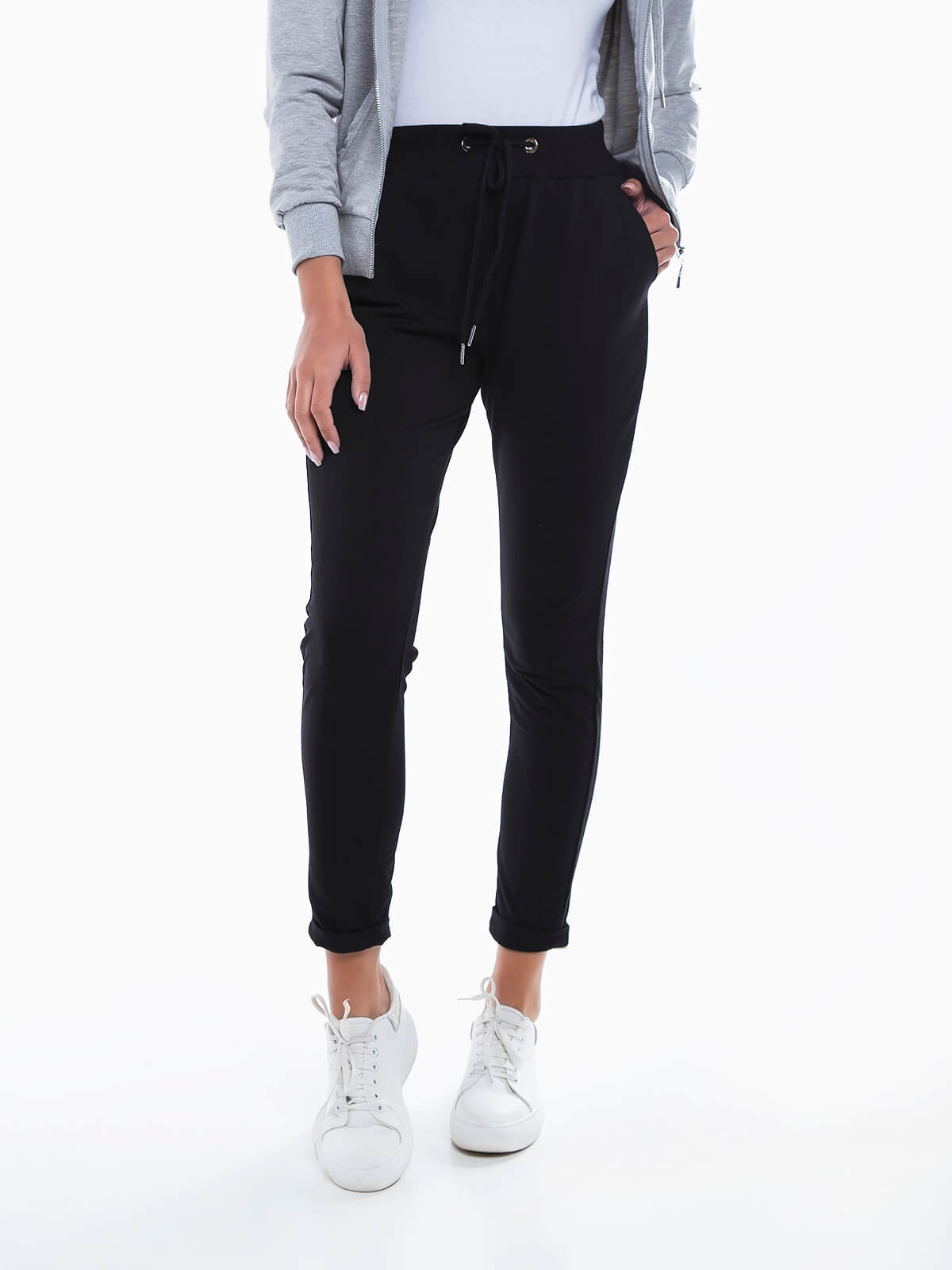 Calças de fato de treino com cintura alta para senhora. Calças desportivas com cordão na cintura para ajustar. Punhos com dobra. 2 bolsos.