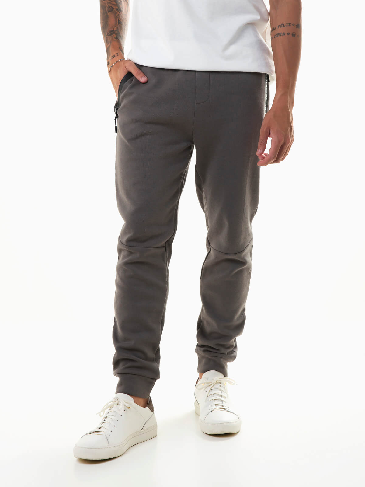 Calças fato treino cinza escuro para homem. Calças jogger felpa com 2 bolsos laterais e 1 na parte posterior oculto na costura. Cordão na cintura para ajustar.