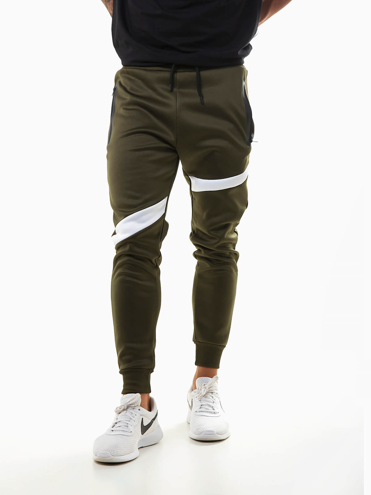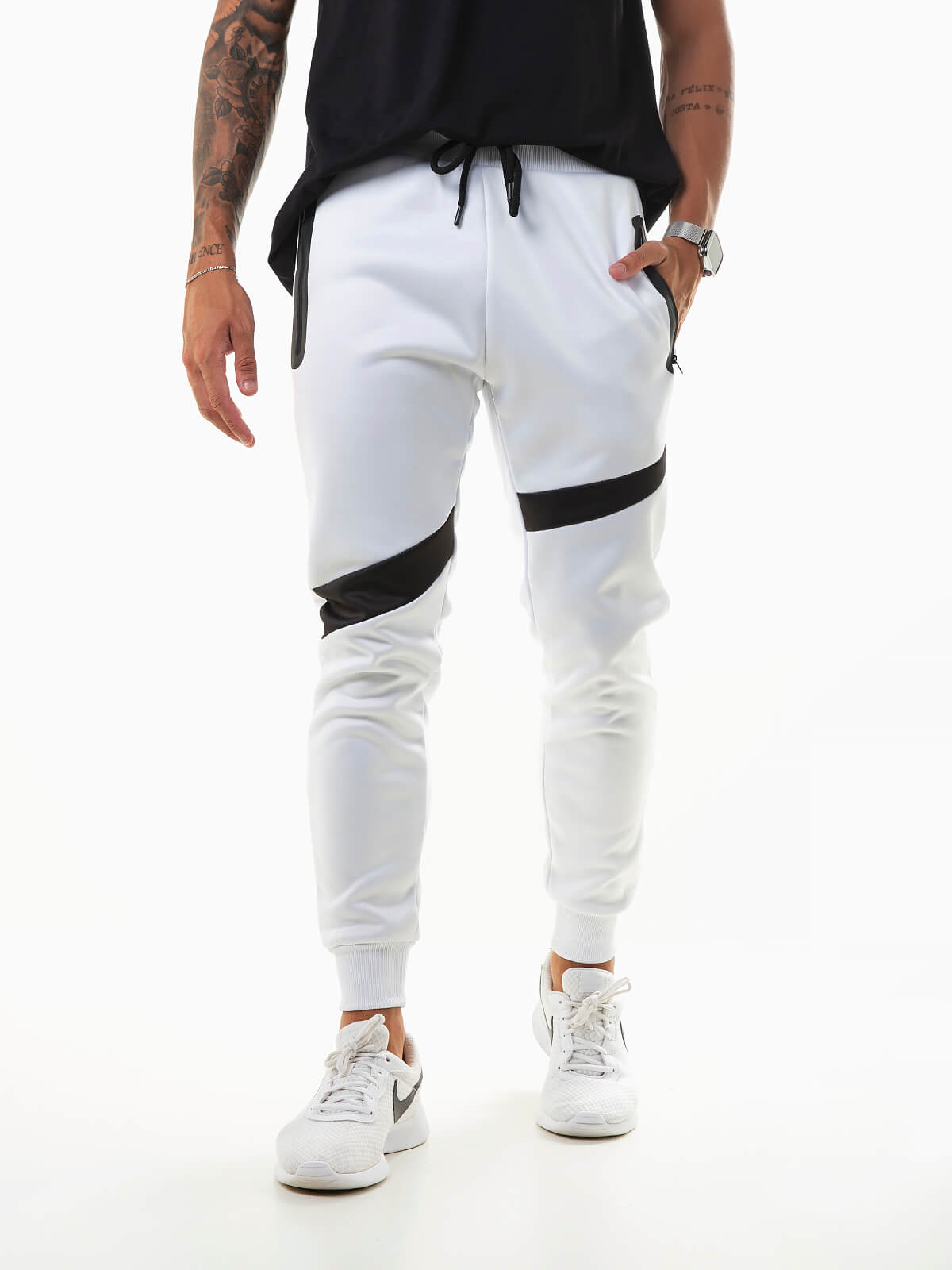 Calças fato de treino com color block em tecido acetato. Calças desportivas para homem com cordão na cintura para ajustar e 2 bolsos. Interior cardado.