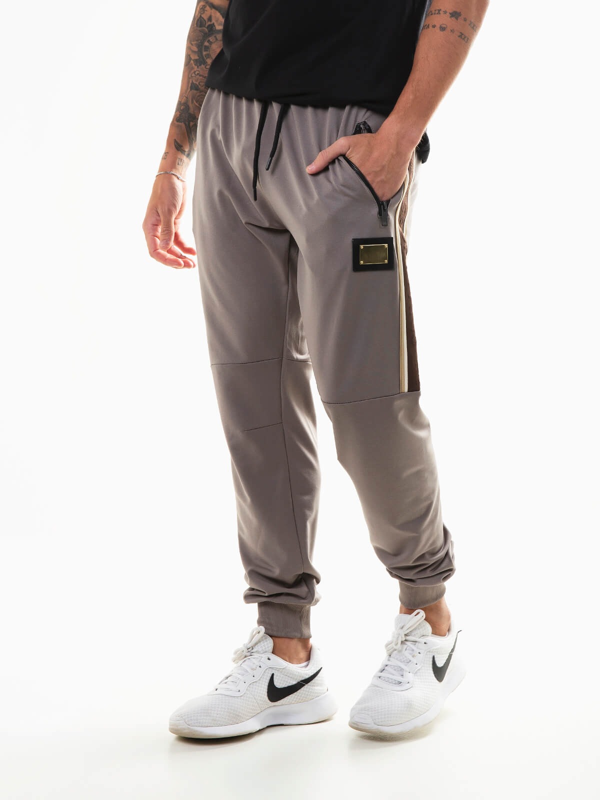 Calças de fato treino com aplicação de tacha brilhante e pormenores bordados. Calças para homem com cintura elástica e cordão para ajustar. 2 bolsos com zíper.