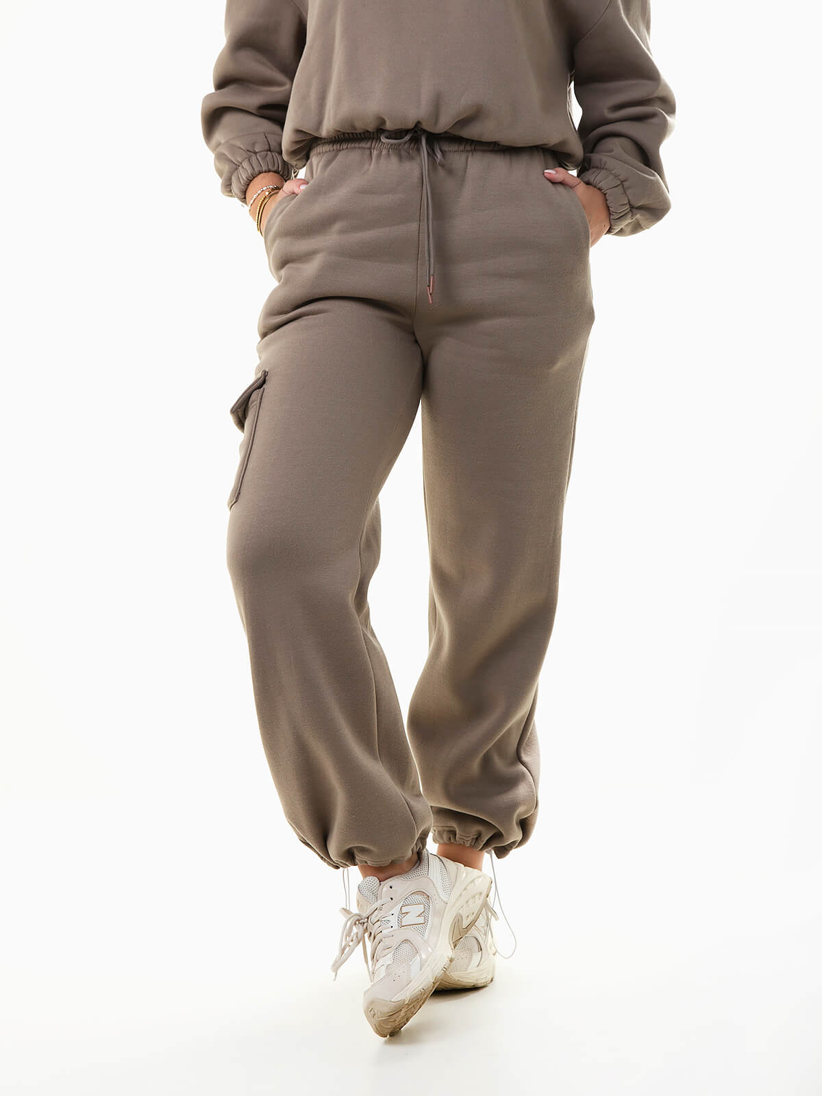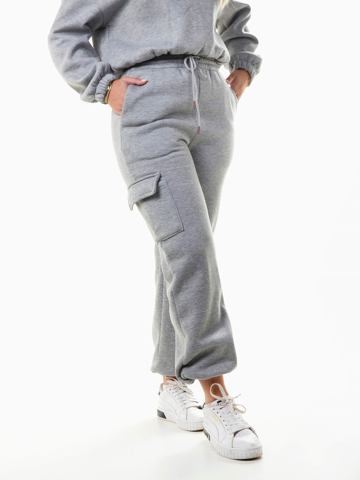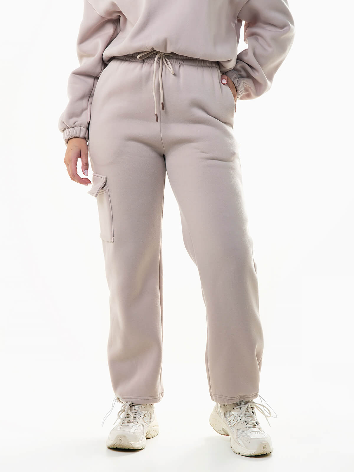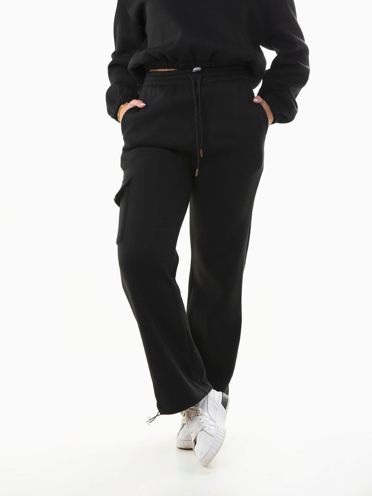 Calças fato de treino com dois bolsos laterais e 1 com aba. Calças de cintura alta com elástico nos punhos para ajustar. Interior cardado.