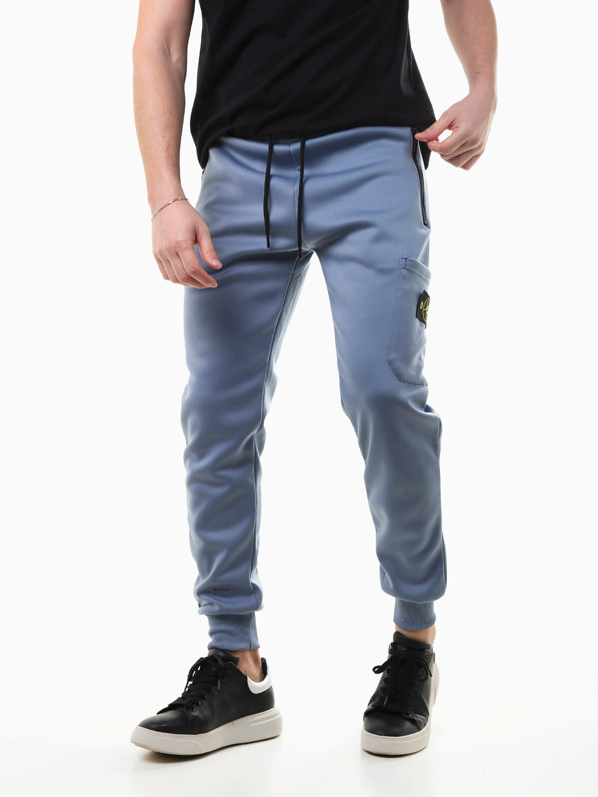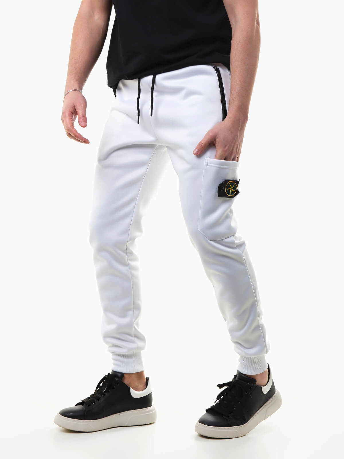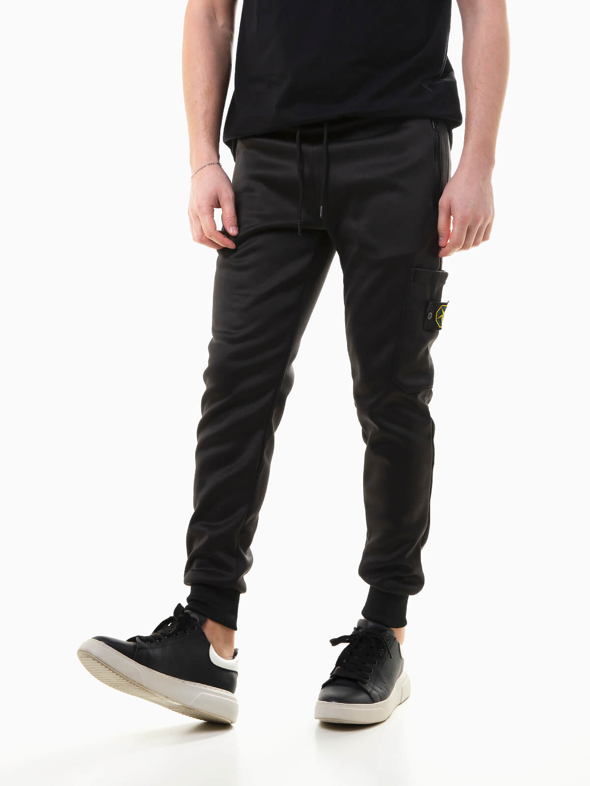 Calças de fato treino com 2 bolsos laterais e 1 com etiqueta bordada. Calças jogger com cordão para ajustar. Interior cardado.