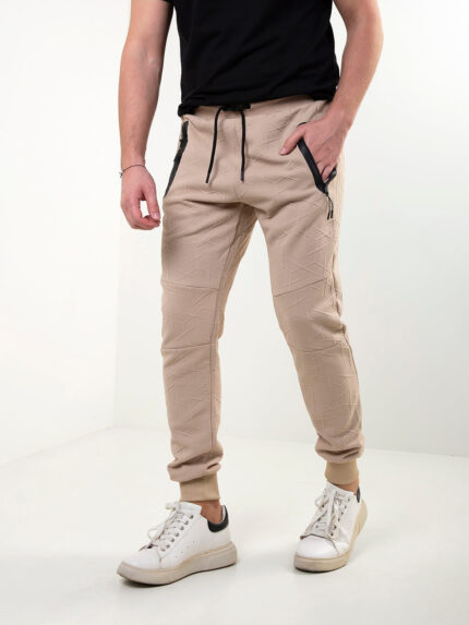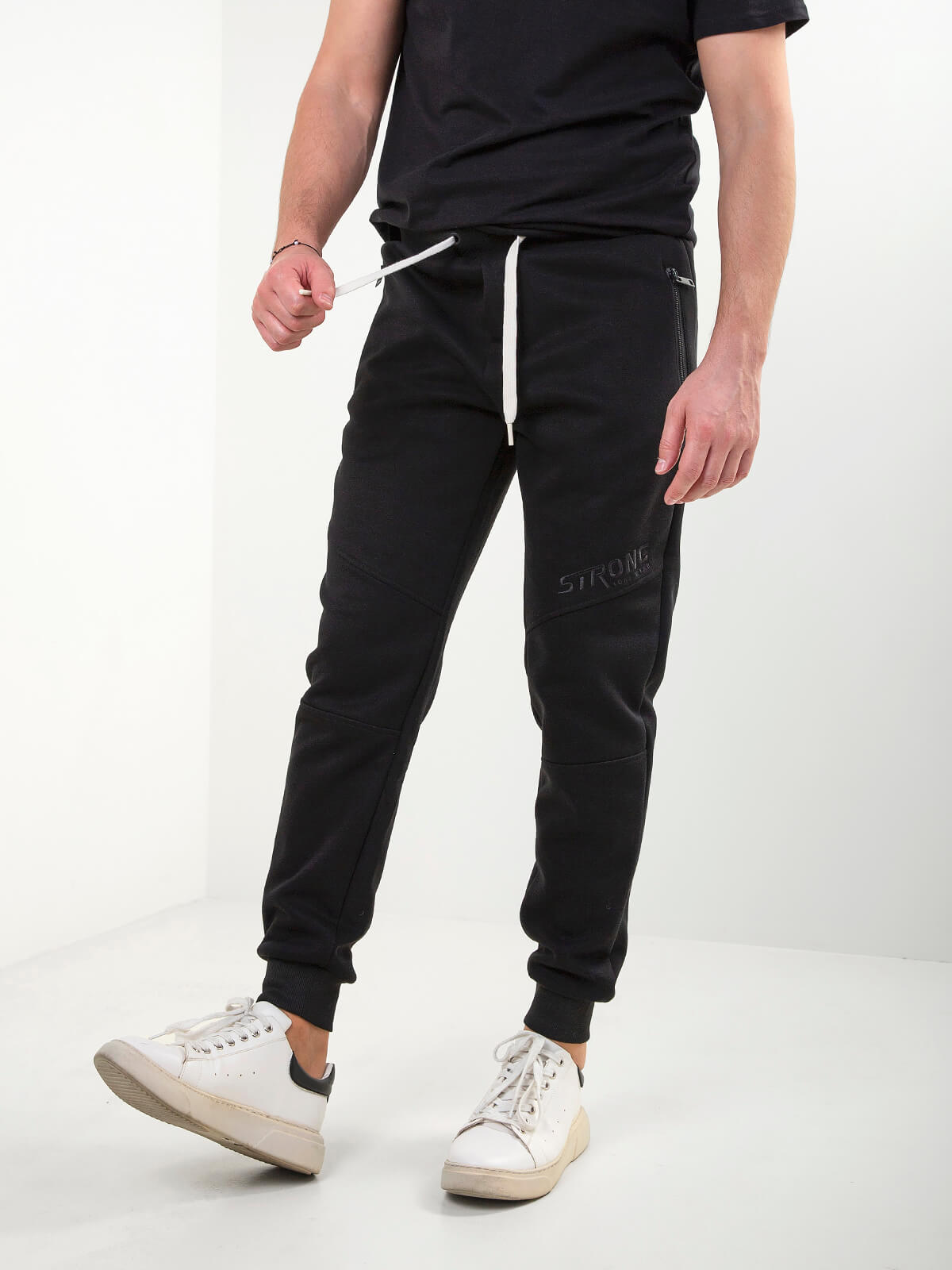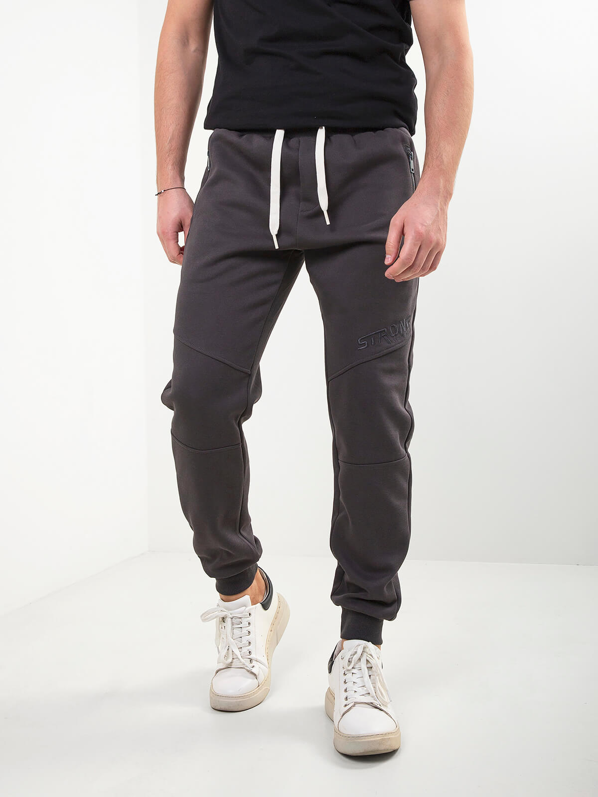 Calças de treino para homem em malha felpa suave, com interior cardado para mais conforto térmico. Modelo com cintura elástica e cordão ajustável, joelhos com recorte, dois bolsos laterais com fecho e bolso traseiro. Modelo jogger.