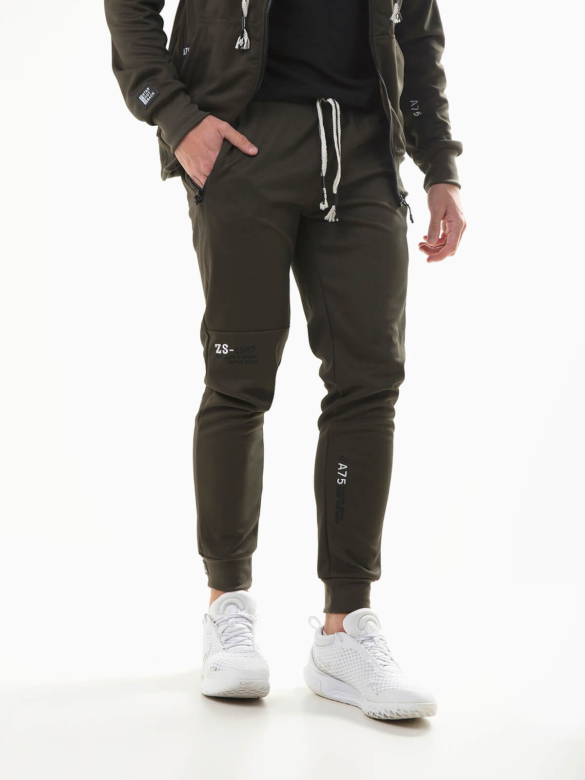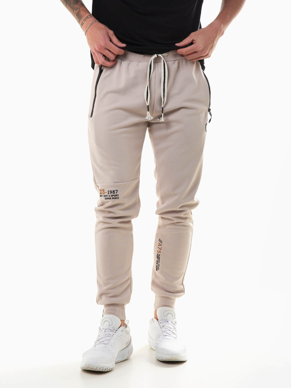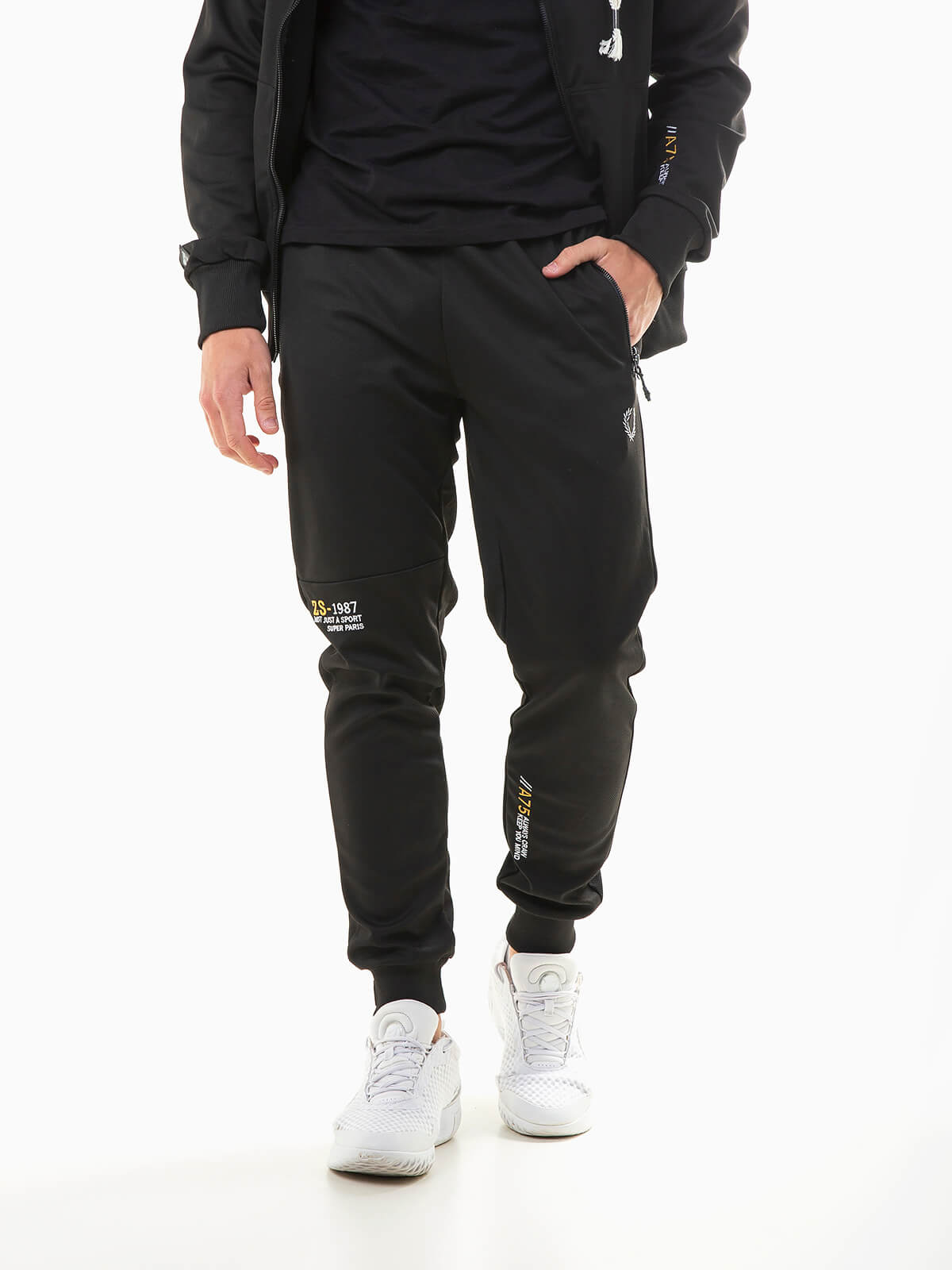 Calças de fato treino com pormenores bordados e símbolo. Calças jogger com cintura e punhos elásticos. Cordão para ajustar. 2 bolsos com zíper.