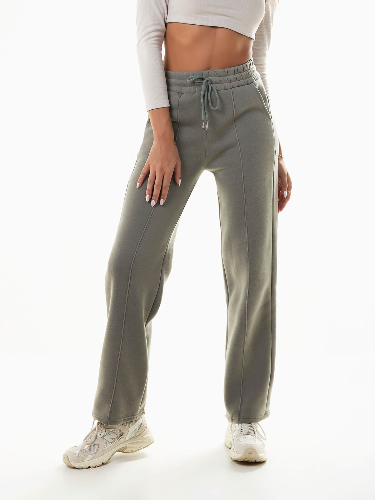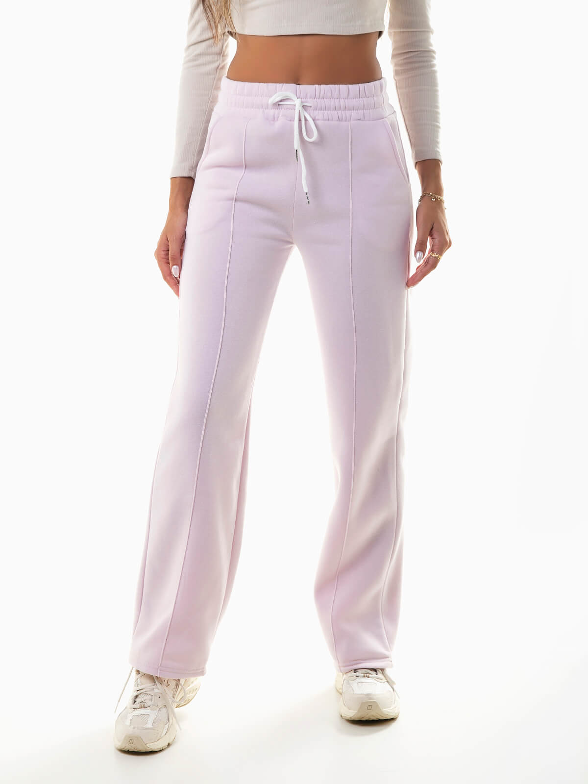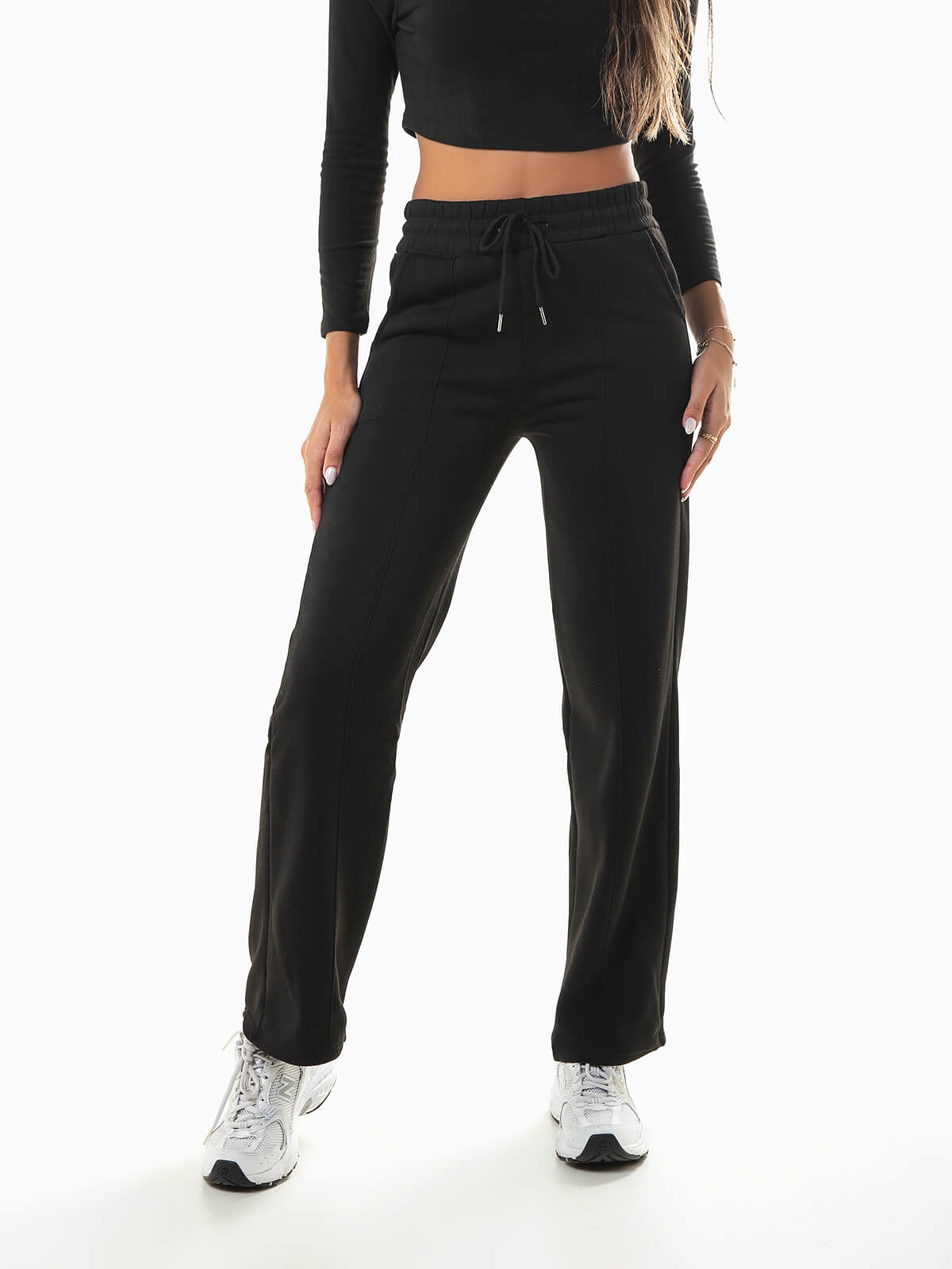Calças fato de treino para mulher com costuras reforçadas à frente. Calças de cintura alta elástica com cordão para ajustar. Interior cardado. 2 bolsos.