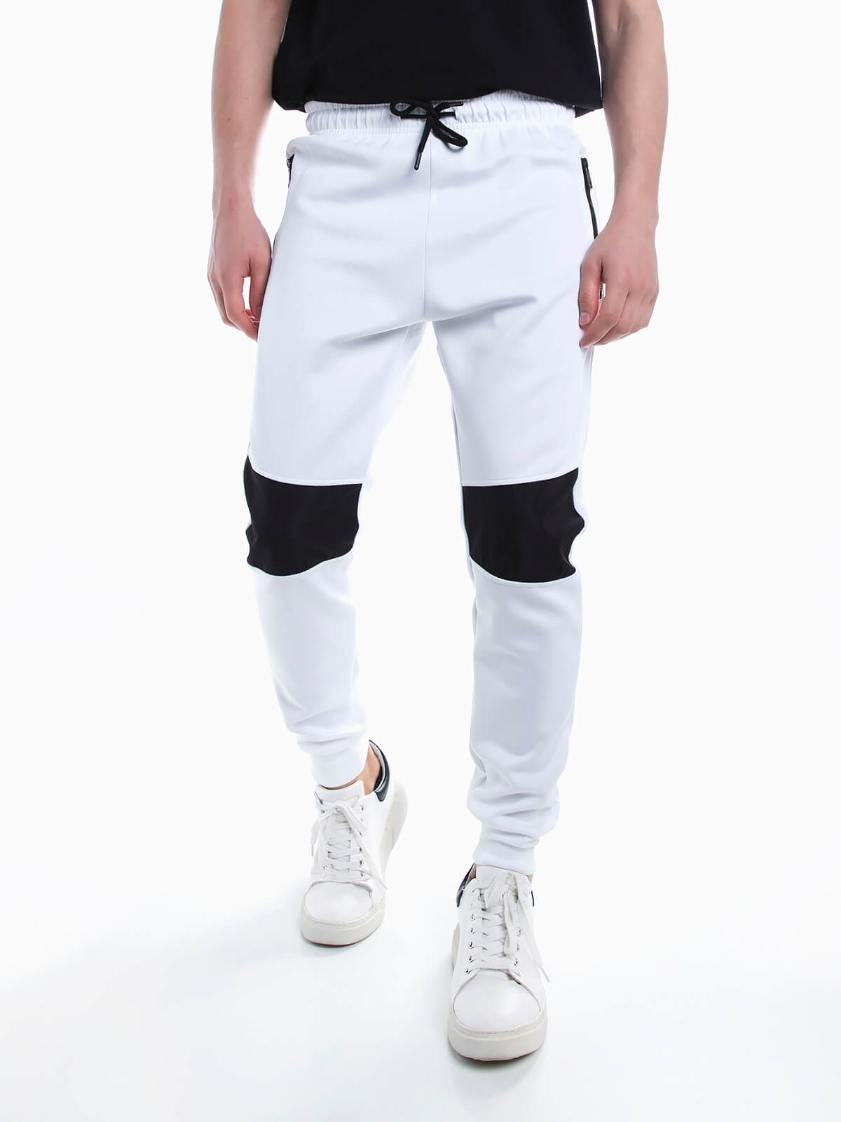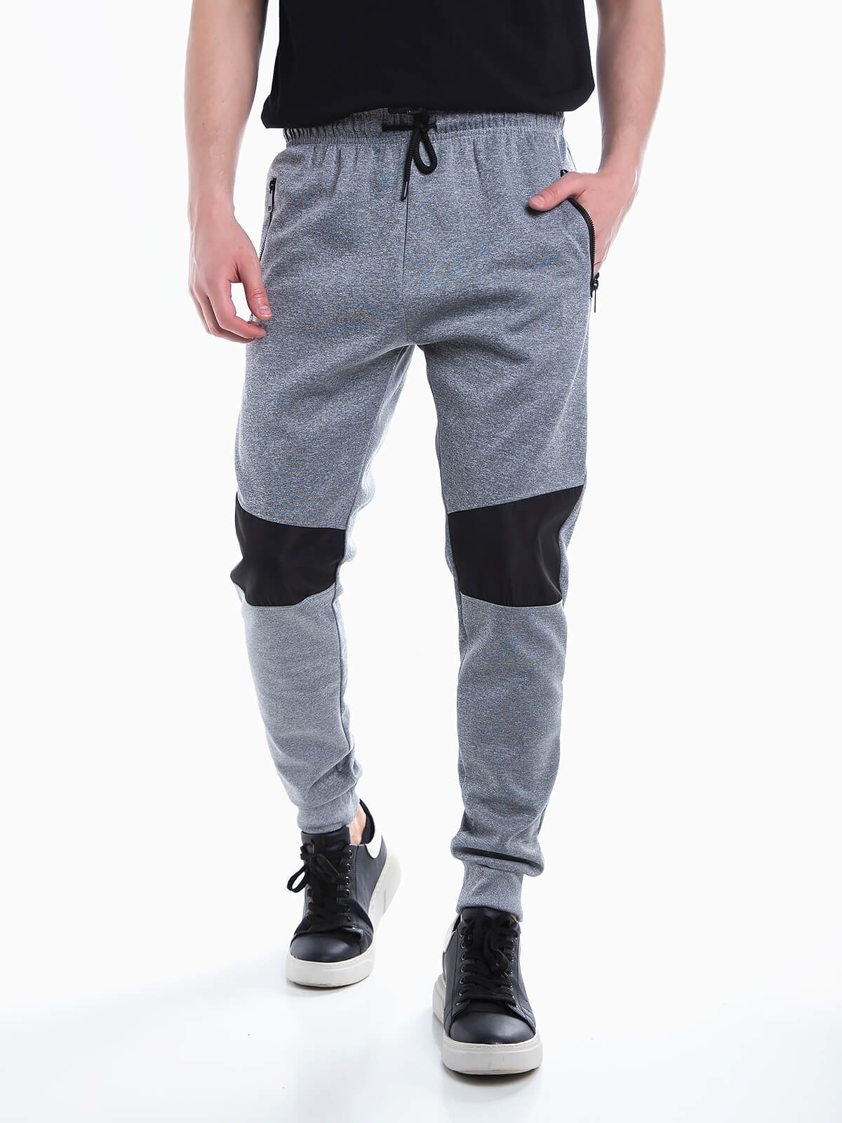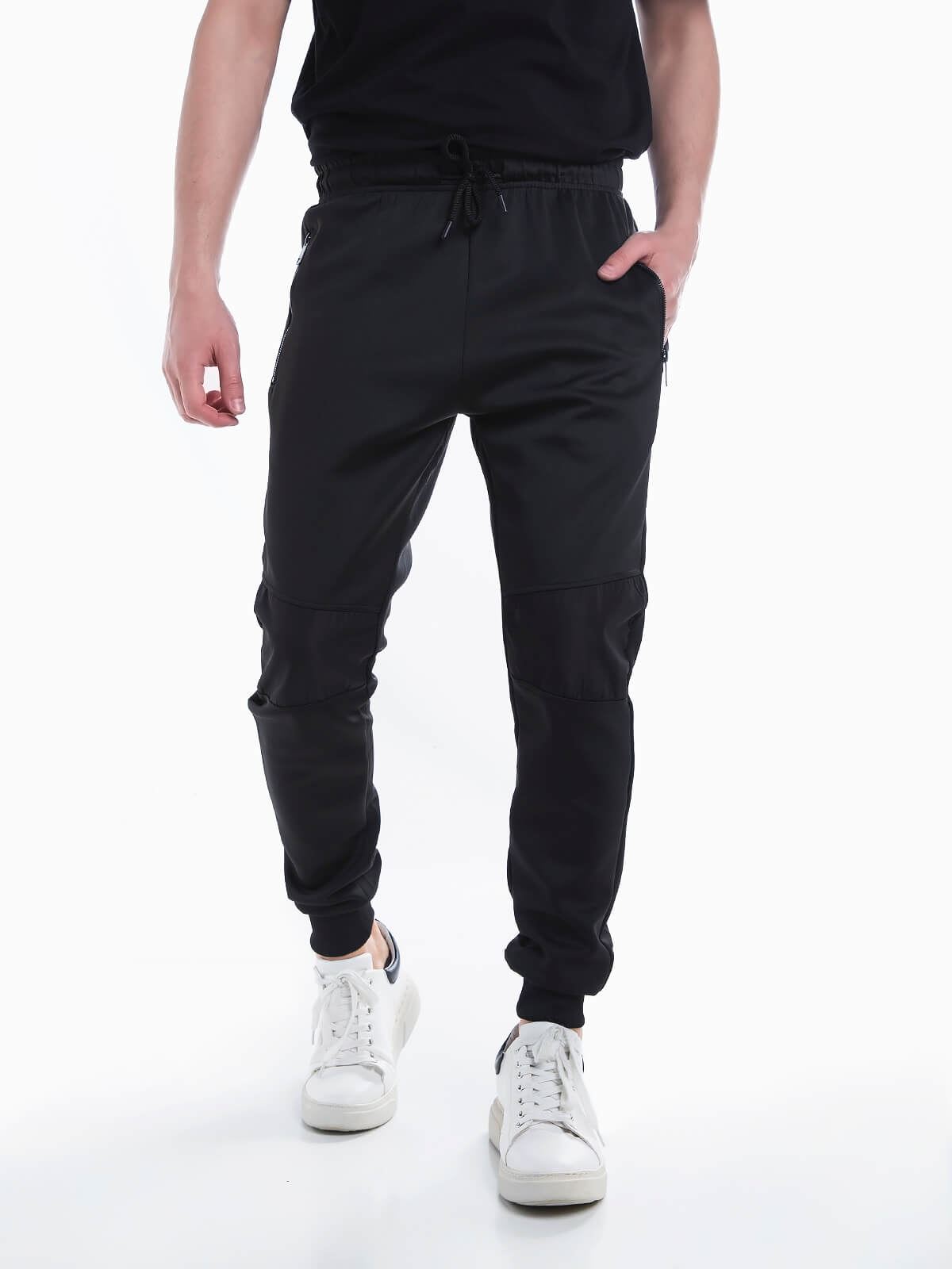 Calças de fato de treino com encaixe de tecido impermeável. Calças desportivas com cintura e punhos elásticos. Cordão para ajustar. 2 bolsos.