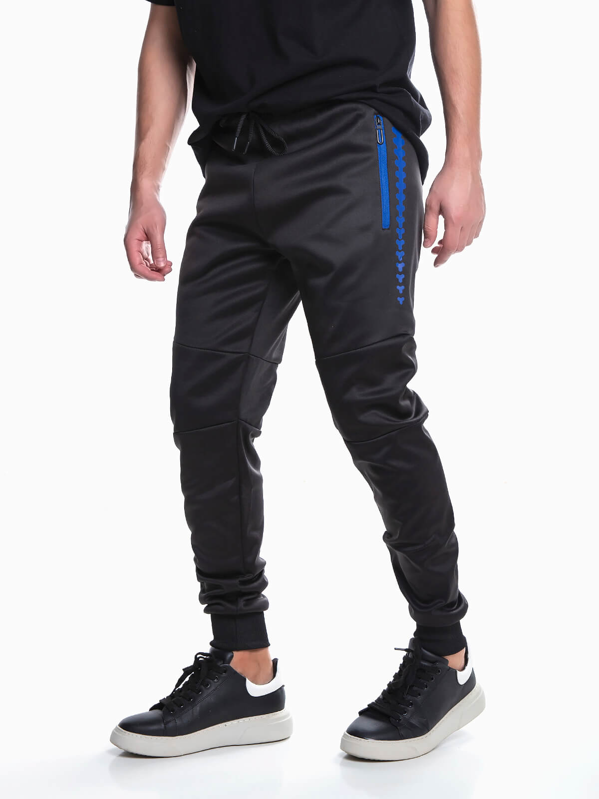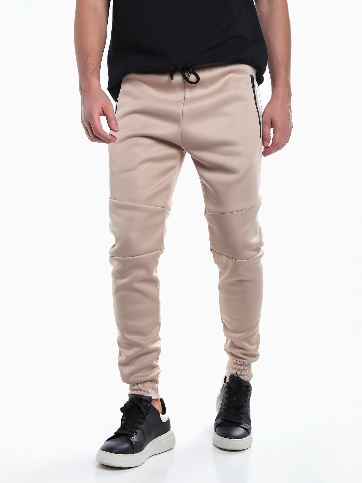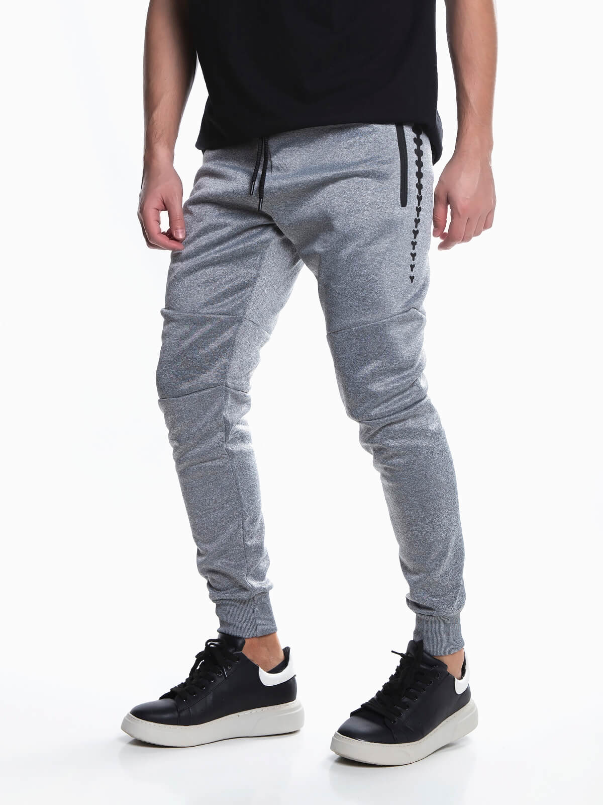 Calças fato de treino com estampado geométrico para homem. Calças jogger com interior cardado e 2 bolsos. Cintura elástica e cordão para ajustar. Costuras reforçadas nos joelhos.