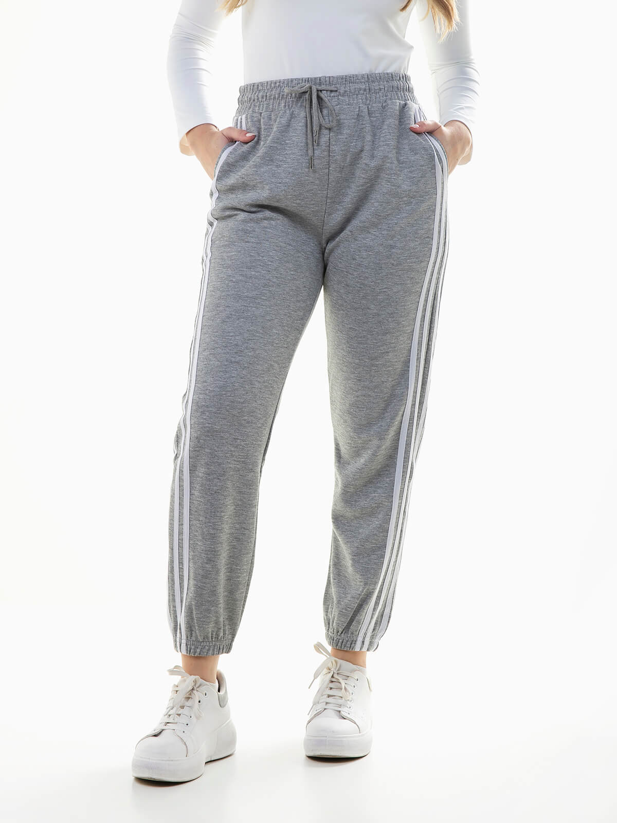 Calças fato treino com riscas nas laterais em contraste. Calças jogger de cintura alta elástica com cordão para ajustar. 2 bolsos.