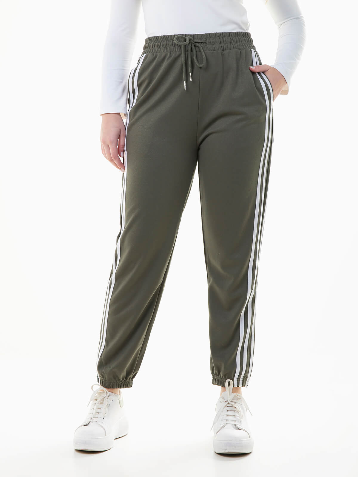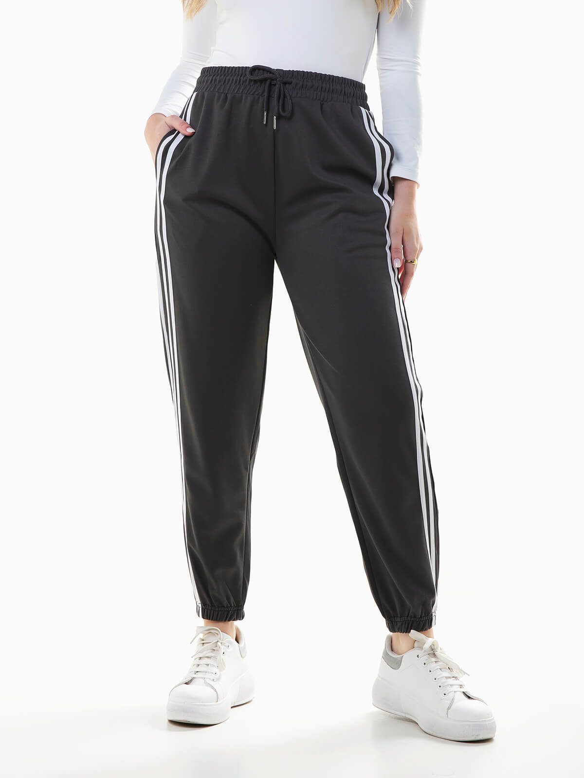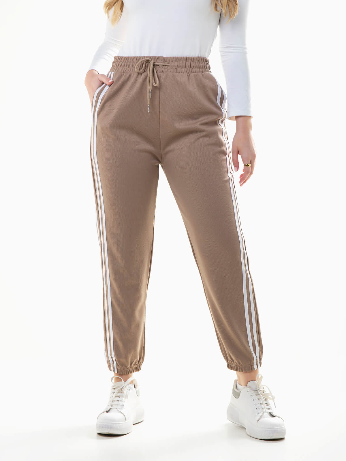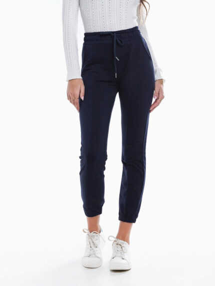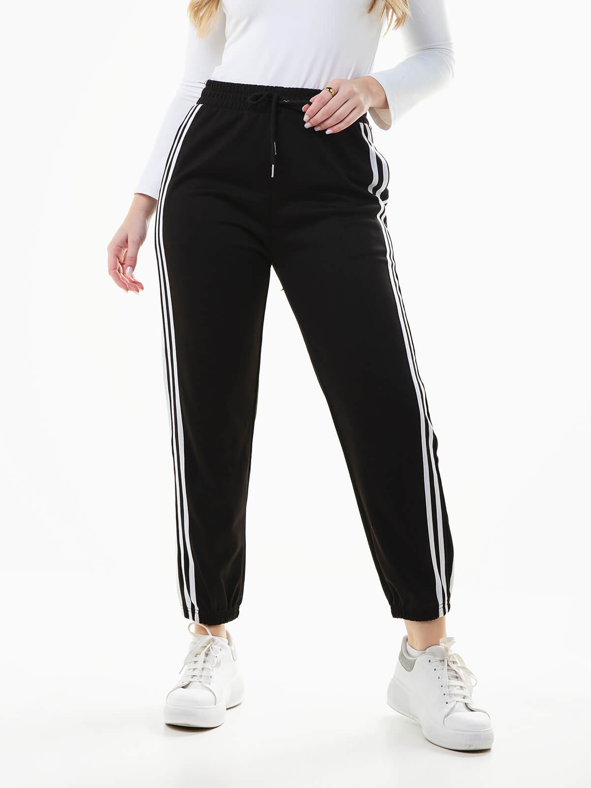 Calças fato treino com riscas nas laterais em contraste. Calças jogger de cintura alta elástica com cordão para ajustar. 2 bolsos.