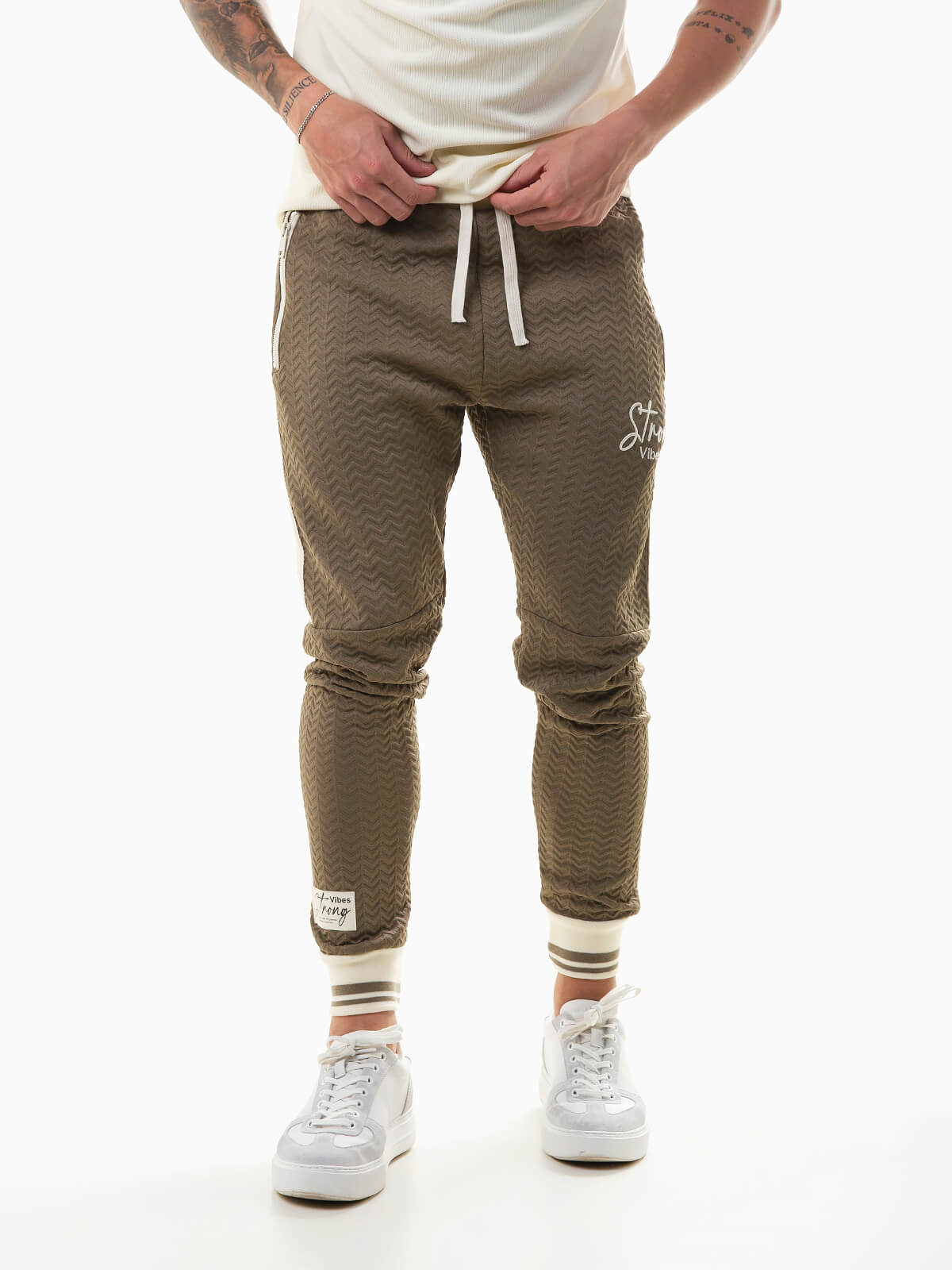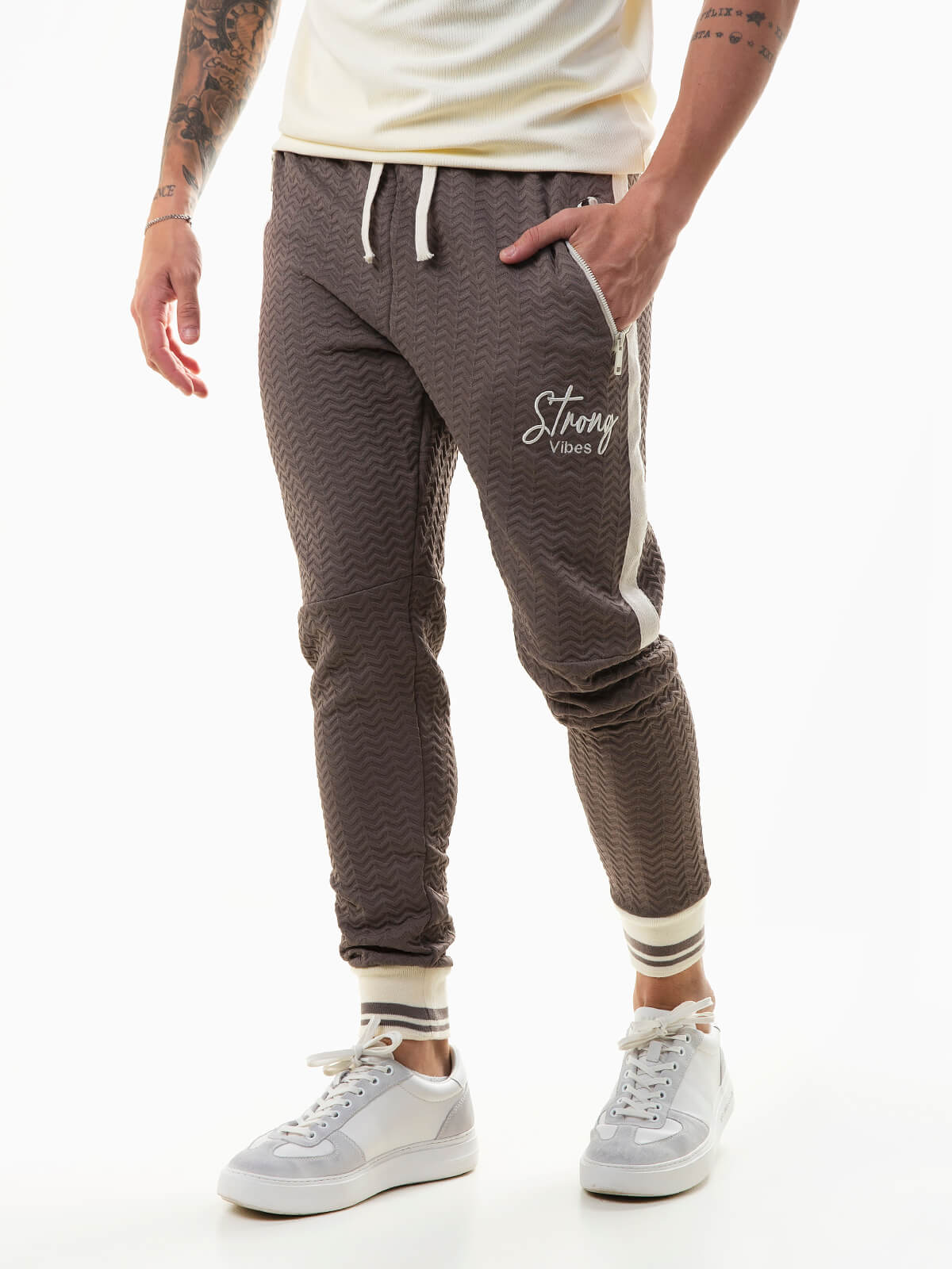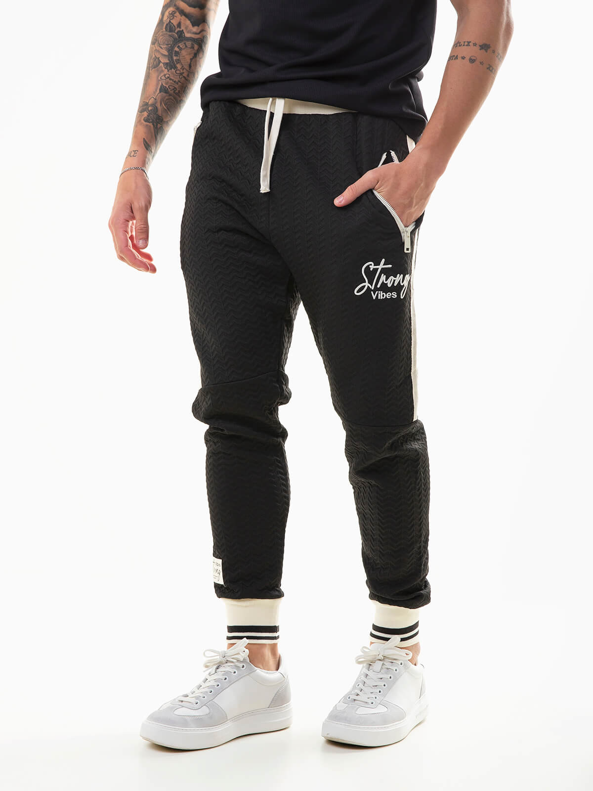 Calças de fato treino com textura e pormenores bordados. Calças jogger para homem com punhos elásticos e cordão na cintura para ajustar. 2 bolsos com zíper.