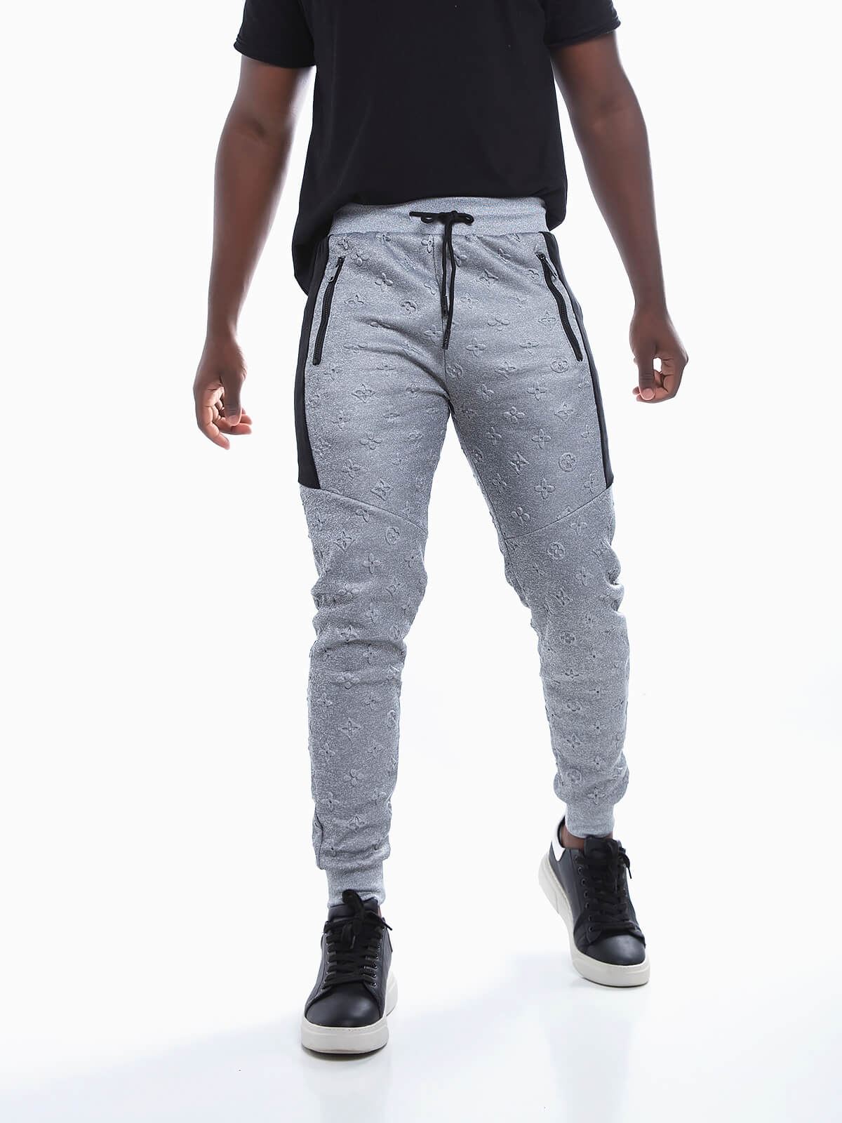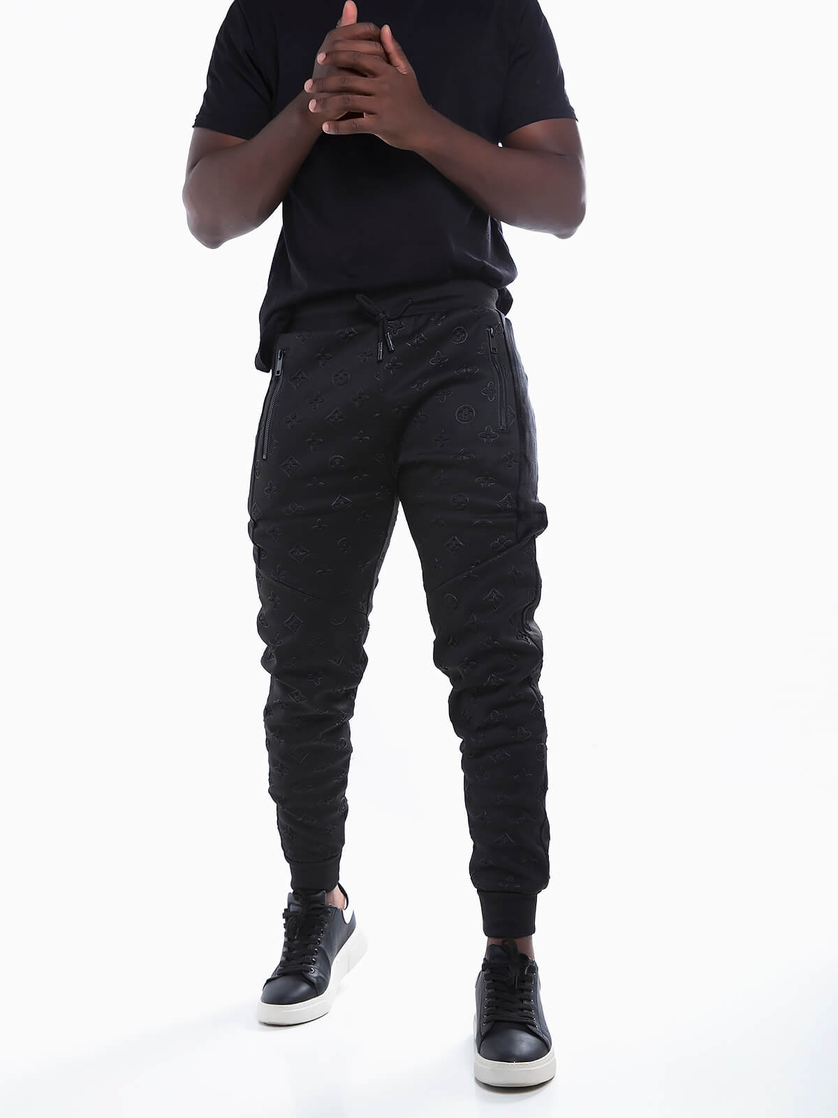 Calças de fato de treino com encaixe de veludo nas laterais. Joggers cardadas com símbolos em relevo. Cintura e punhos elásticos. Cordão para ajustar. 2 bolsos com zíper.