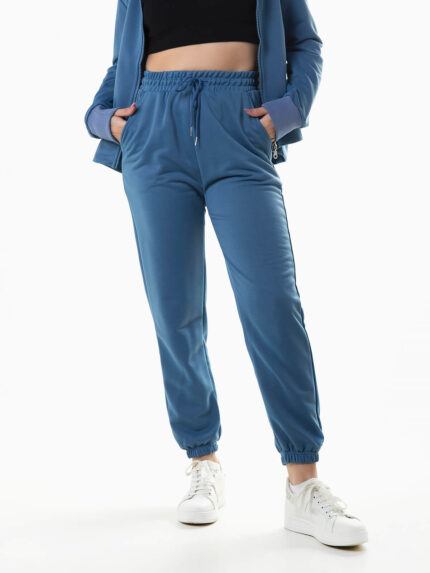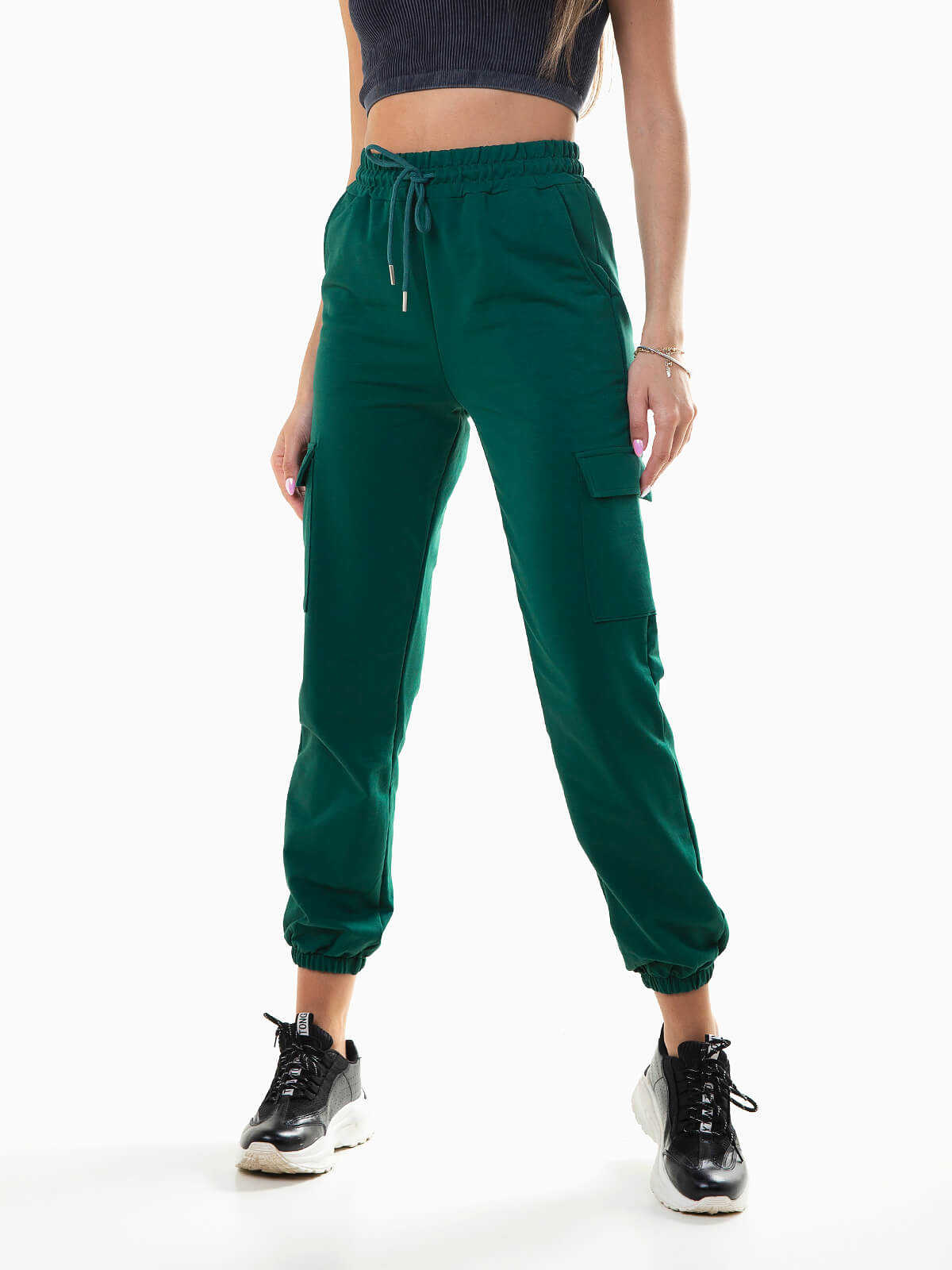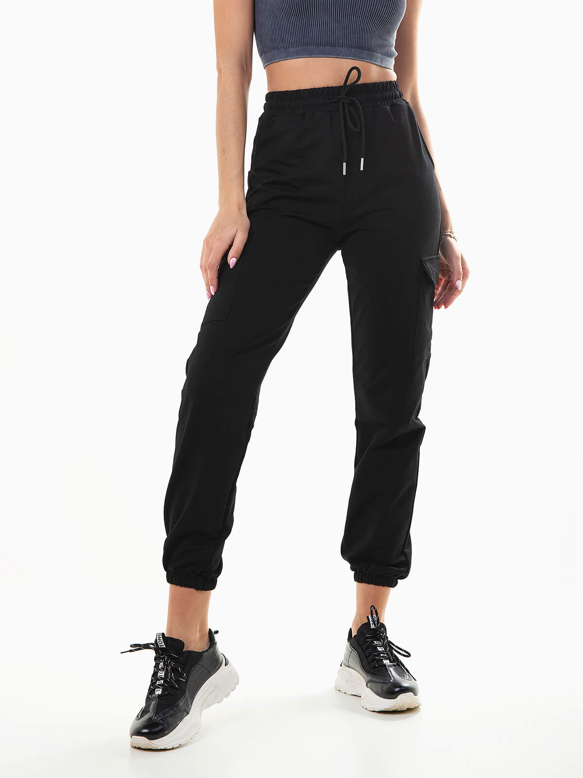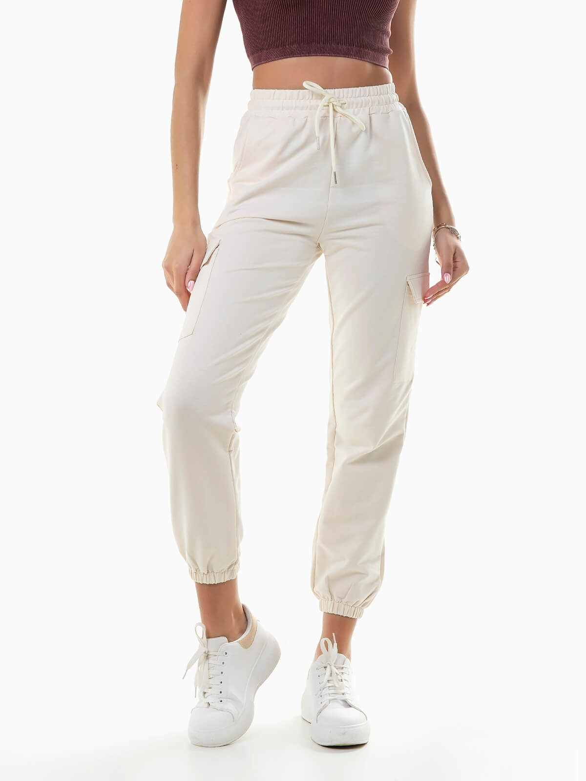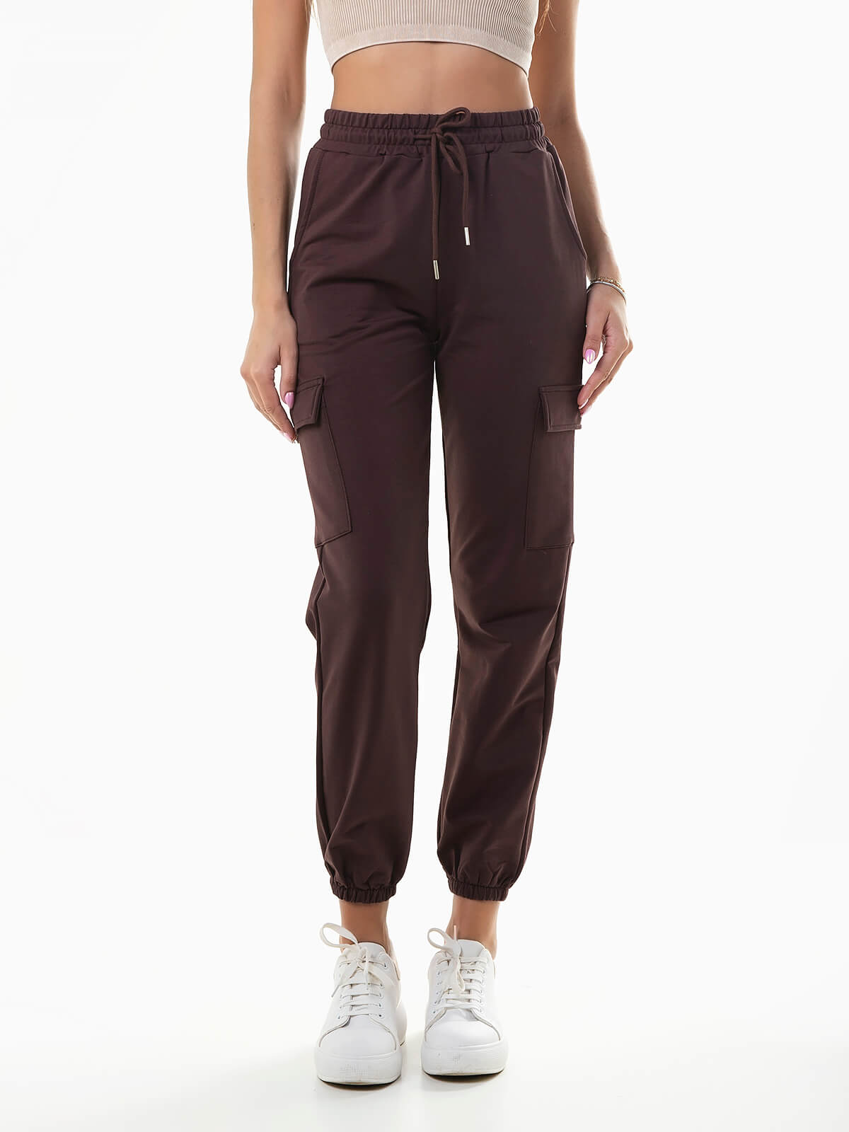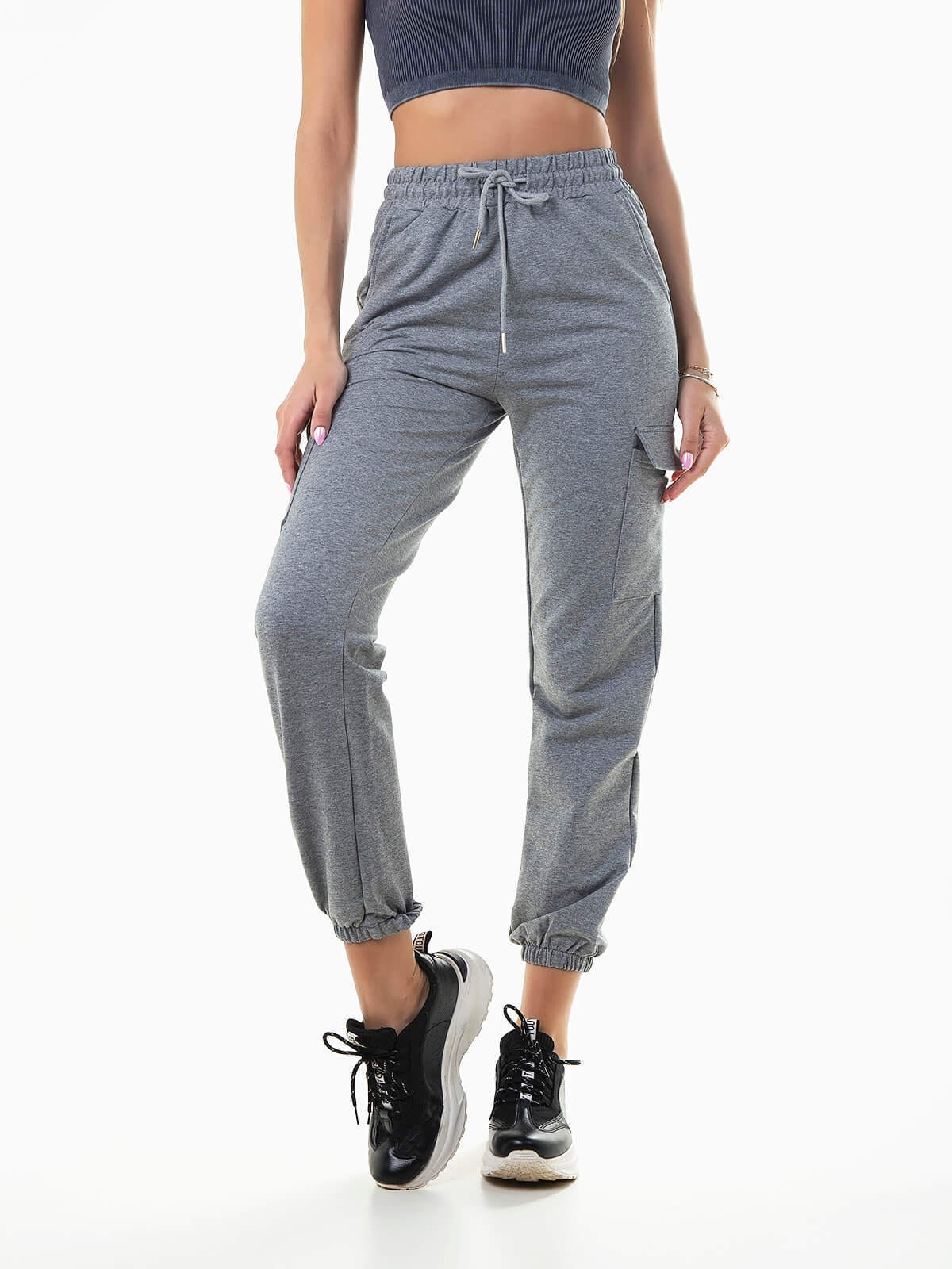 Calças fato de treino estilo cargo para senhora. Joggers felpa de cintura alta elástica com cordão para ajustar. 4 bolsos.