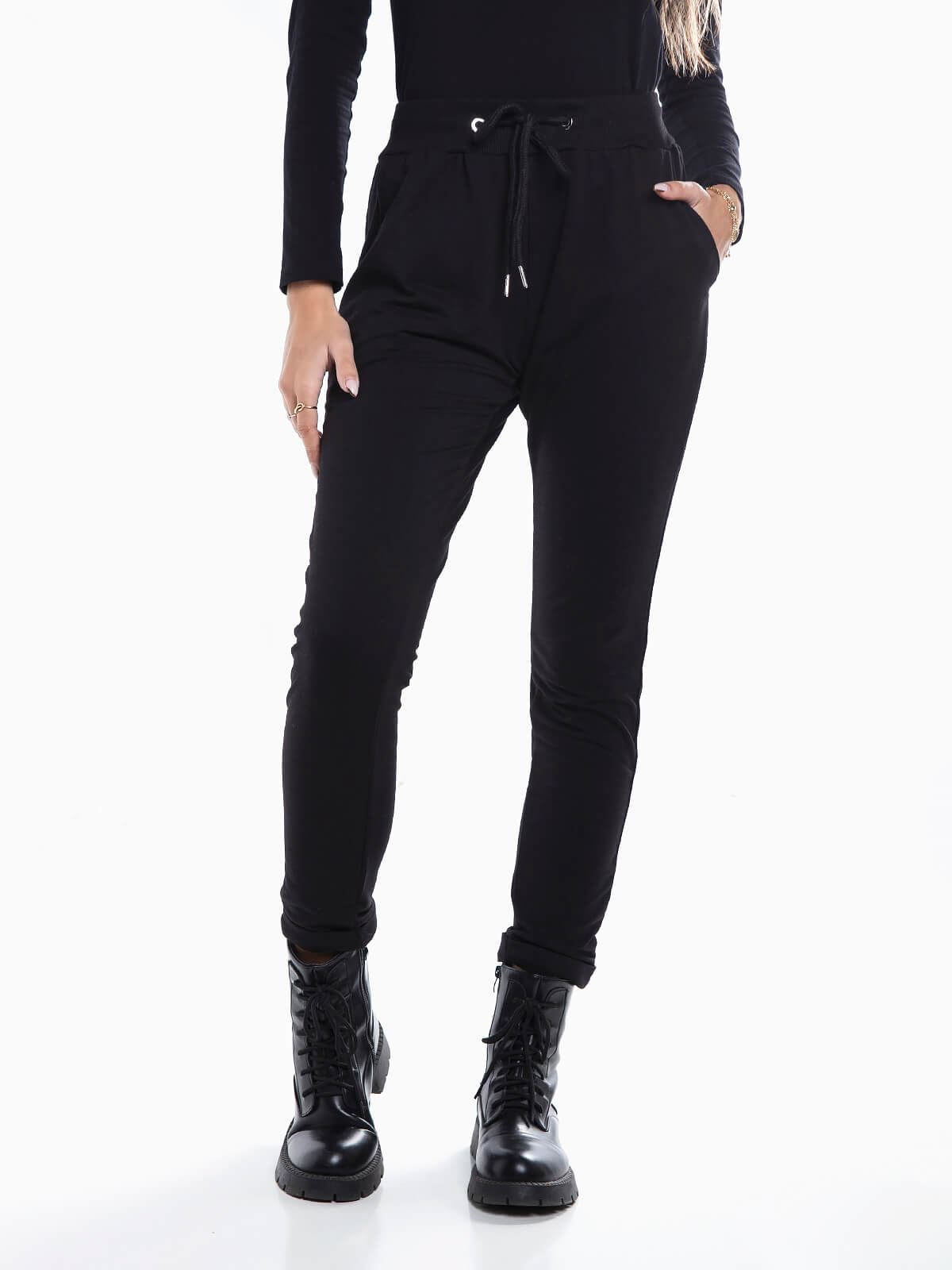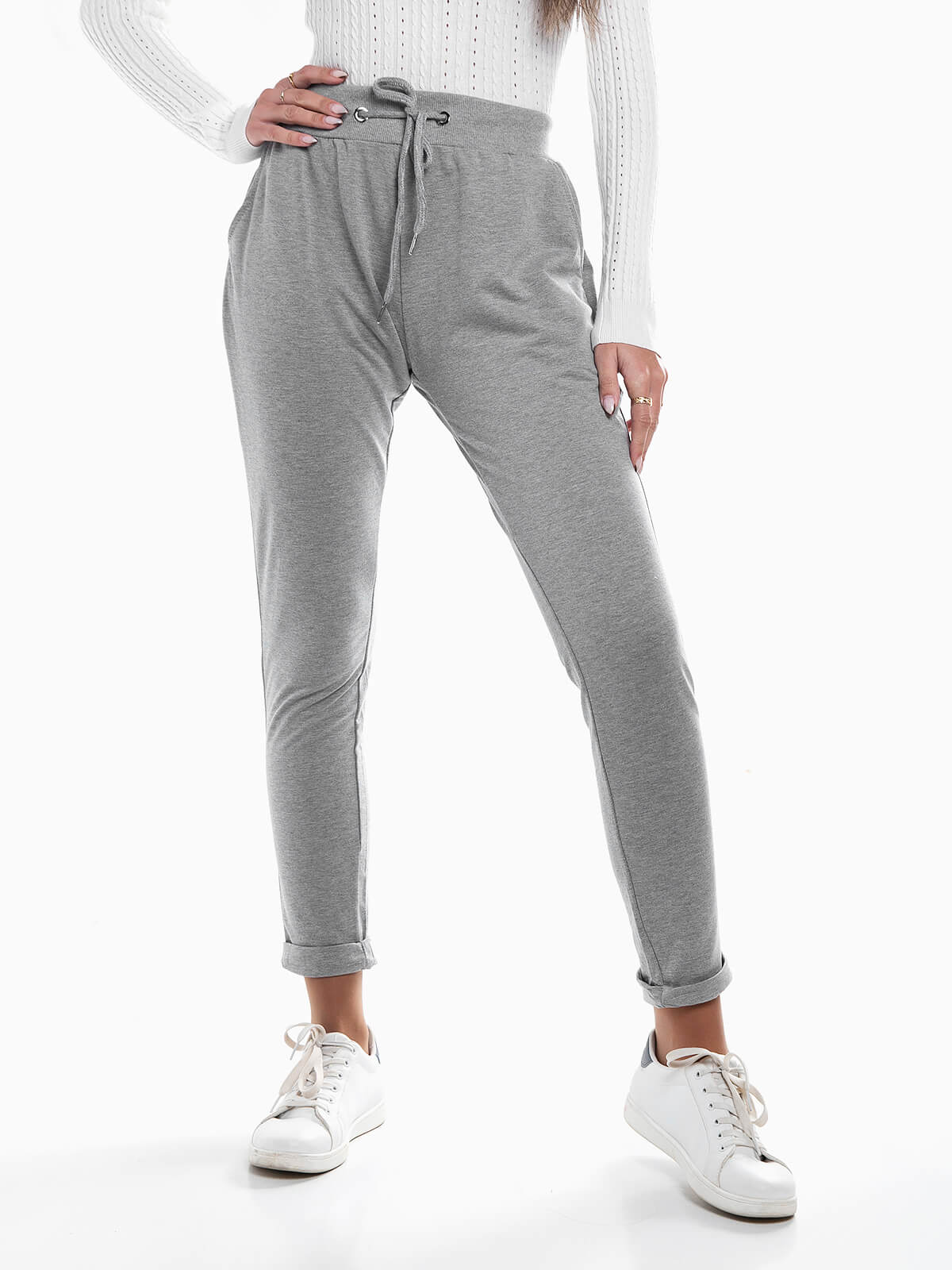 Calças fato treino com interior cardado para mulher. Calças cintura alta com cordão para ajustar. 2 bolsos.