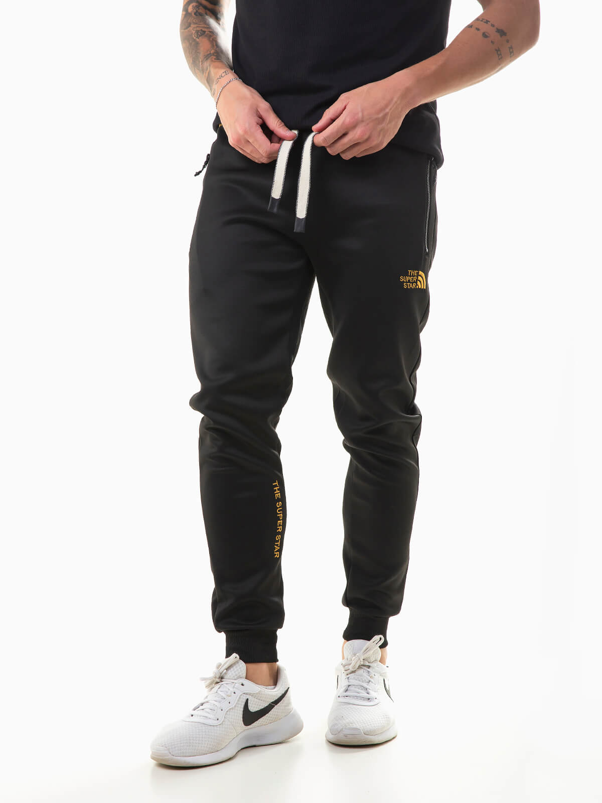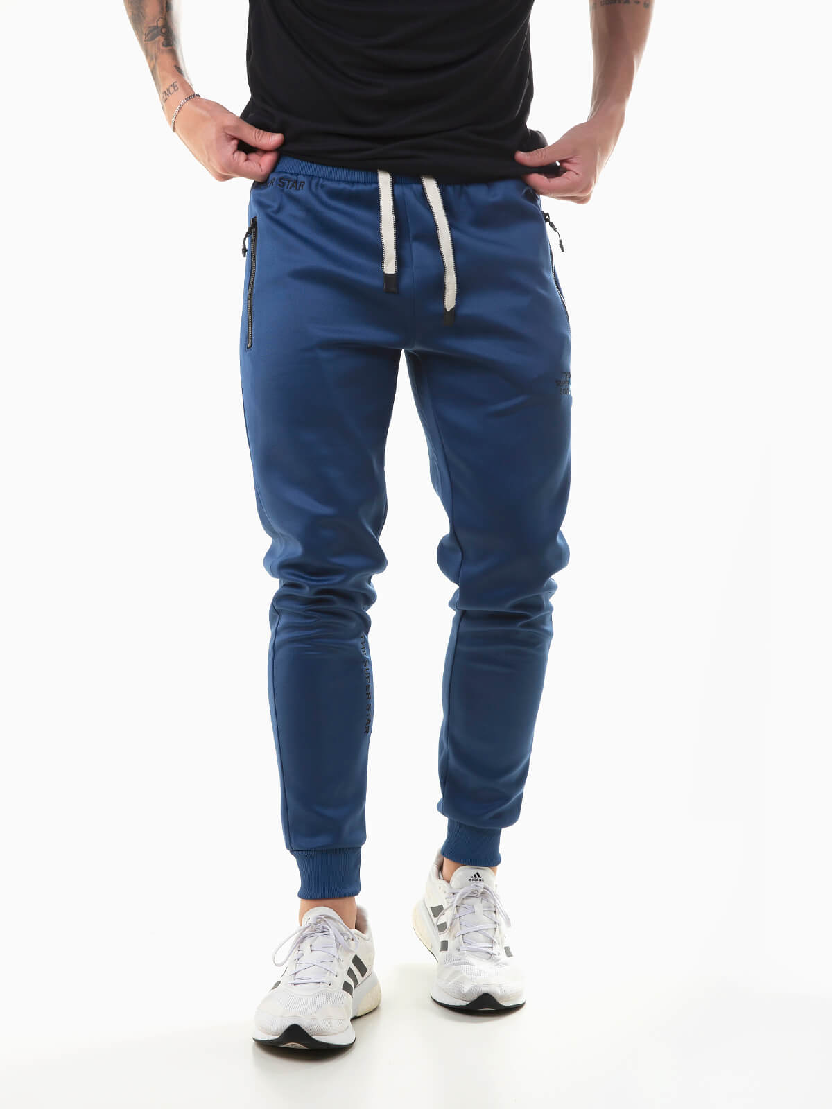 Calças jogger em tecido acetato para maior respirabilidade, resistência e durabilidade. Calças fato treino para homem com pormenores bordados. Contém punhos elásticos e cintura com cordão para ajustar. 2 bolsos zíper.