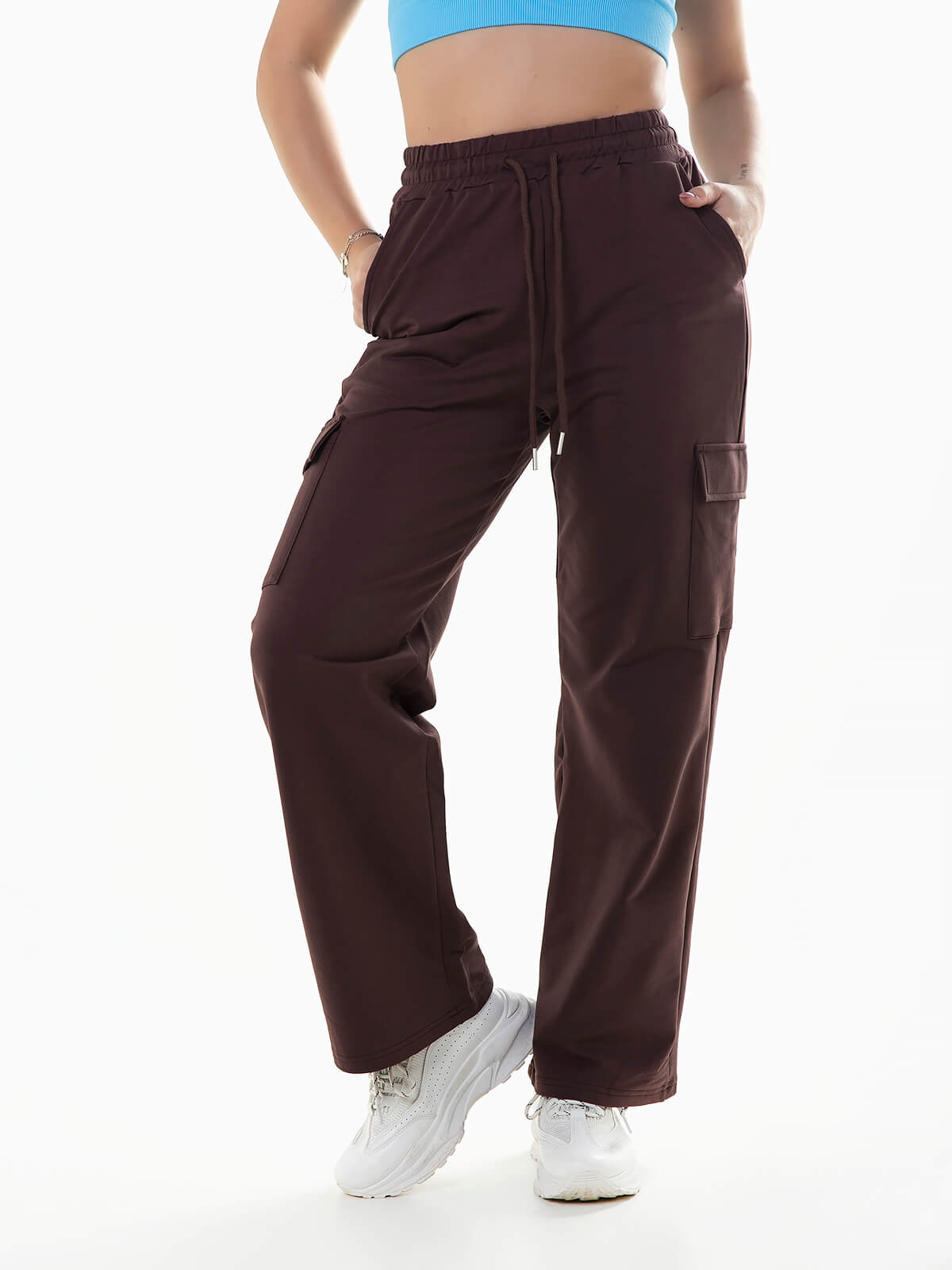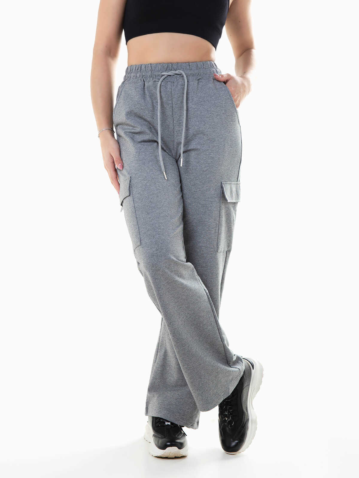 Calças de fato treino largas com dois bolsos laterais e dois com pala. Calças felpa de cintura alta elástica com cordão para ajustar.