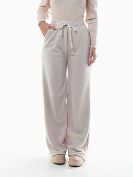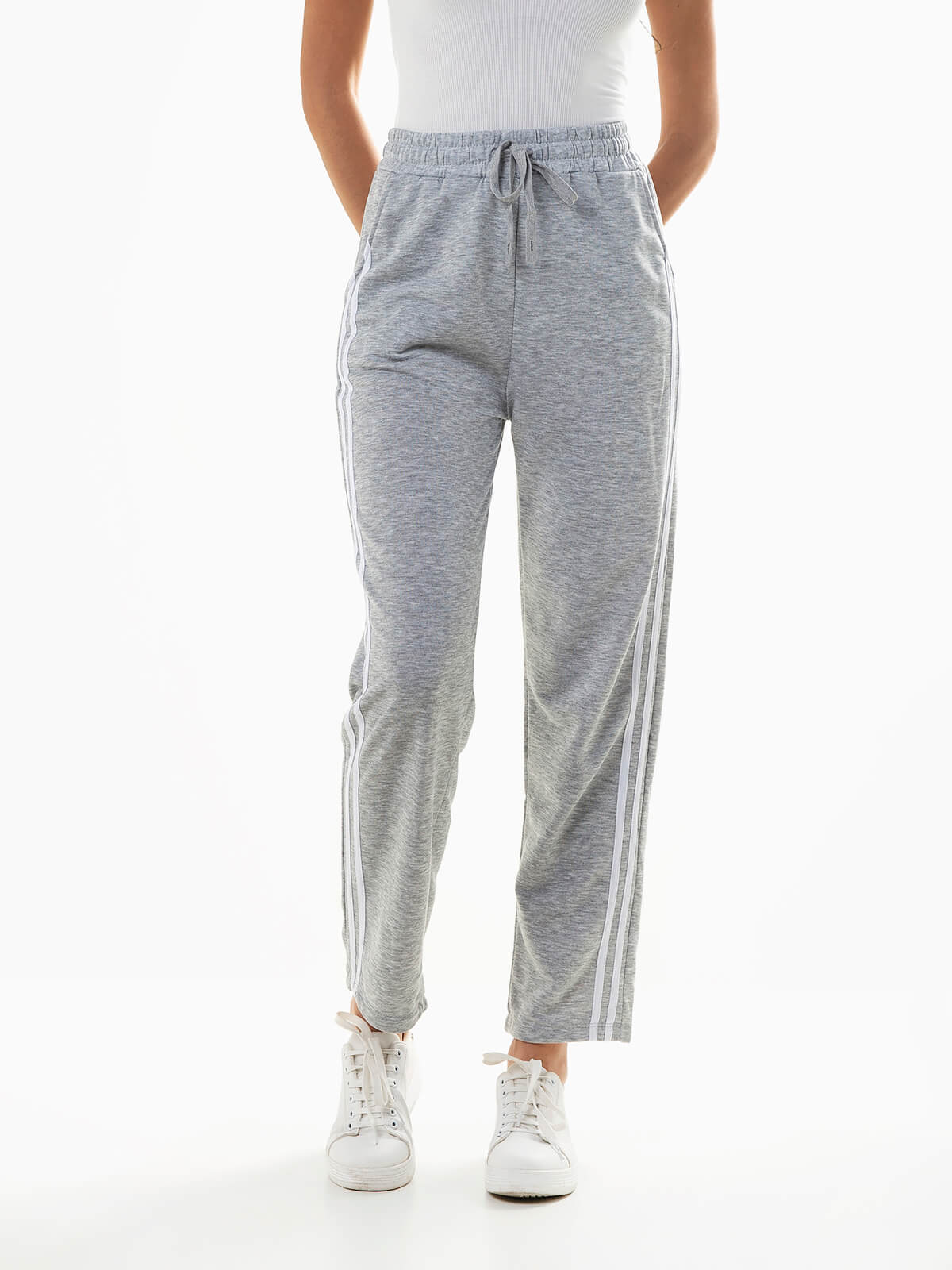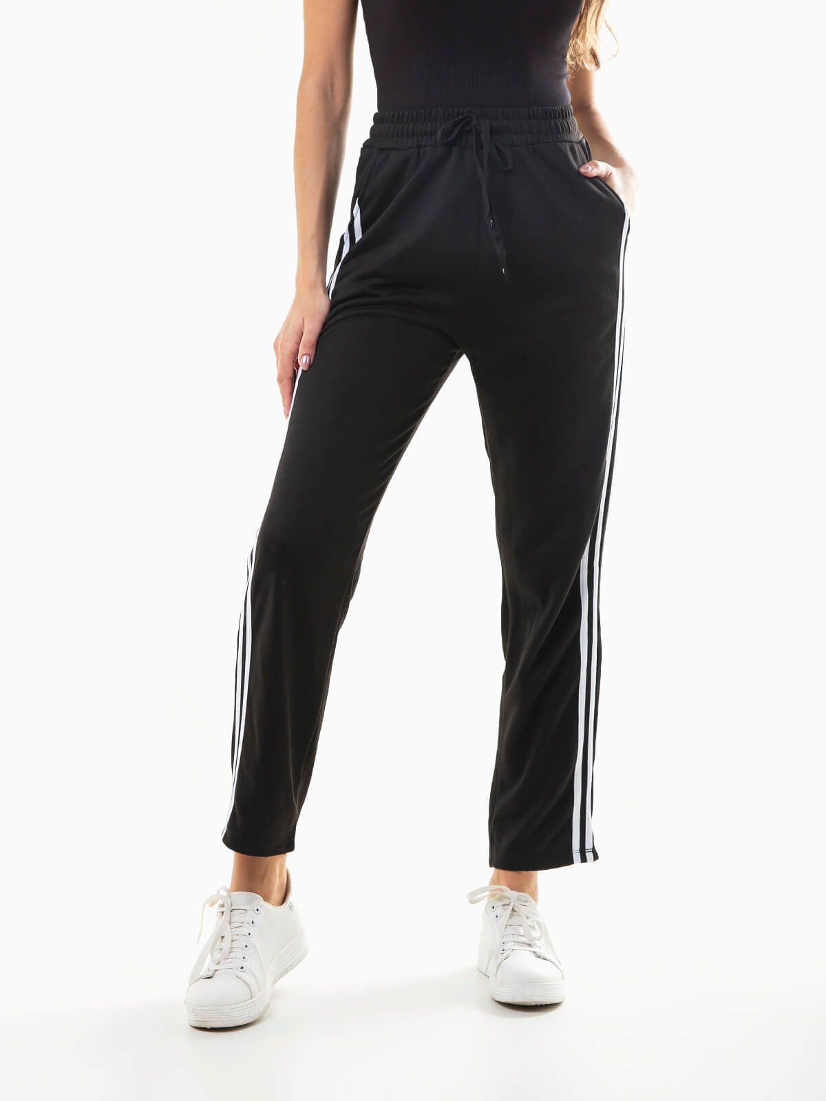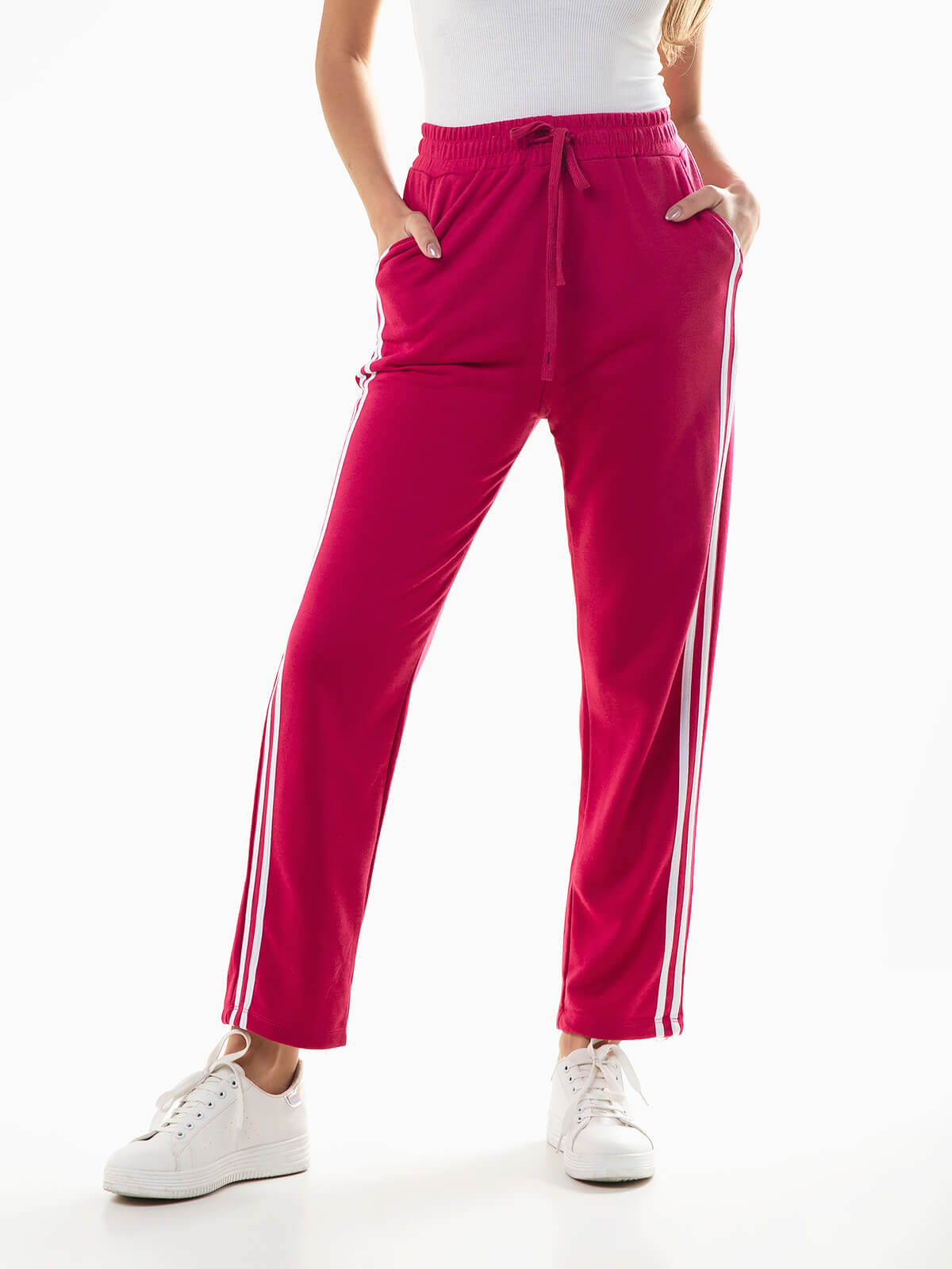 Calças largas de fato treino com riscas laterais em contraste. Calças felpa cintura alta elástica com cordão para ajustar. 2 bolsos.