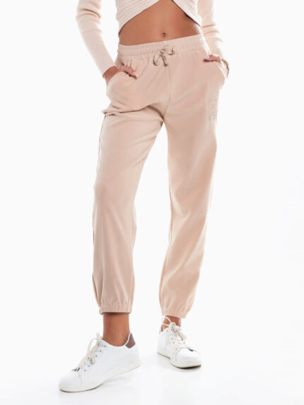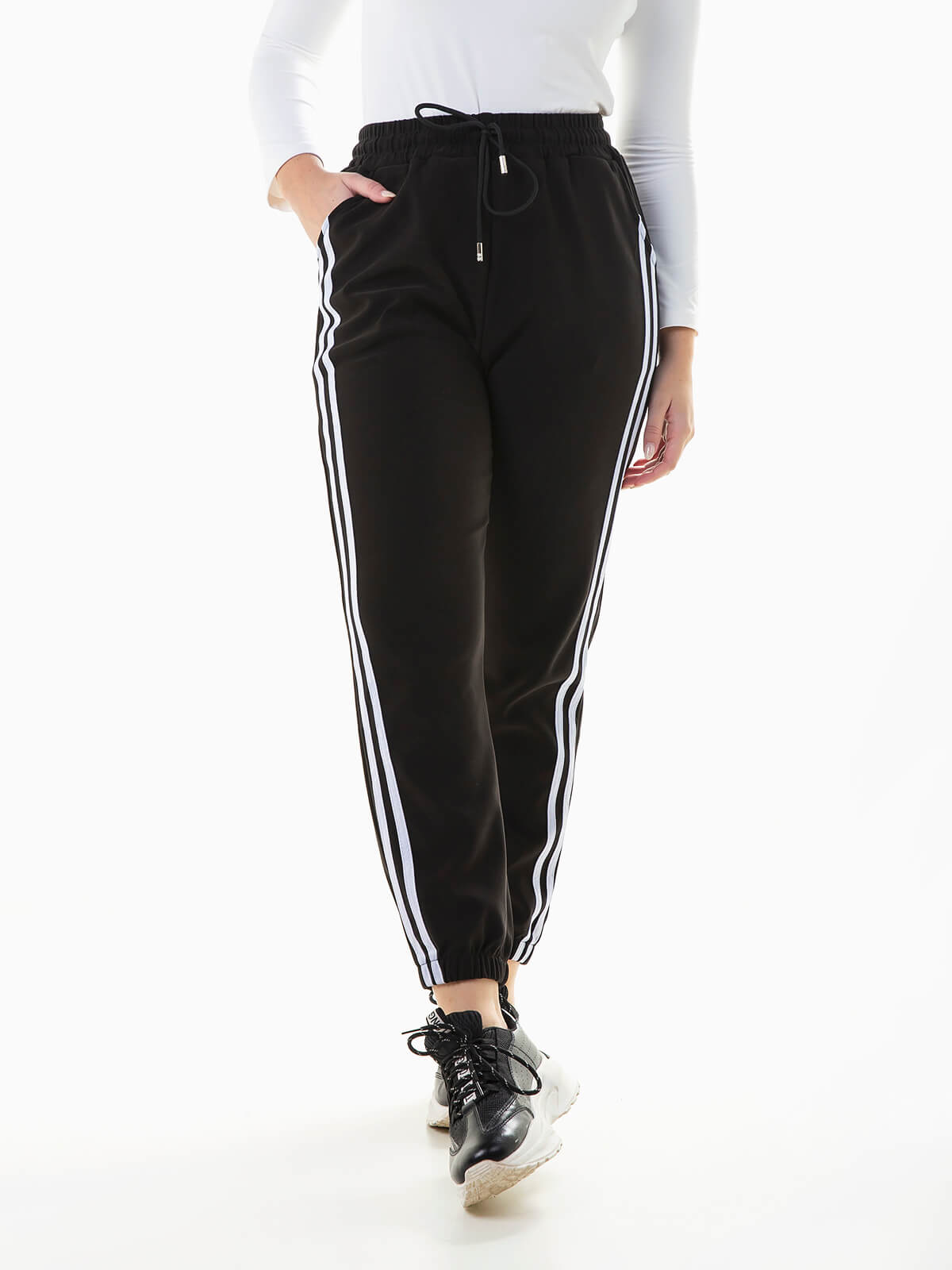 Calças fato treino com riscas brancas nas laterais. Calças jogger desportivas de cintura alta elástica com cordão para ajustar. 2 bolsos.