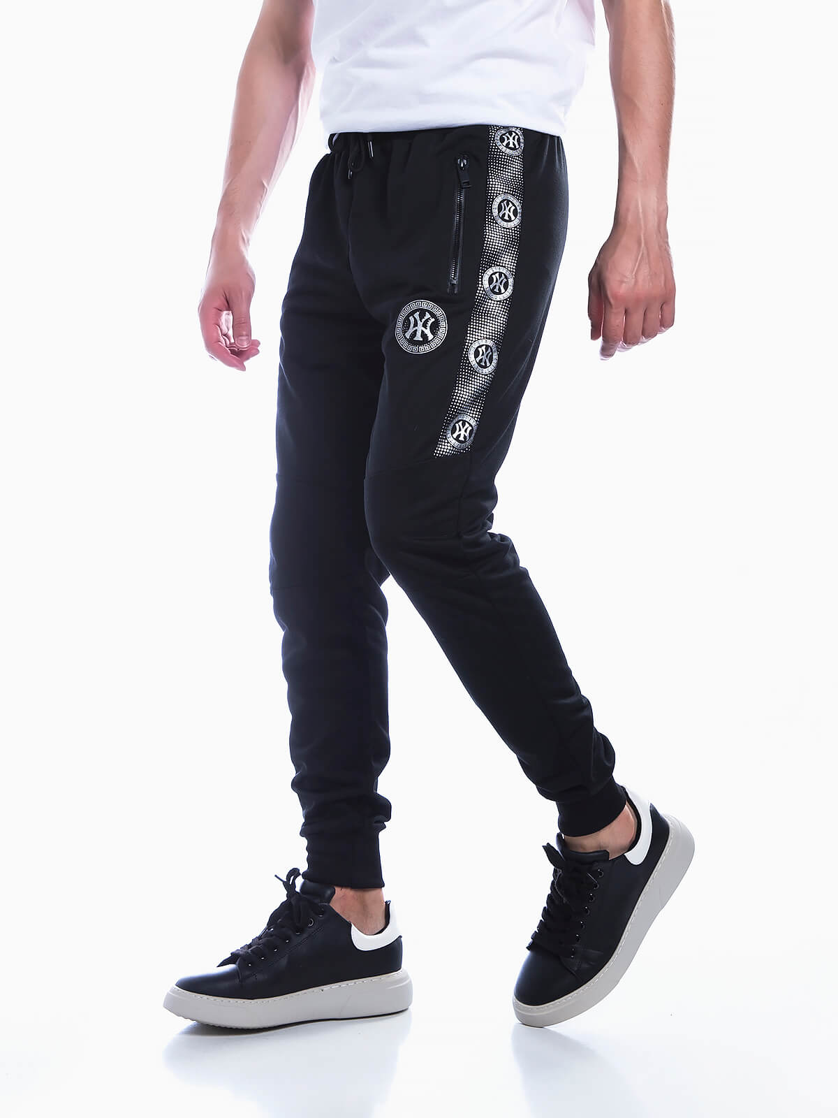 Calças de fato de treino com símbolo brilhante estampado. Calças desportivas com bandas laterais em contraste. 2 bolsos. Cintura elástica com cordão para ajustar. Punhos elásticos.