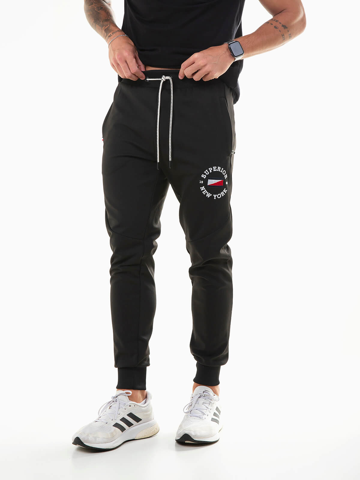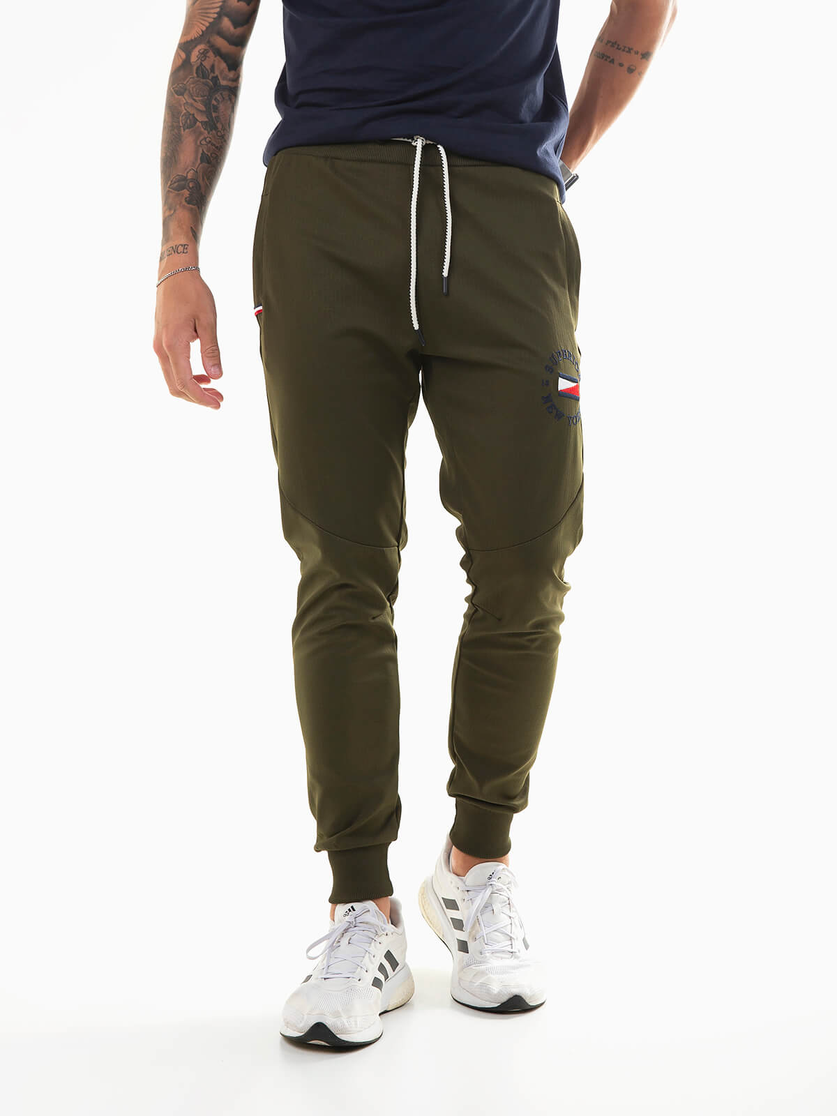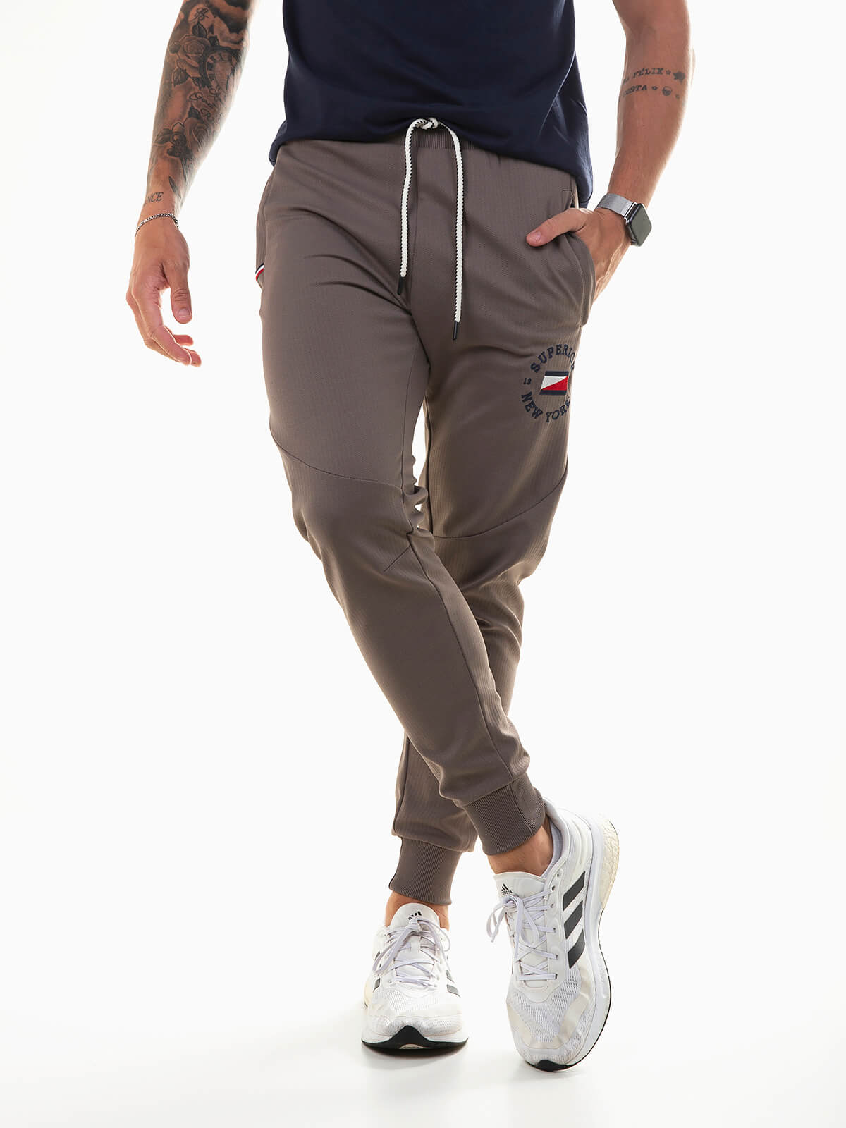 Calças de fato treino texturizadas com pormenor bordado na lateral. Calças jogger para homem com cordão na cintura para ajustar. 2 bolsos com zíper.