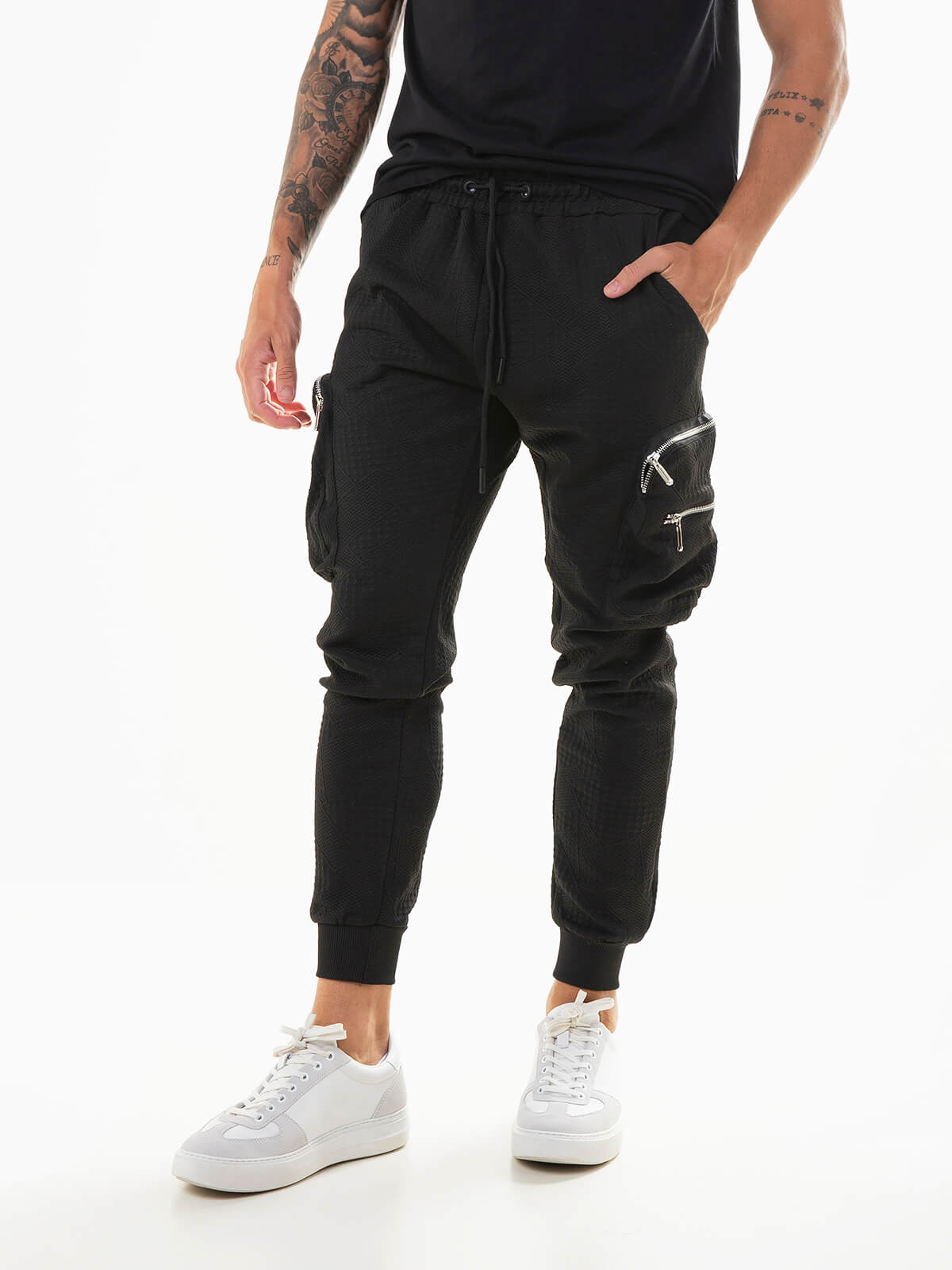 Calças de fato treino em felpa com textura. Calças jogger de cintura elástica com cordão para ajustar. 4 bolsos.