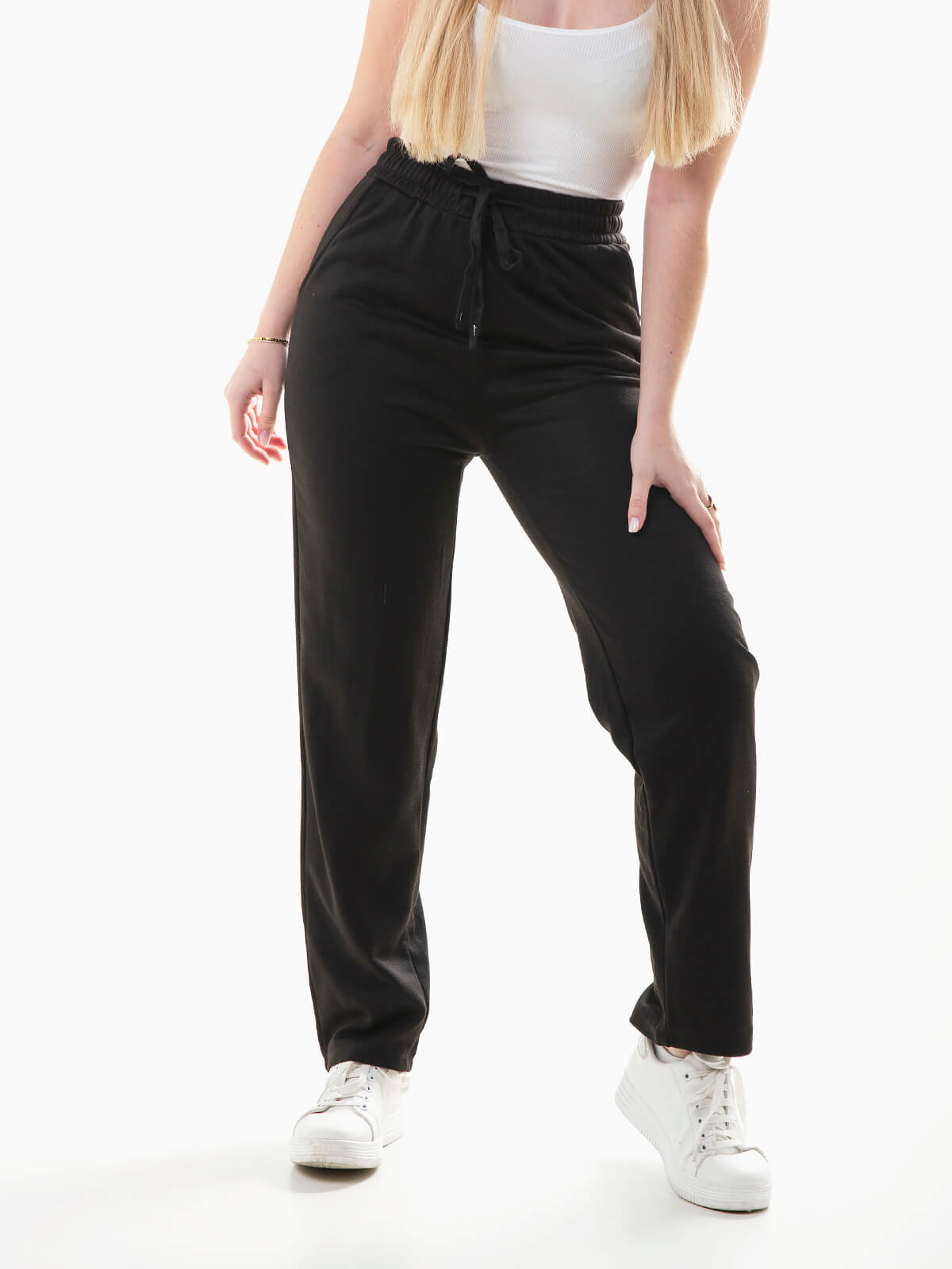Calças de fato treino para mulher com cintura alta e cordão para ajustar. Calças desportivas confortáveis com 2 bolsos.