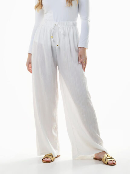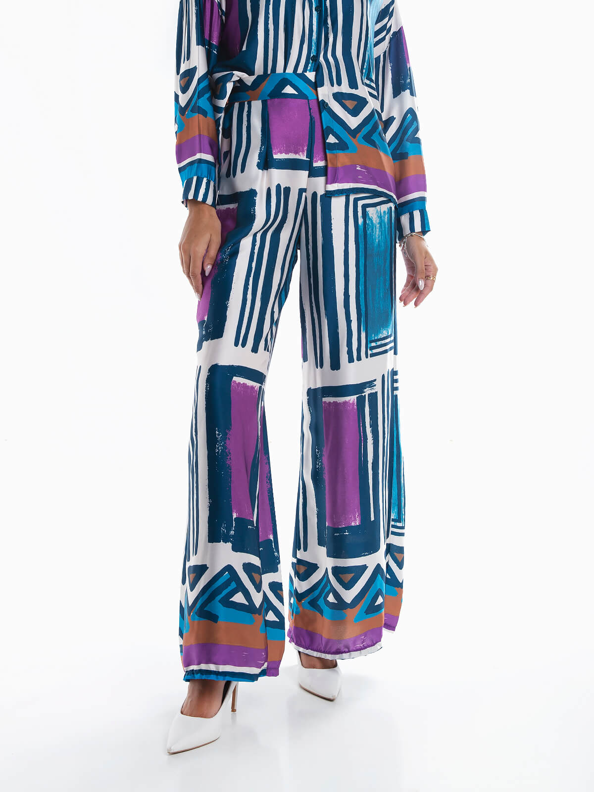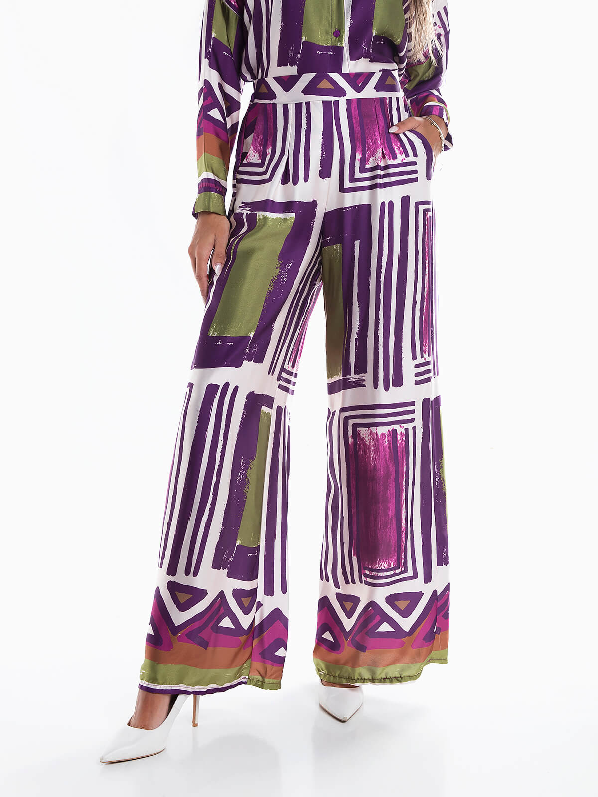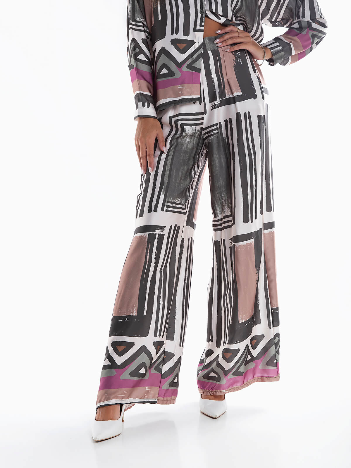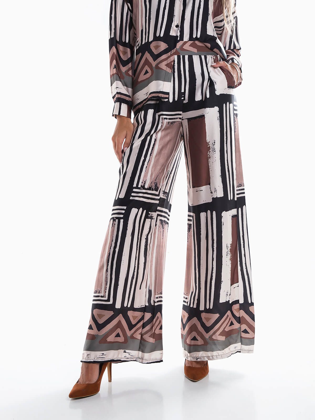 Calças fluídas acentinadas com estampado abstrato. Calças de cintura alta elástica com 2 bolsos.