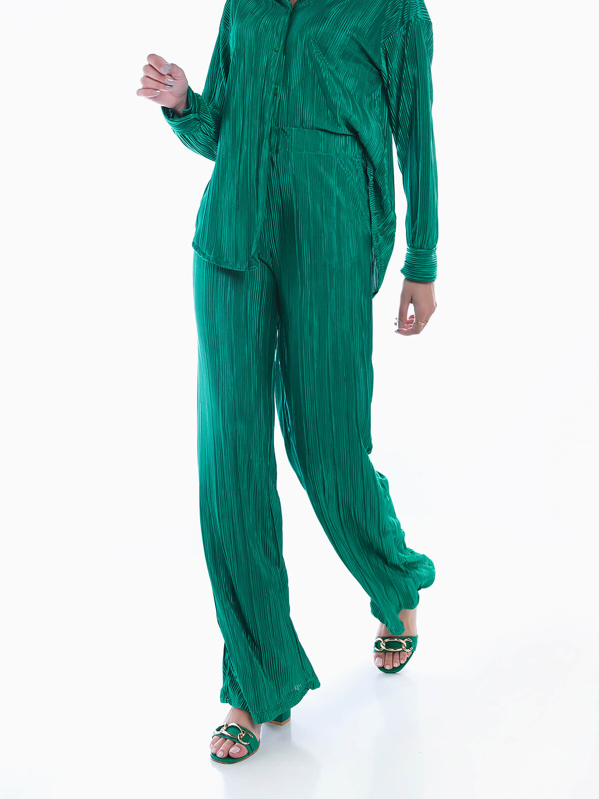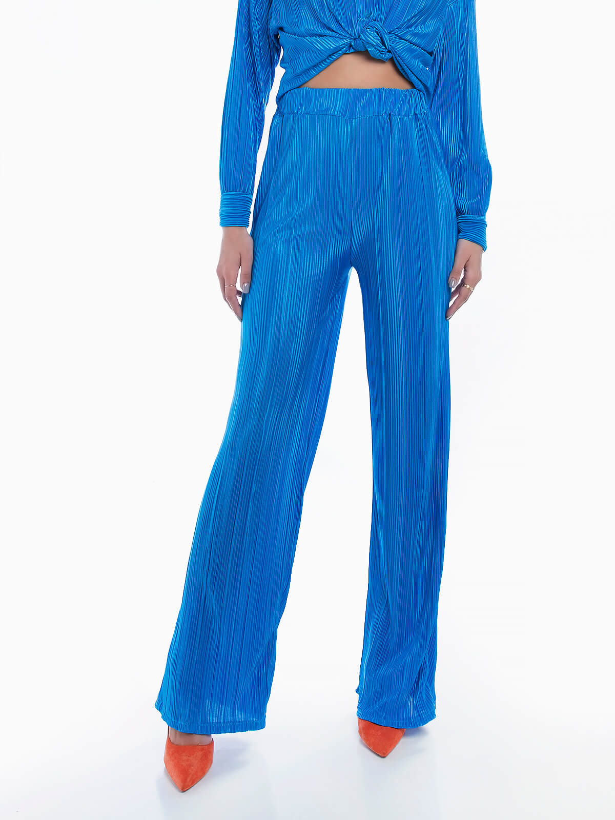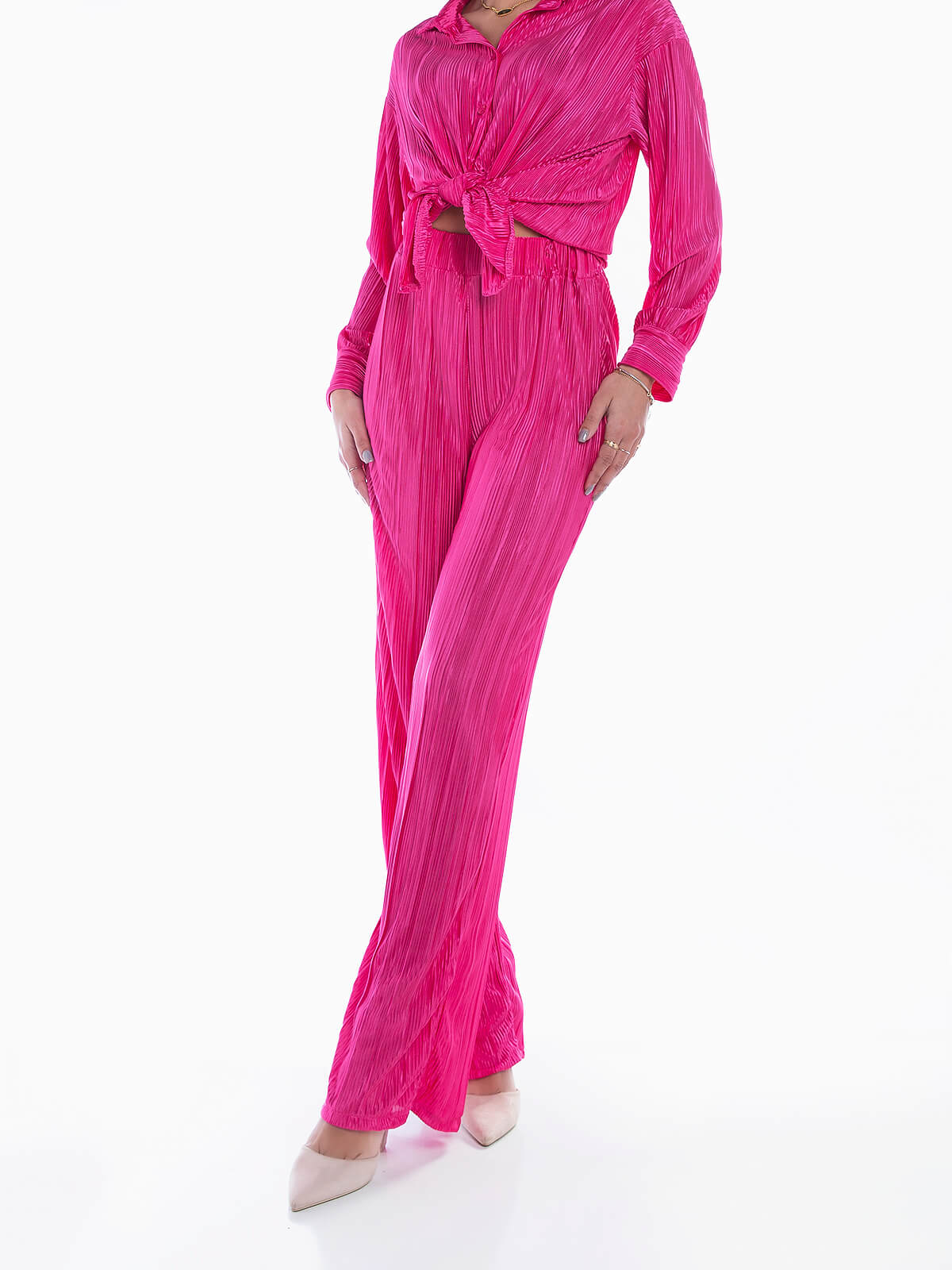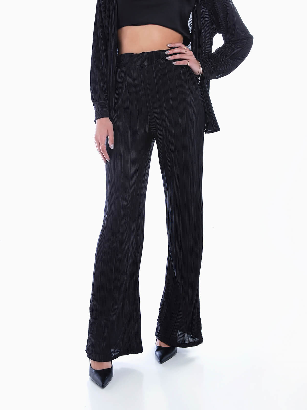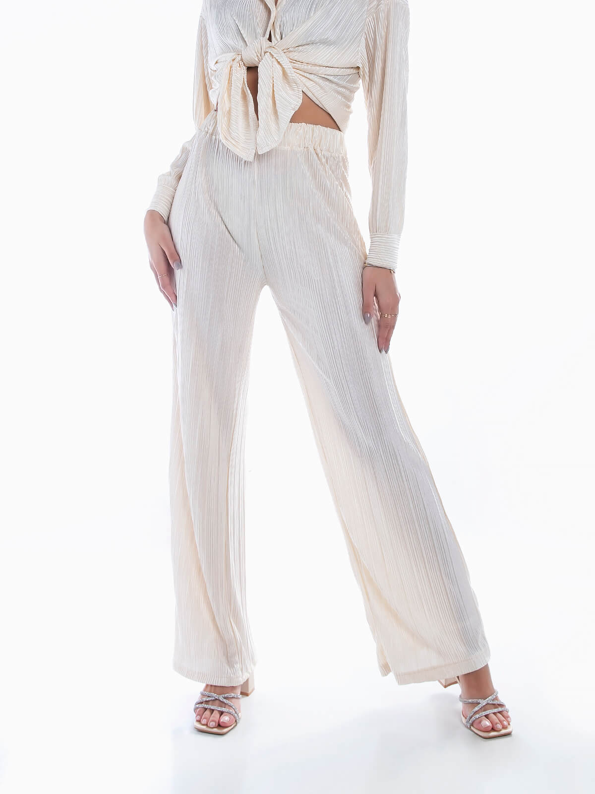 Calças fluídas plissadas para senhora. Calças acetinadas com cintura alta elástica.