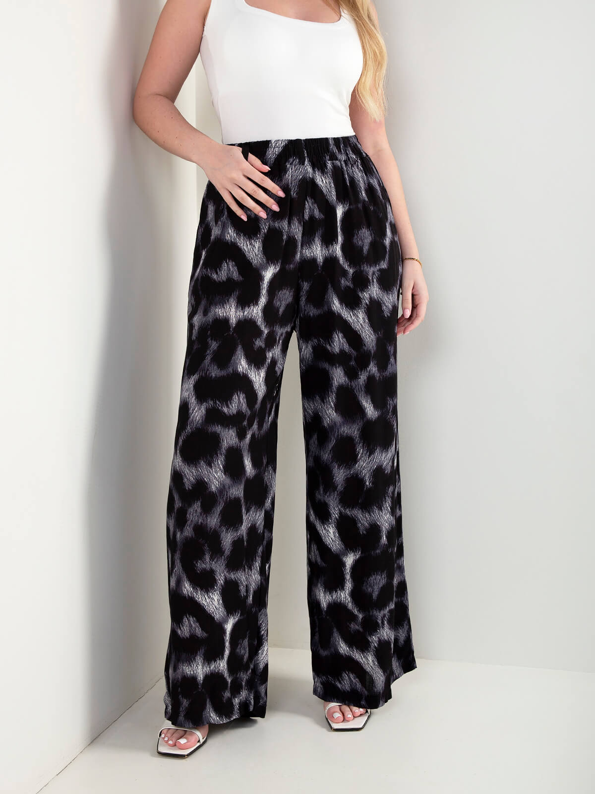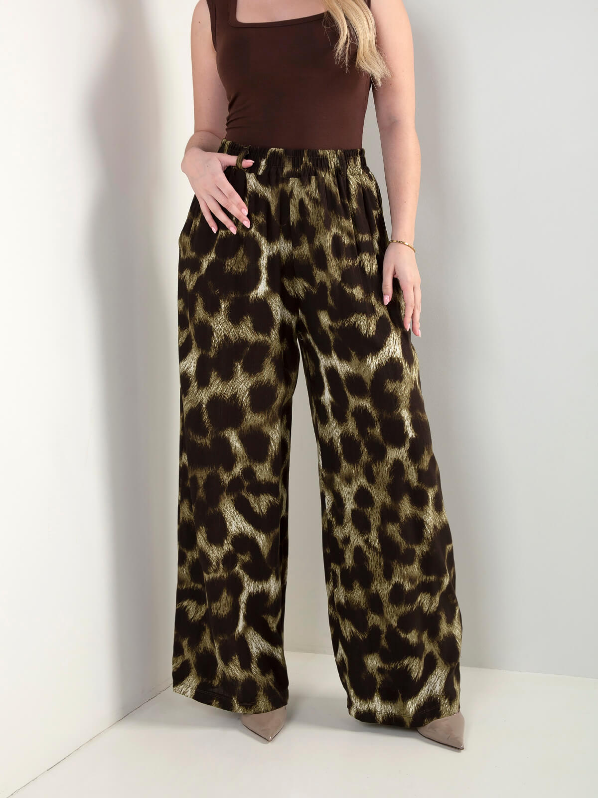 Calças fluídas com padrão animal e cintura alta elástica para maior conforto. Corte amplo e leve, ideal para looks descontraídos e atuais. 2 bolsos. Perfeitas para o dia a dia ou ocasiões mais informais.