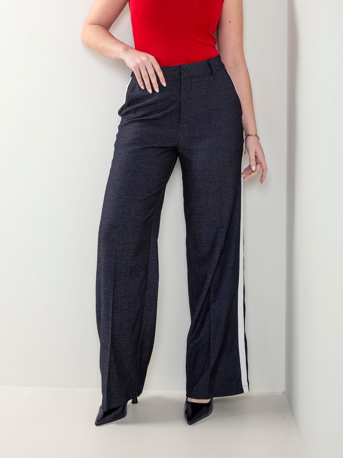 Calças fluídas azul marinho com cintura alta elástica e perna larga. Elegantes e confortáveis com 2 bolsos, aperto de colchete, fecho e botão. Ideais para looks de trabalho ou combinações mais descontraídas com tops ajustados, camisas ou blazers.