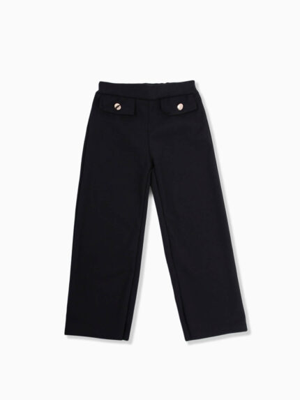 Calças fluídas azul marinho com estampado étnico. Calças para menina com cintura elástica e cordão para laço. 2 bolsos.