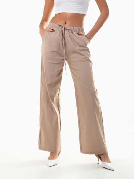 Calças fluídas em tecido canelado semitransparente. Calças de cintura alta elástica e cordão para ajustar. 2 bolsos.