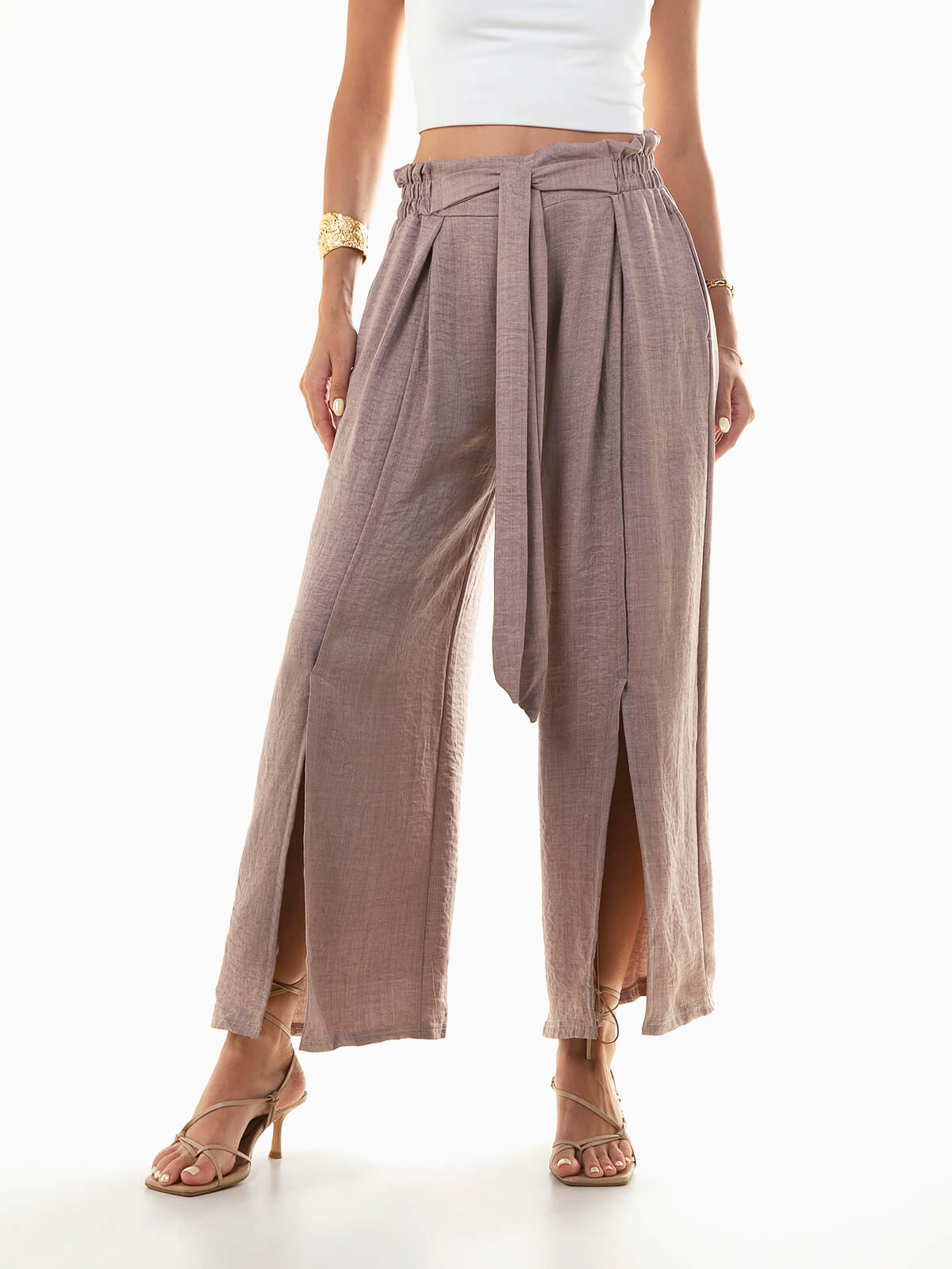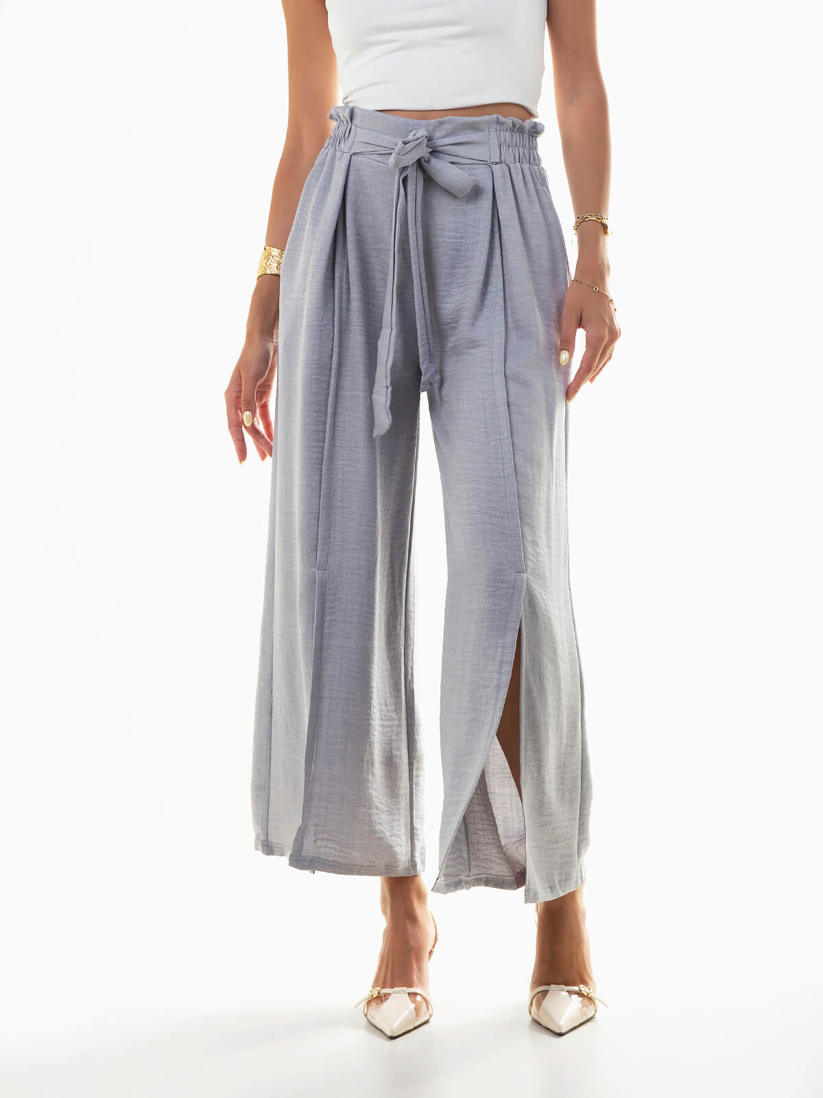 Calças fluídas de cintura alta paperbag com tecido para laço. Calças para mulher com aberturas à frente que acrescentam movimento e elegância, proporcionando conforto e estilo em qualquer ocasião.