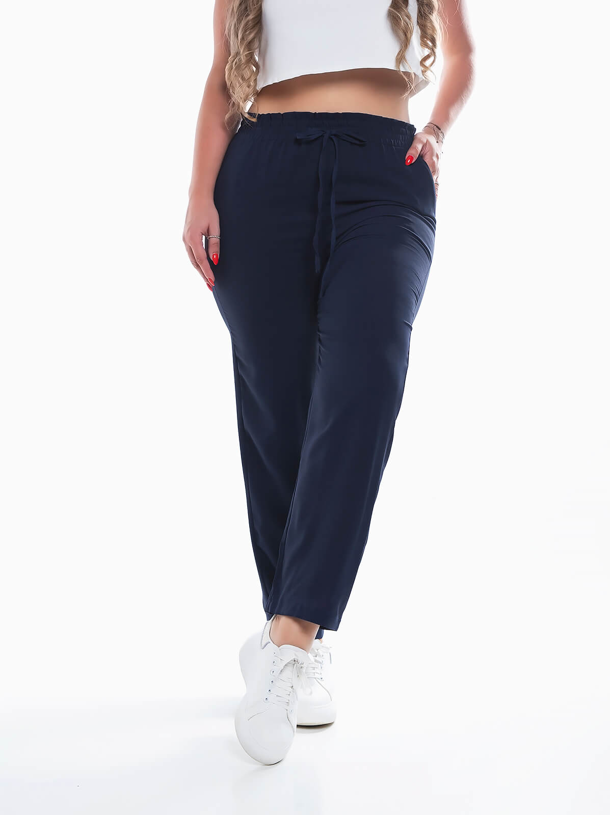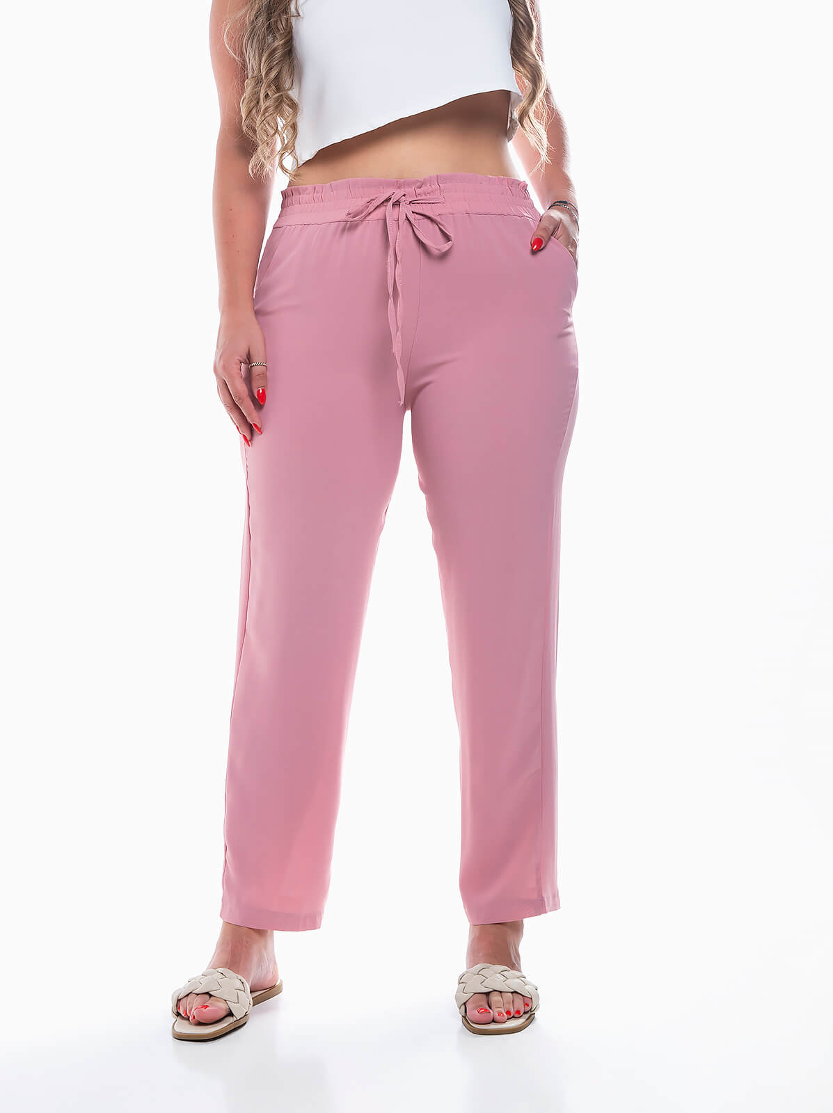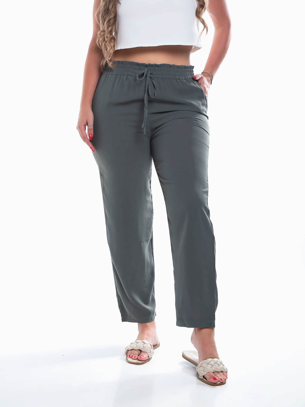 Calças fluídas de cintura alta elástica para senhora. Calças com cordão aplicado para ajustar. Perna reta. 2 bolsos.
