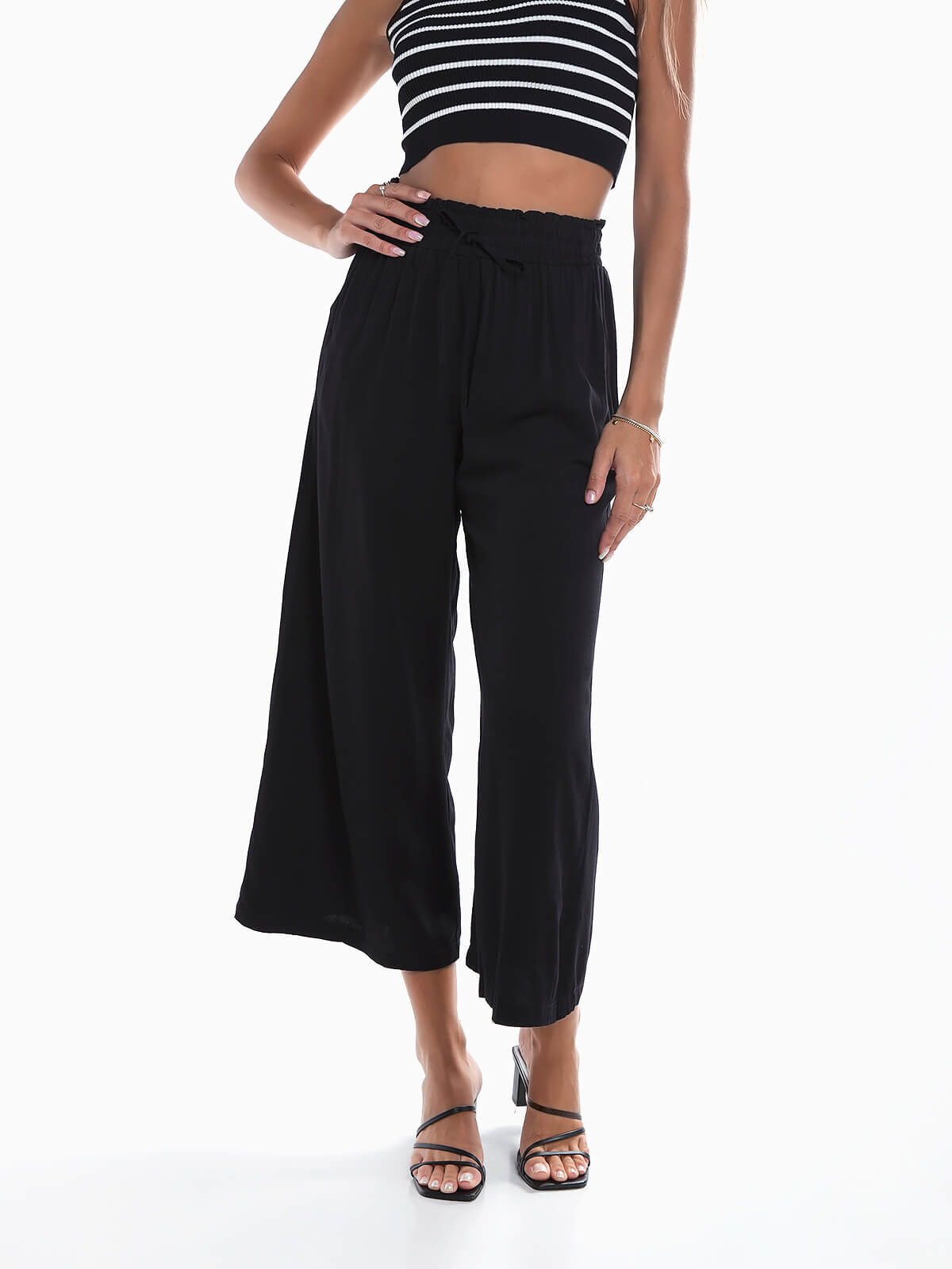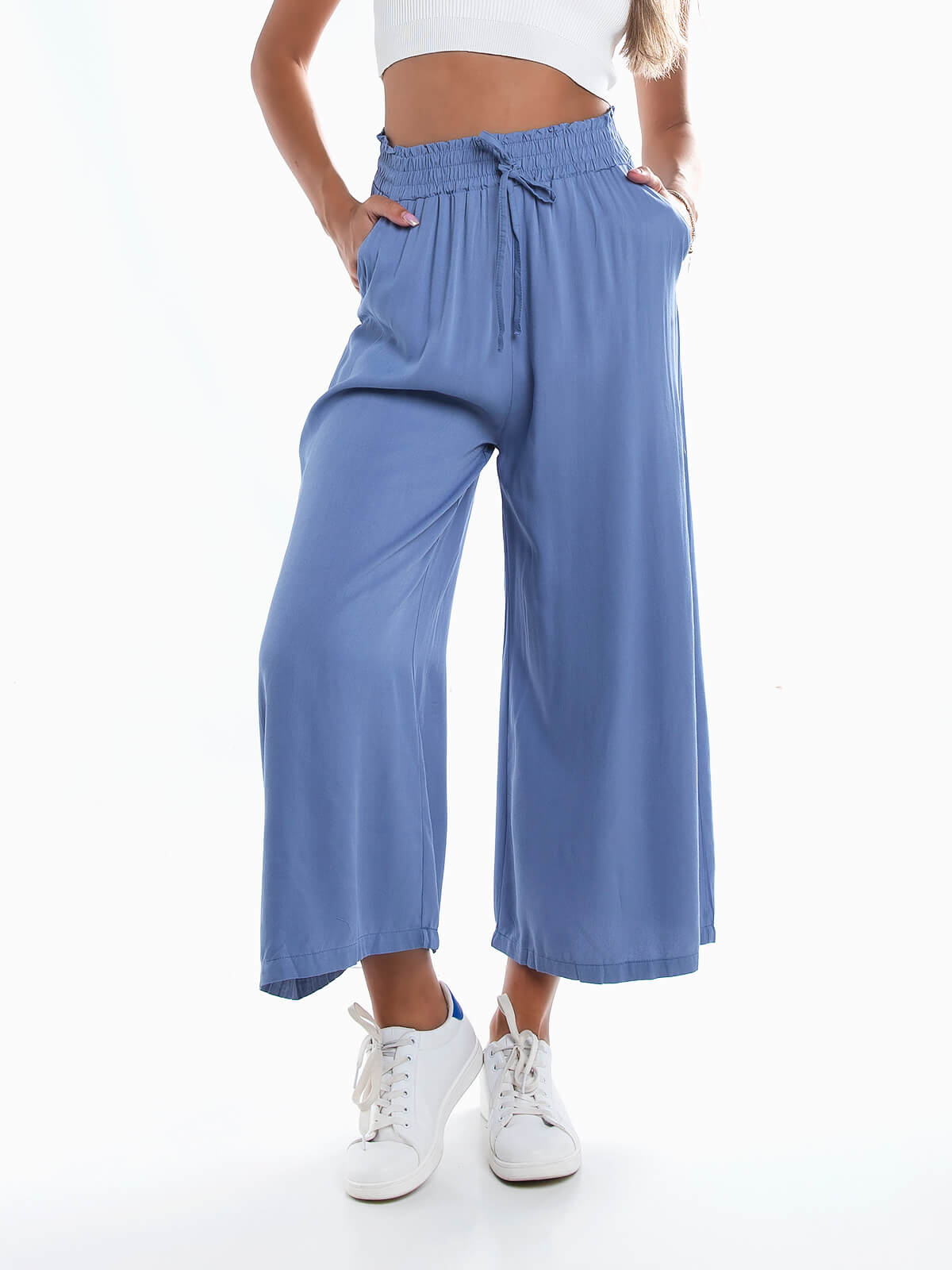 Calças fluídas com cintura alta franzida e cordão para laço. Calças crop em tecido 100% algodão com 2 bolsos laterais.