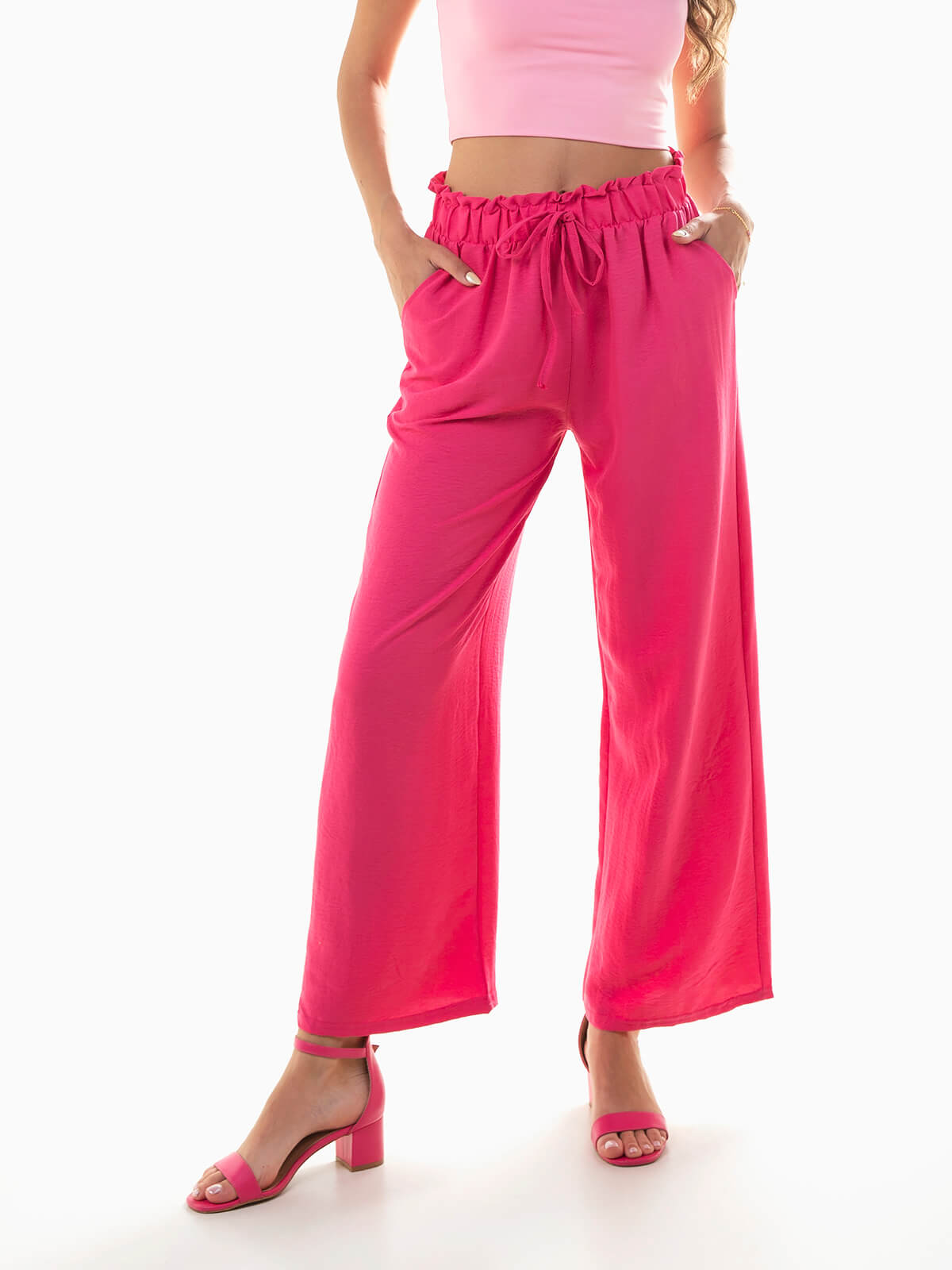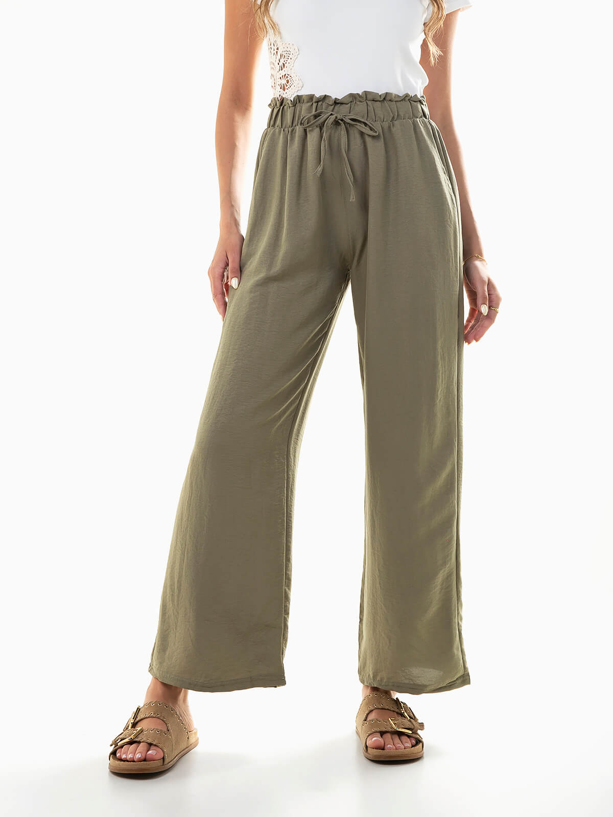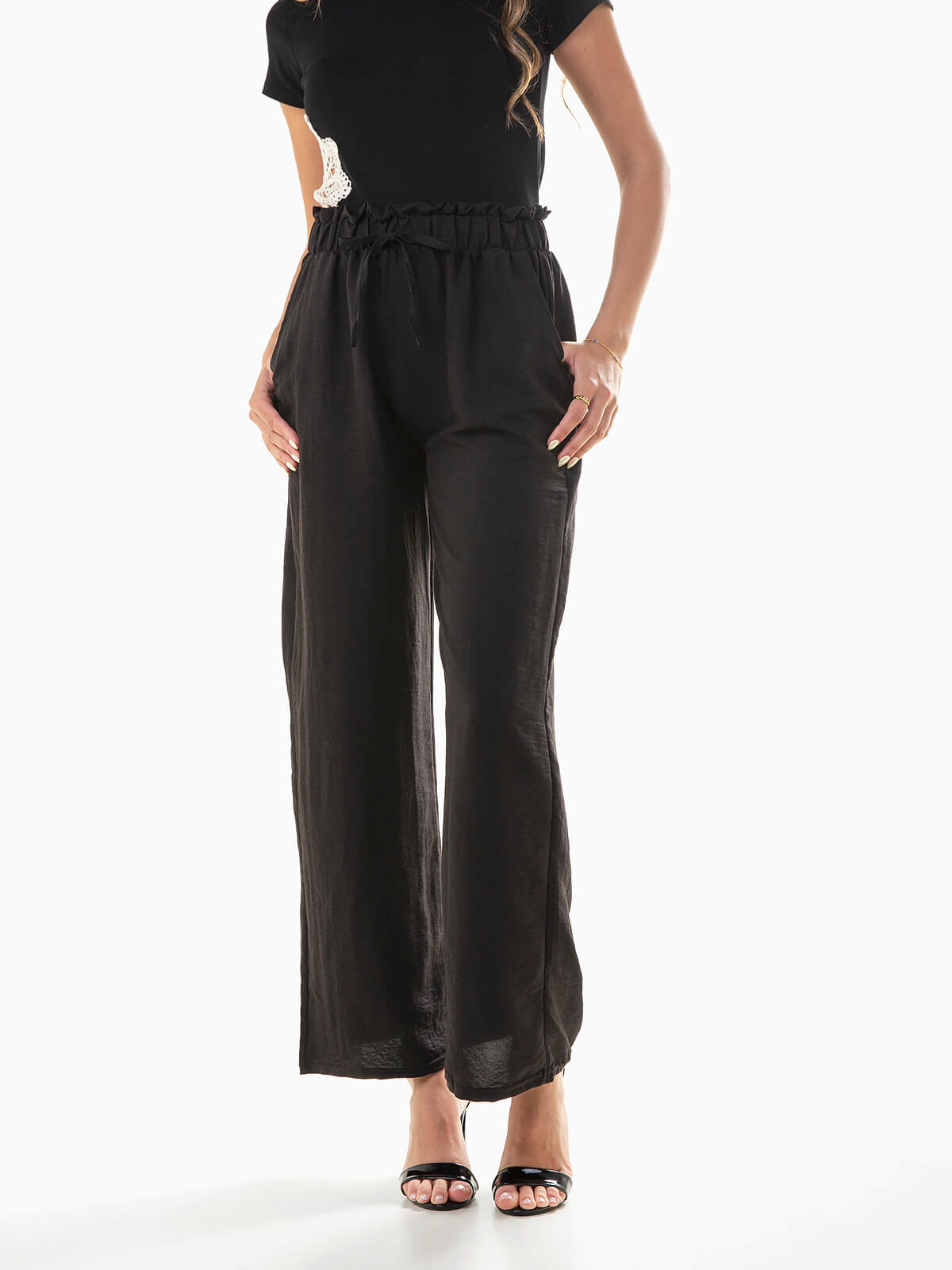 Calças fluídas com cintura alta paperbag e cordão para laço. Calças para mulher com 2 bolsos laterais.