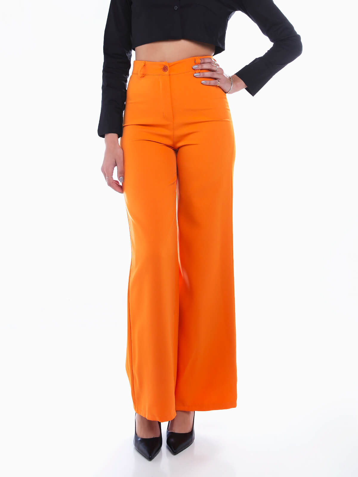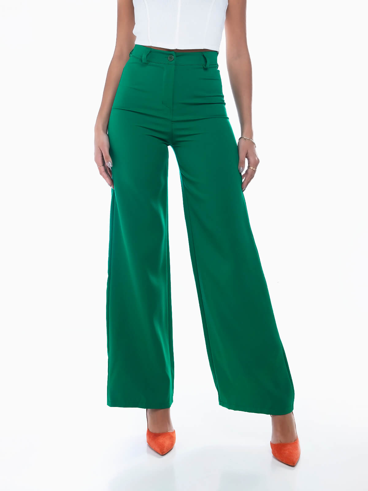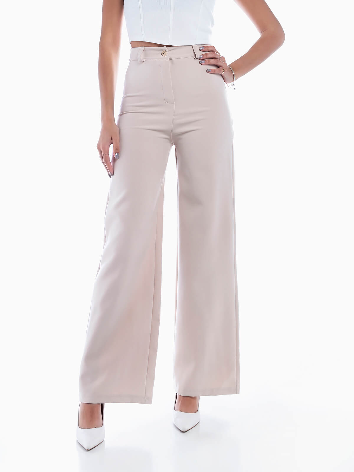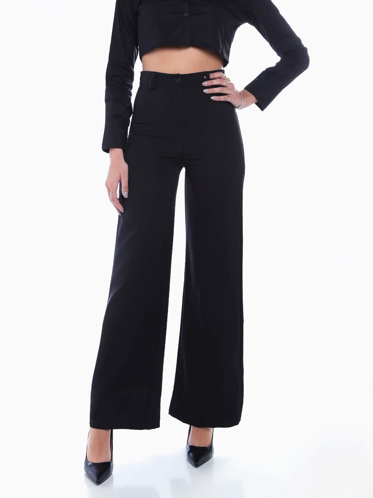 Calças fluídas clássicas para senhora. Calças wide leg com cintura alta. Aperto de fecho éclair e botão.