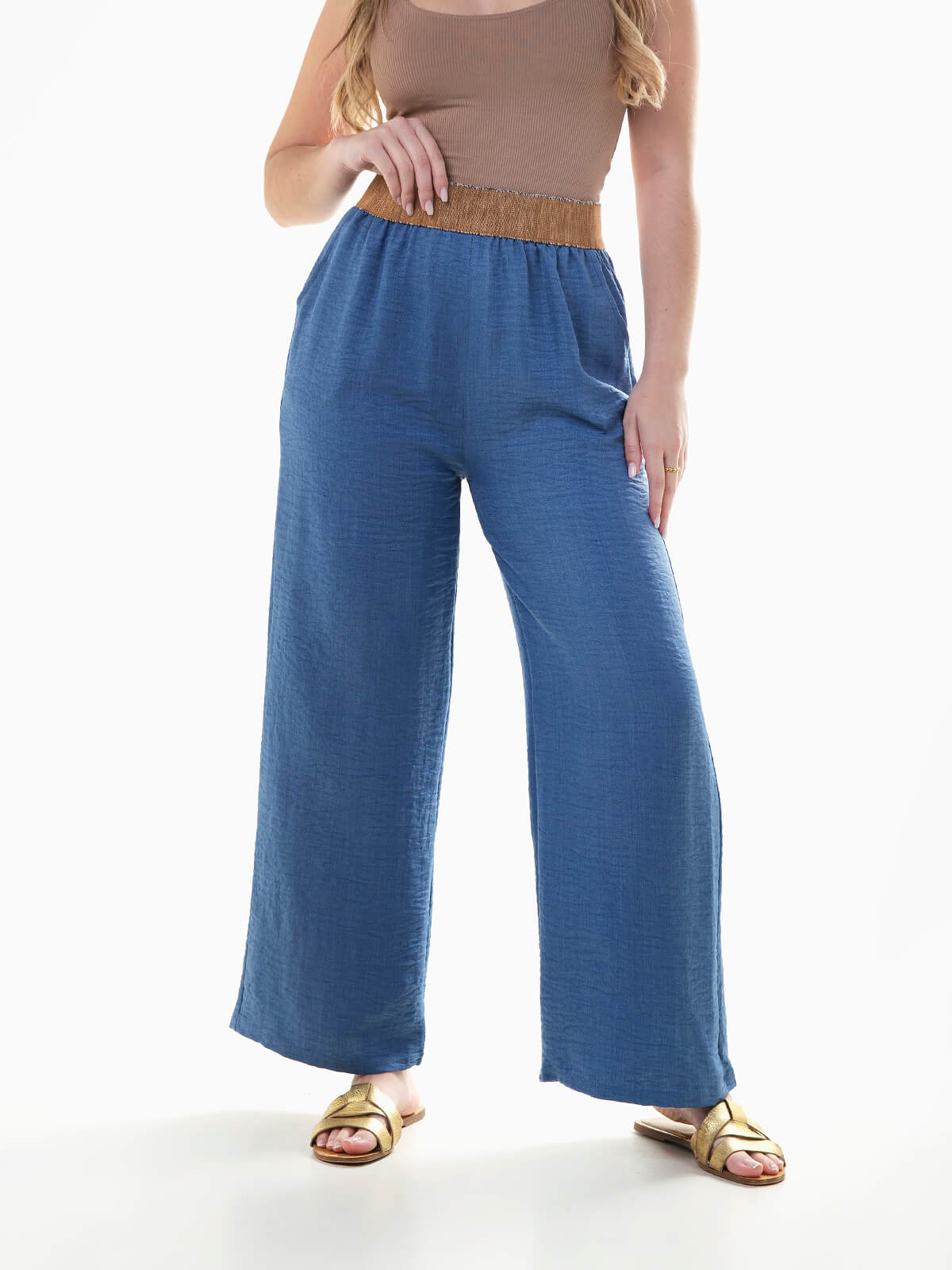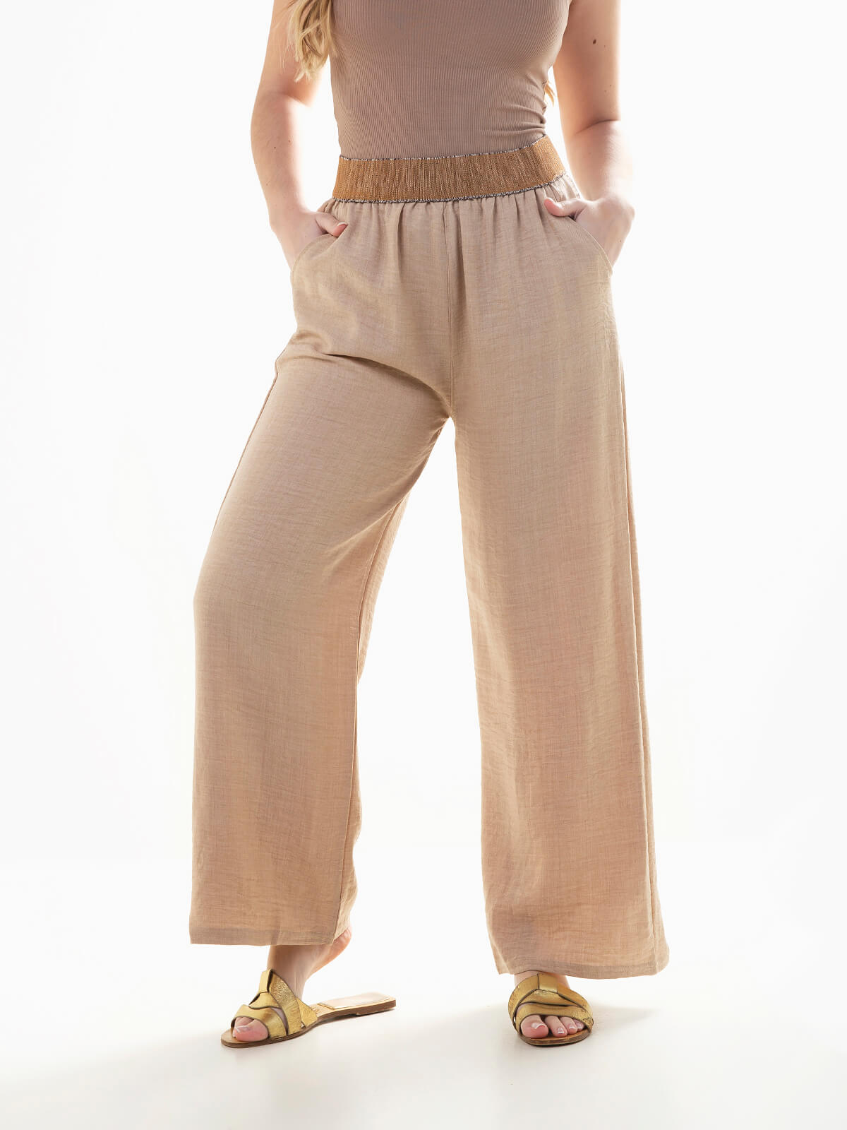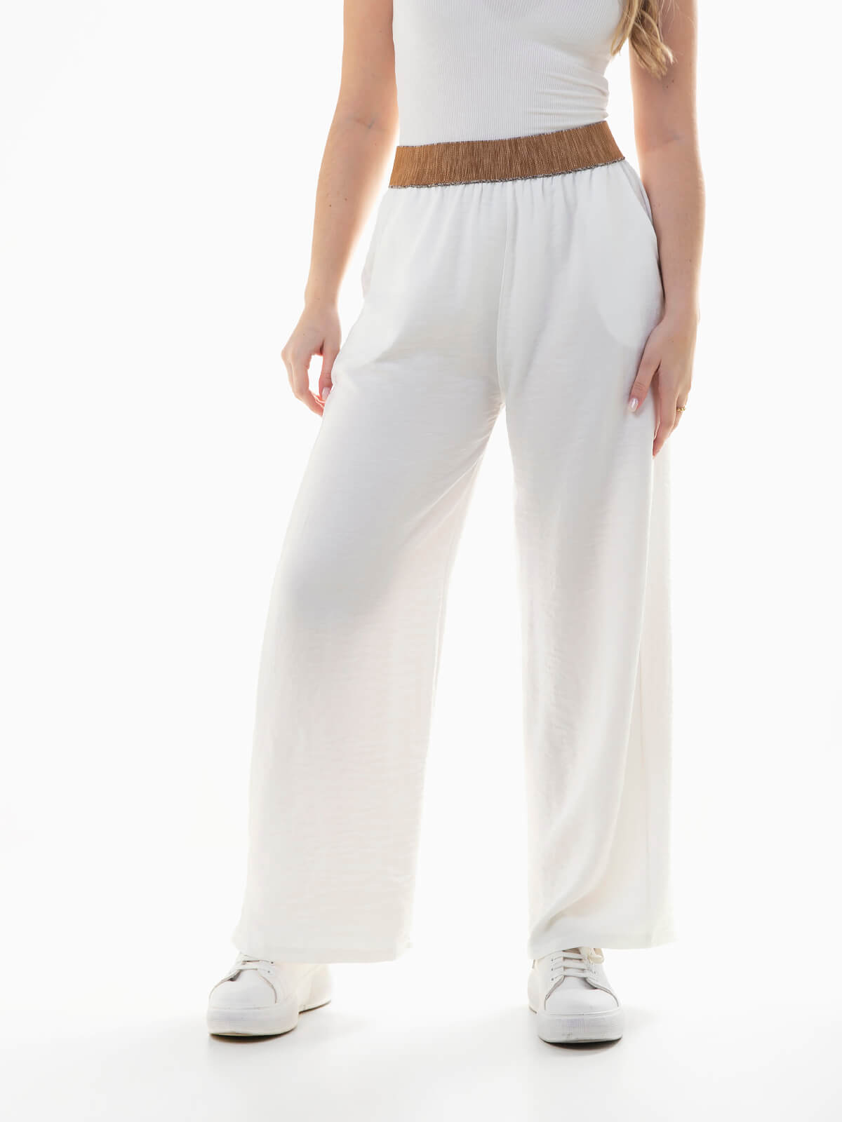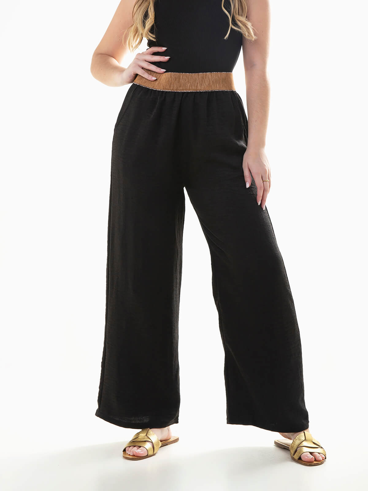 Calças fluídas com cintura alta elástica texturizada com pormenores brilhantes. Calças para mulher com 2 bolsos laterais.