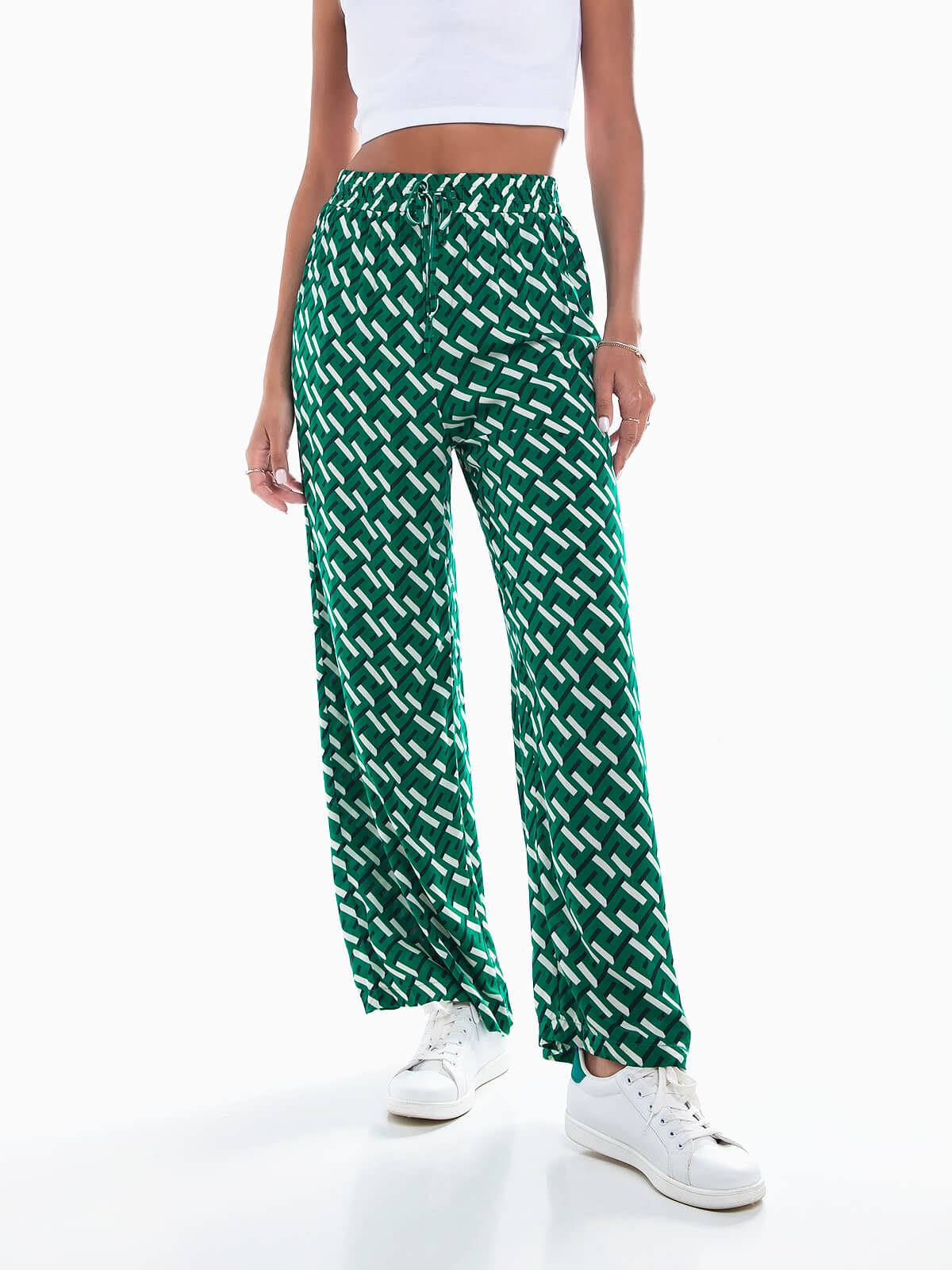 Calças fluídas com estampado geométrico. Calças largas de cintura alta elástica com cordão para laço. 2 bolsos.