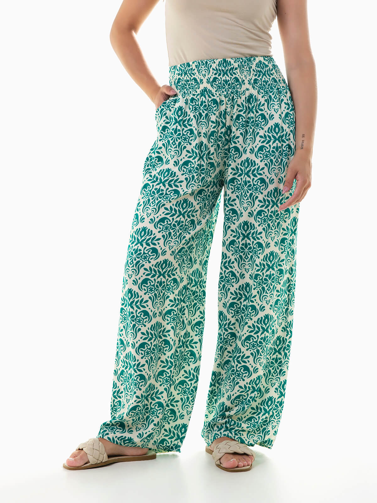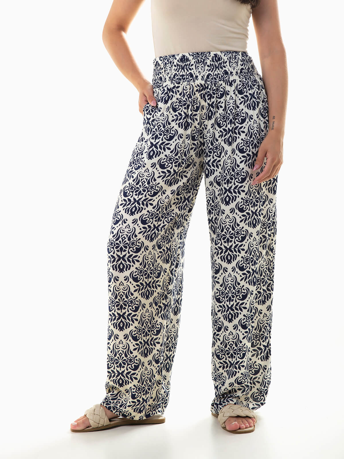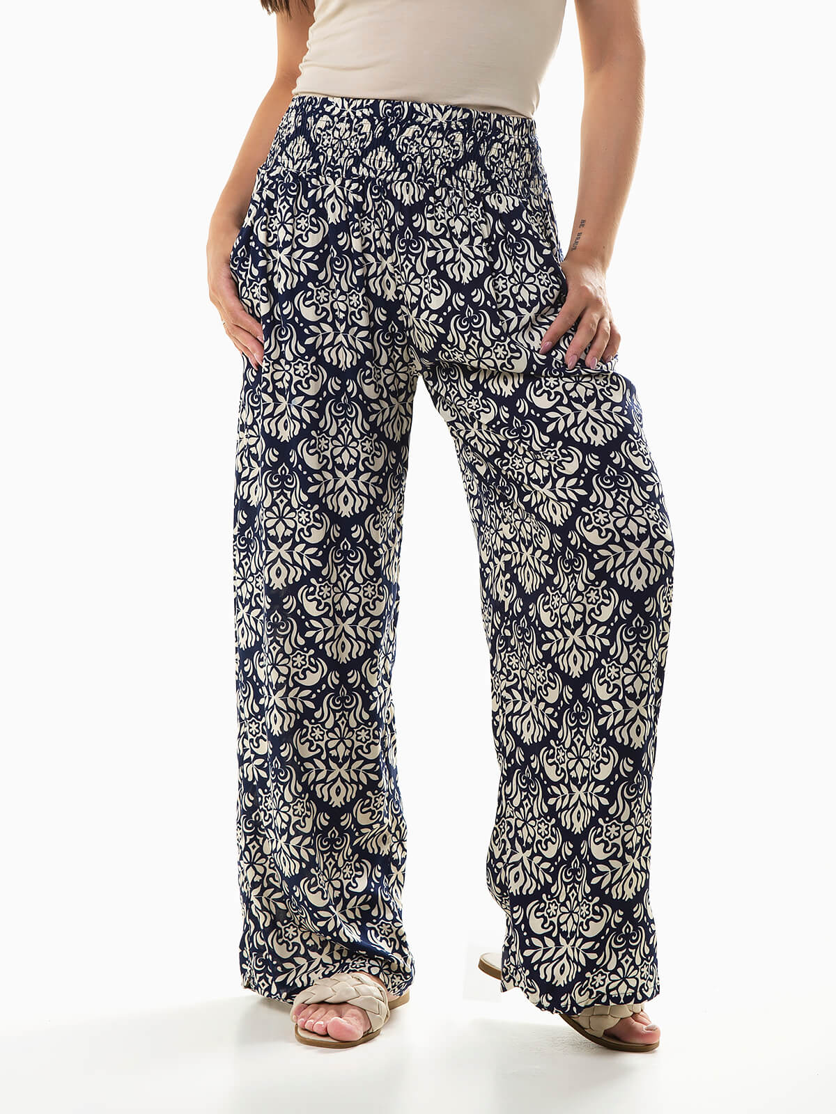 Calças fluídas com estampado étnico para senhora. Calças largas com cintura alta elástica com 2 bolsos.