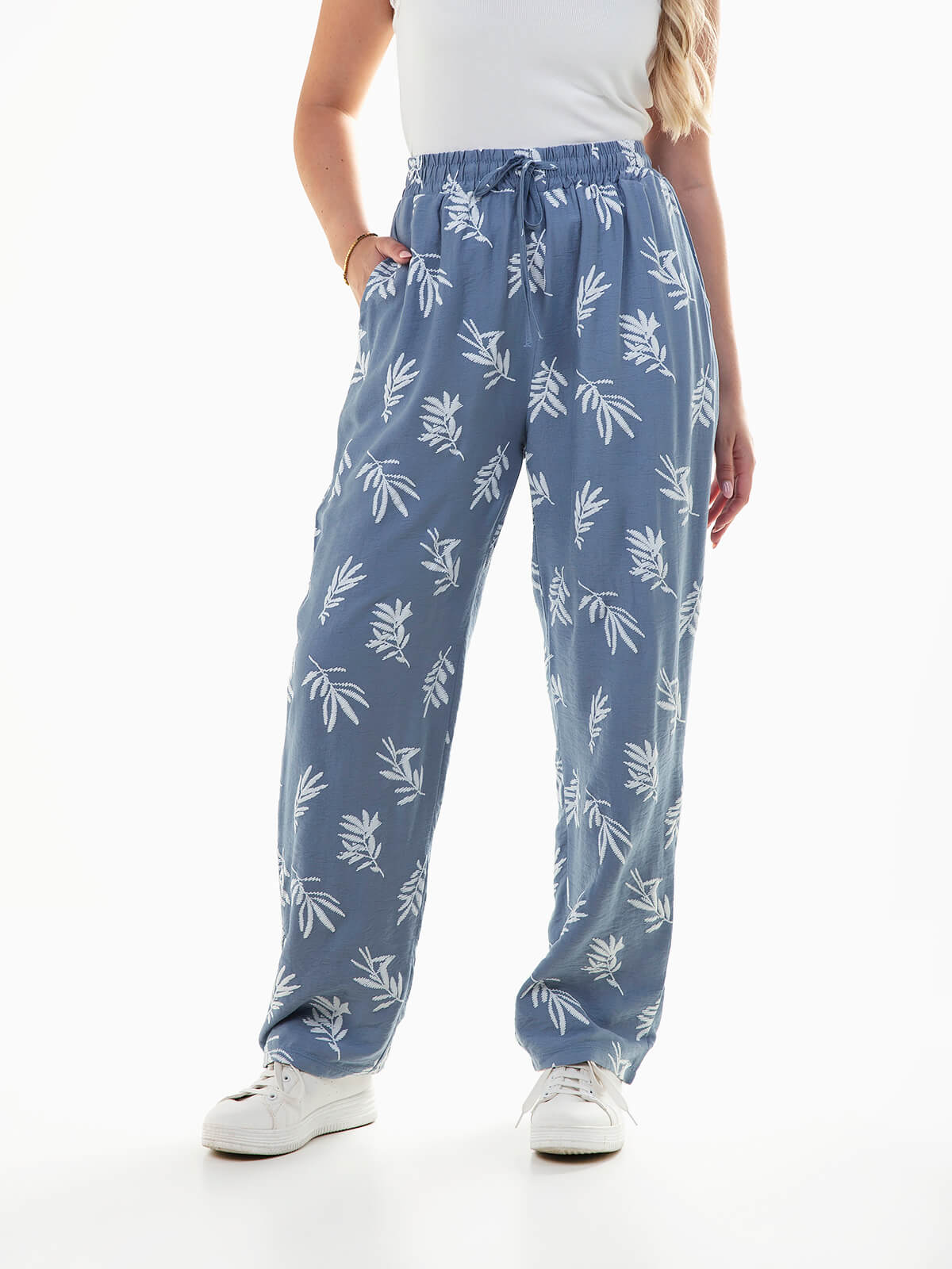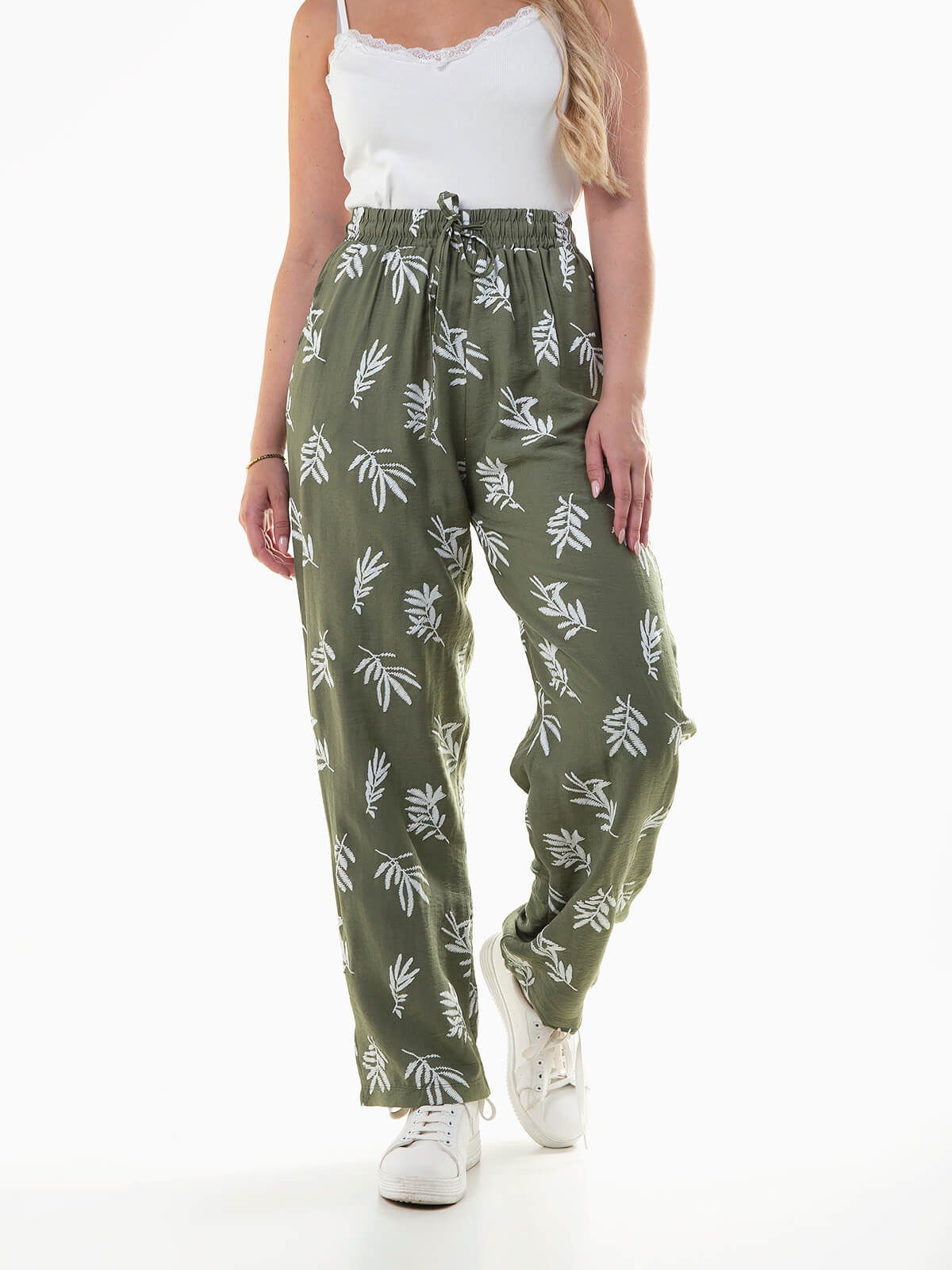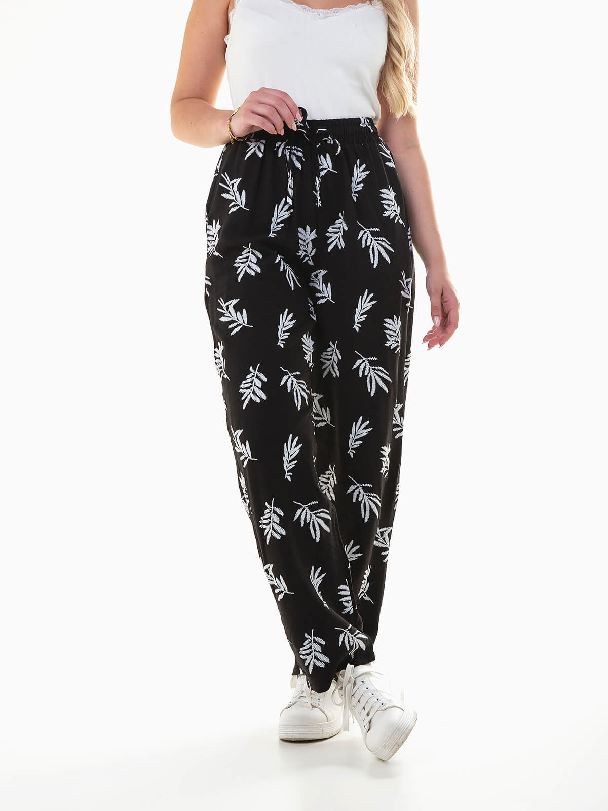 Calças fluídas com estampado folhas em contraste. Calças de cintura alta elástica com cordão para ajustar. 2 bolsos.