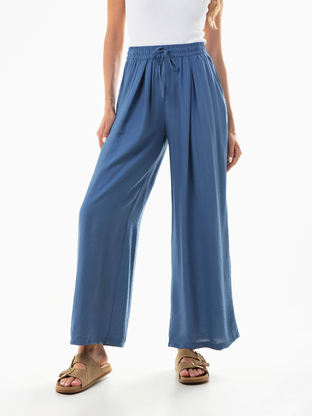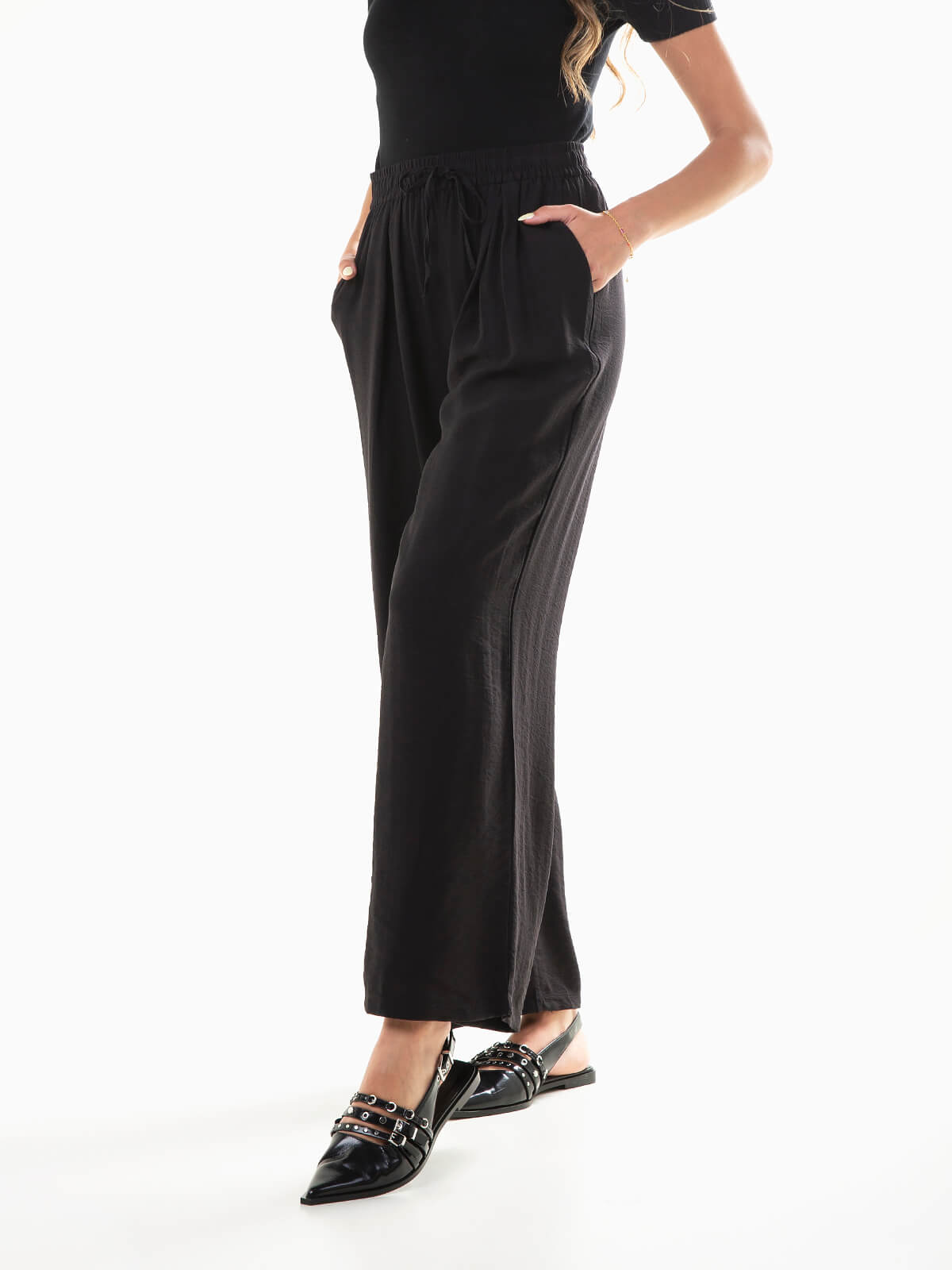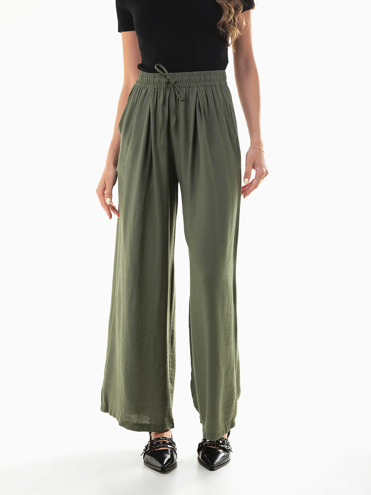 Calças fluídas com pormenor de pinças à frente. Calças largas de cintura alta elástico com cordão para laço. 2 bolsos.